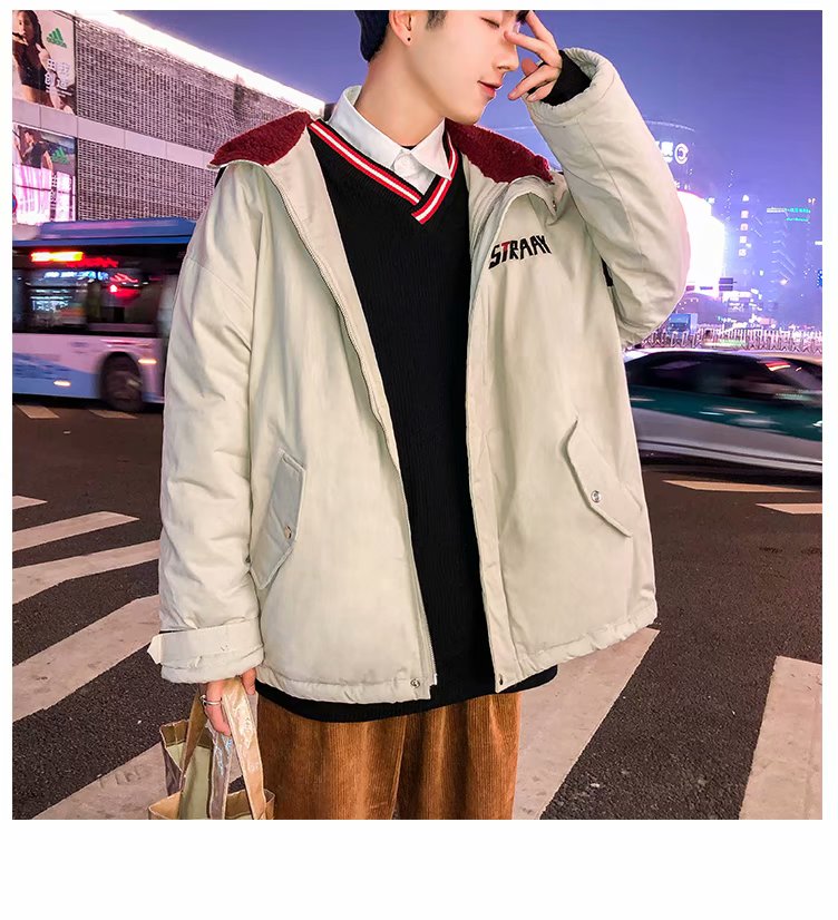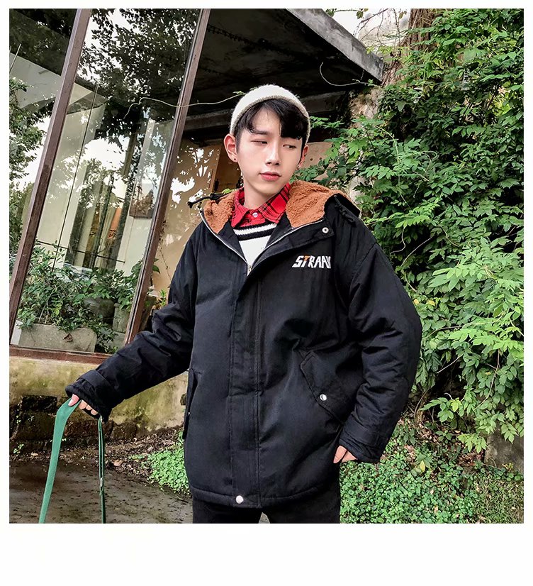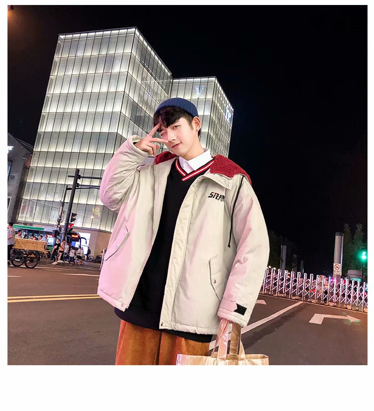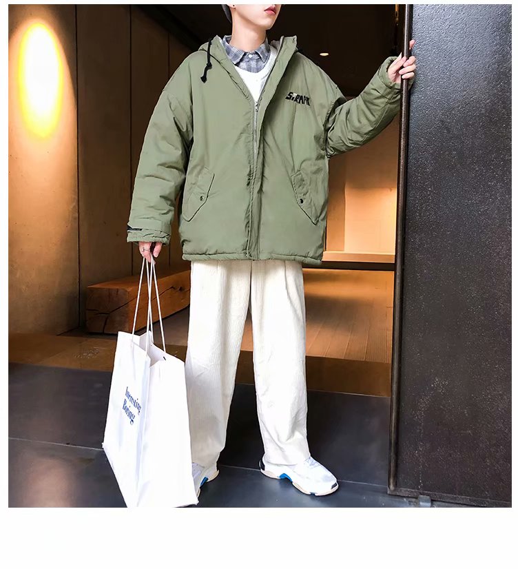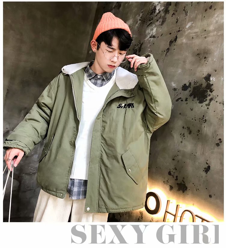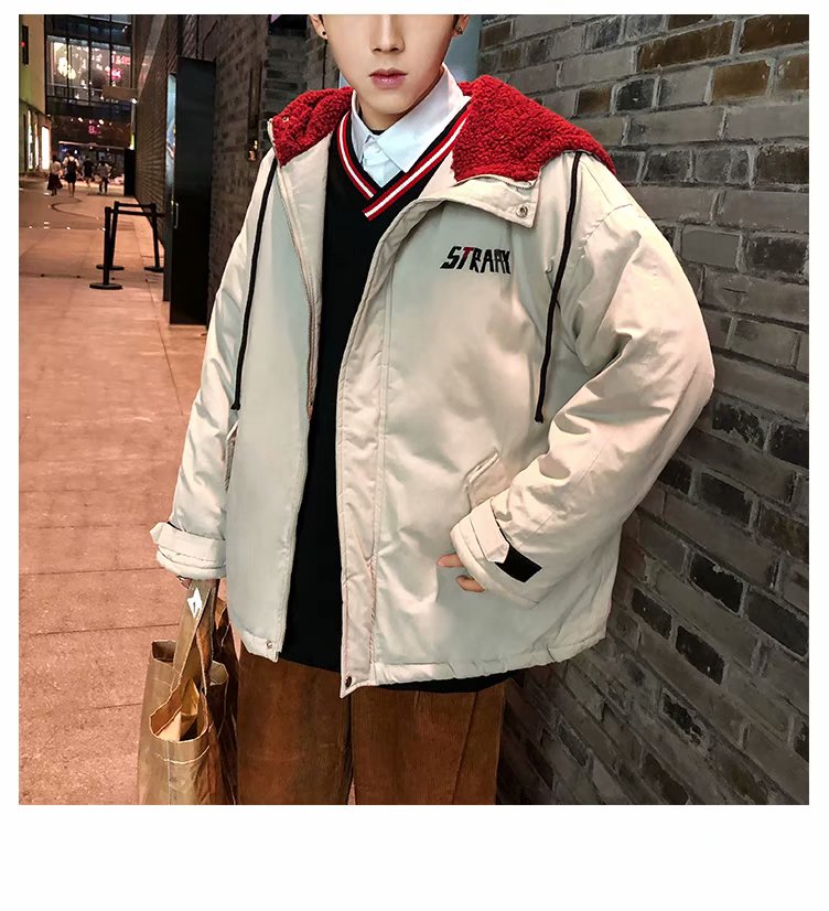 冬季港风chic羊羔毛刺绣字母外套男士韩版潮流学生连帽加厚棉衣男