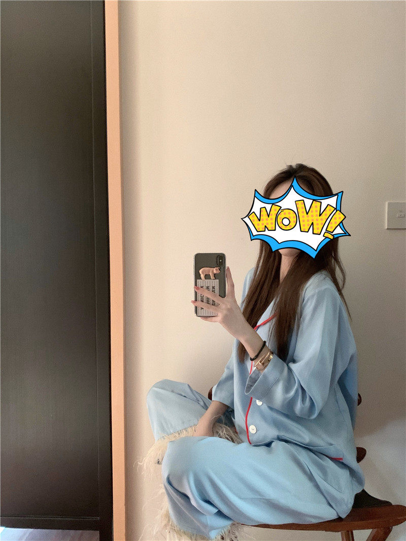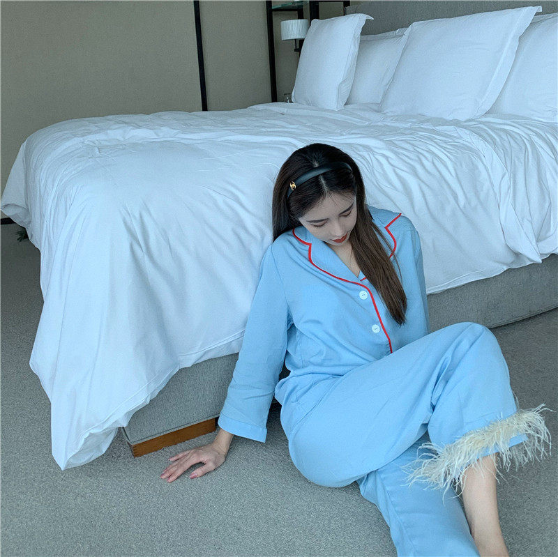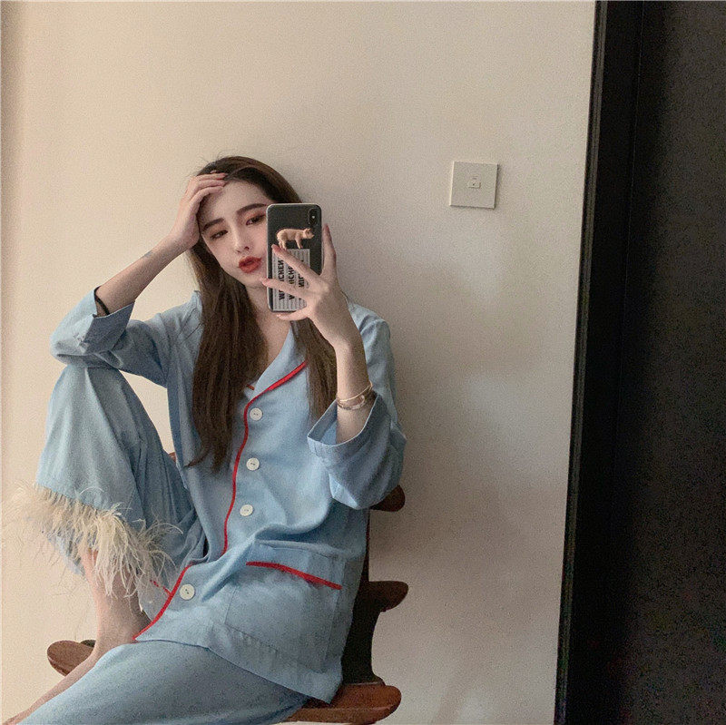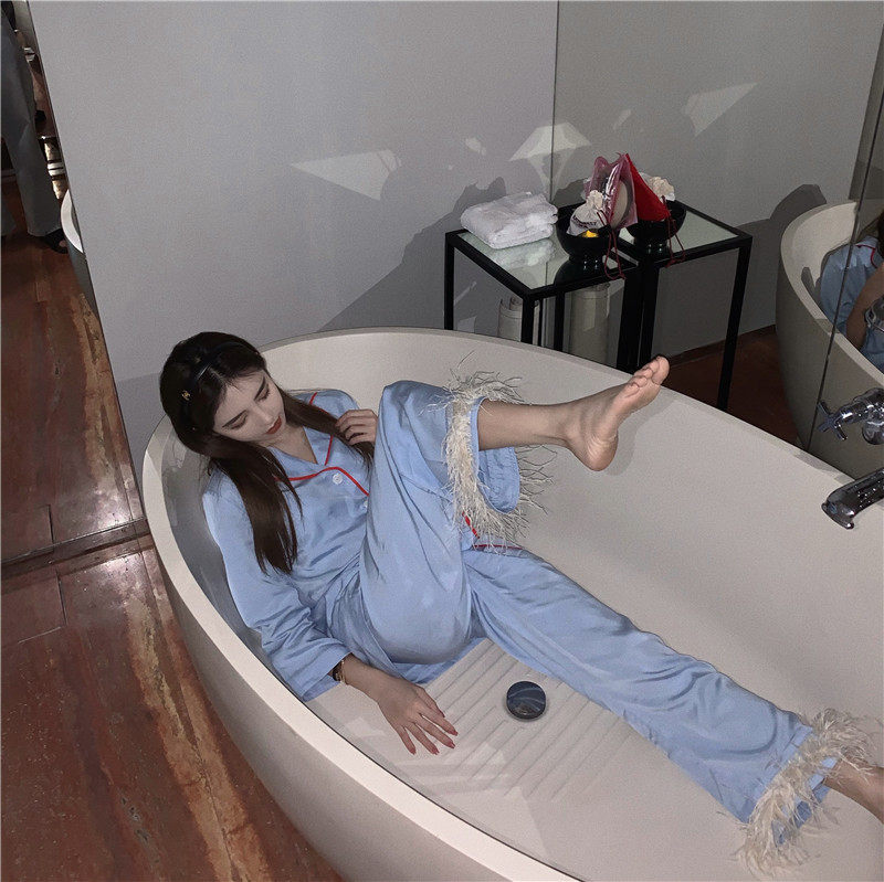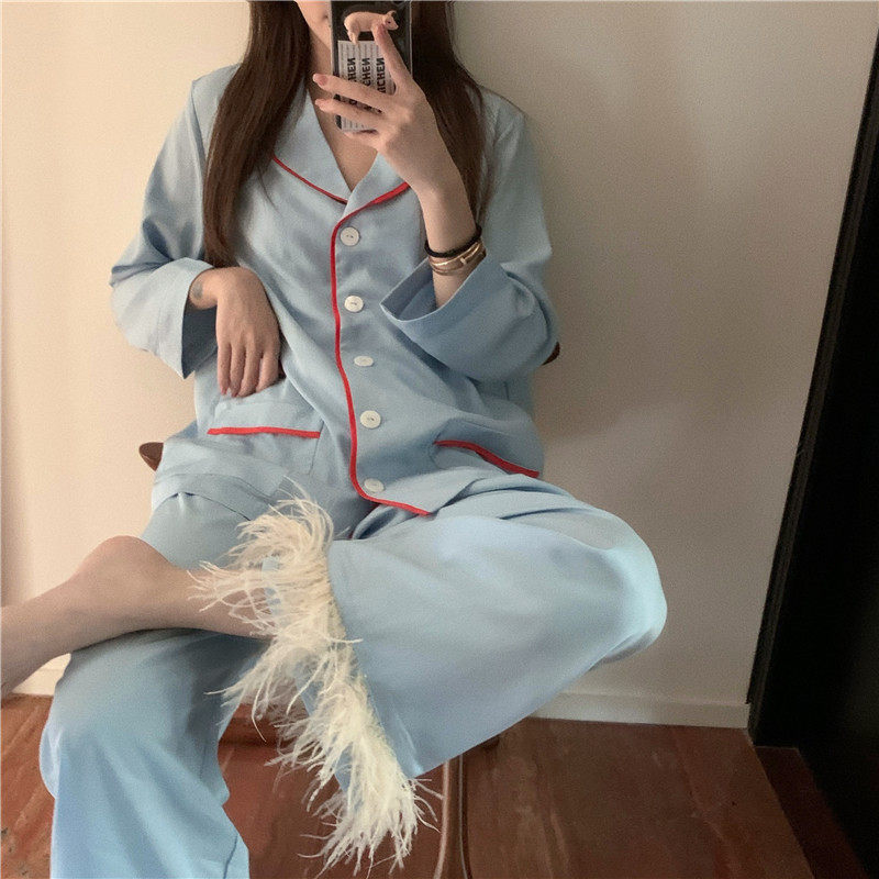 实拍实价 宝宝蓝鸵鸟毛毛两件套长袖睡衣套装家居服女