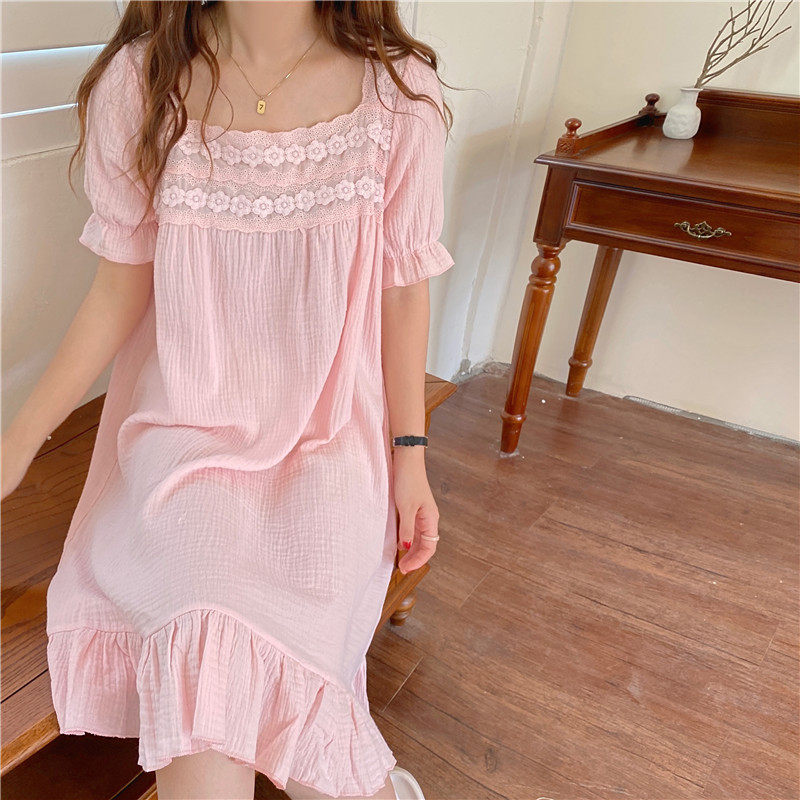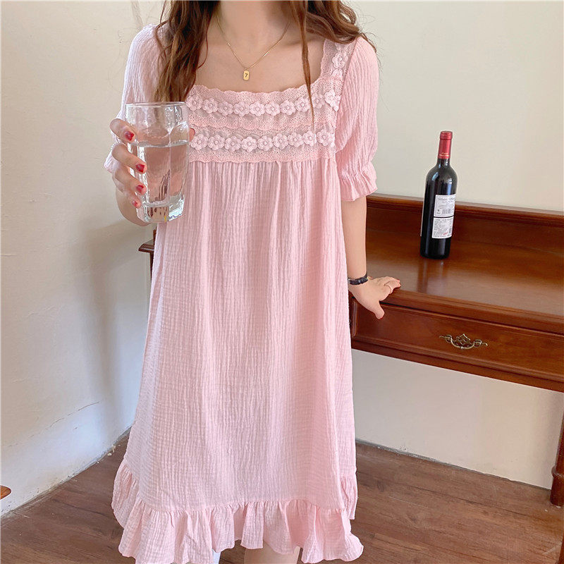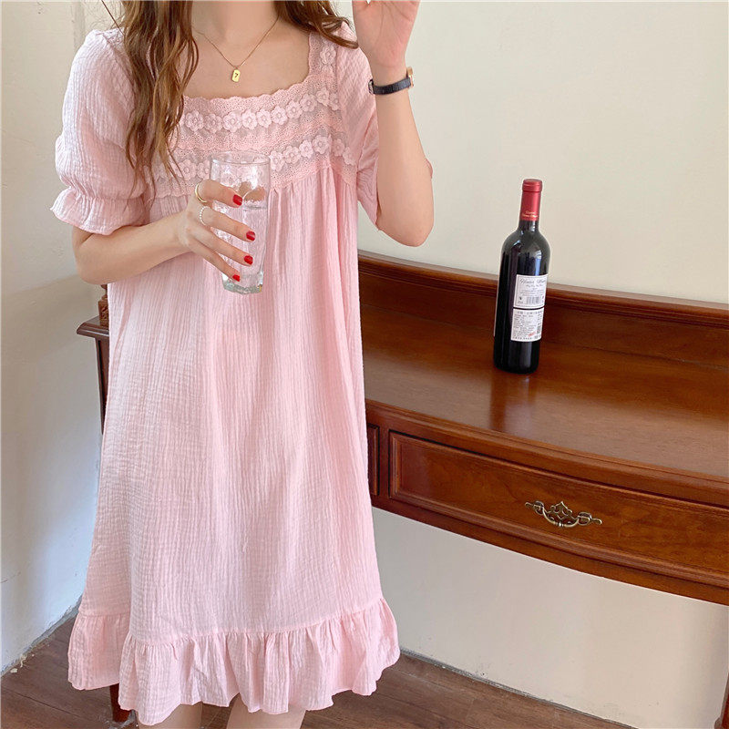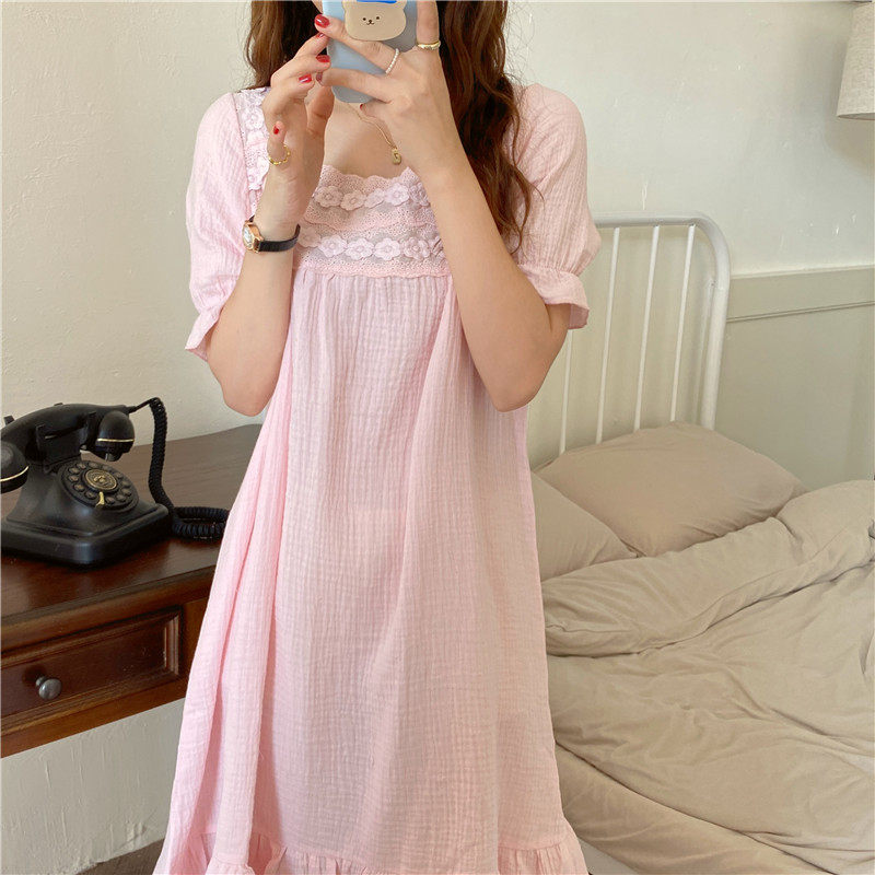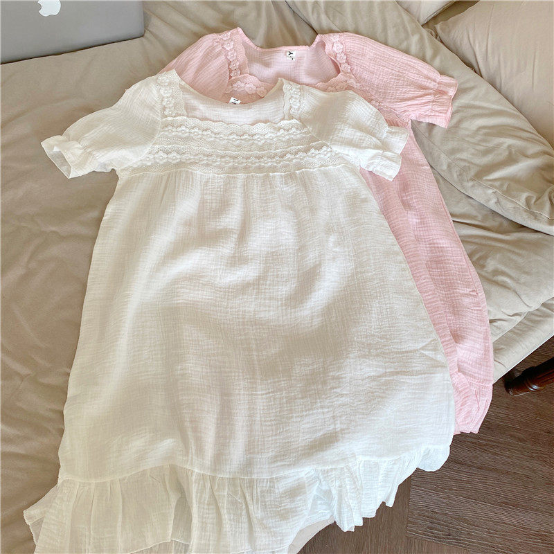 实拍睡裙短袖夏季全棉薄款甜美花边公主风可爱宫廷风睡衣