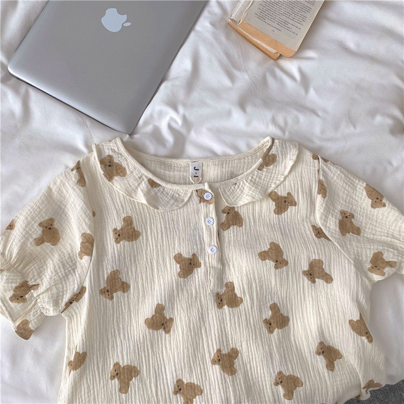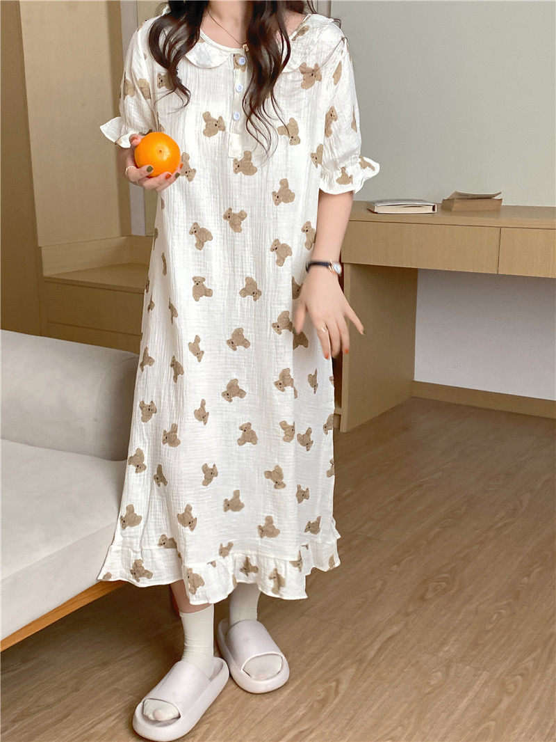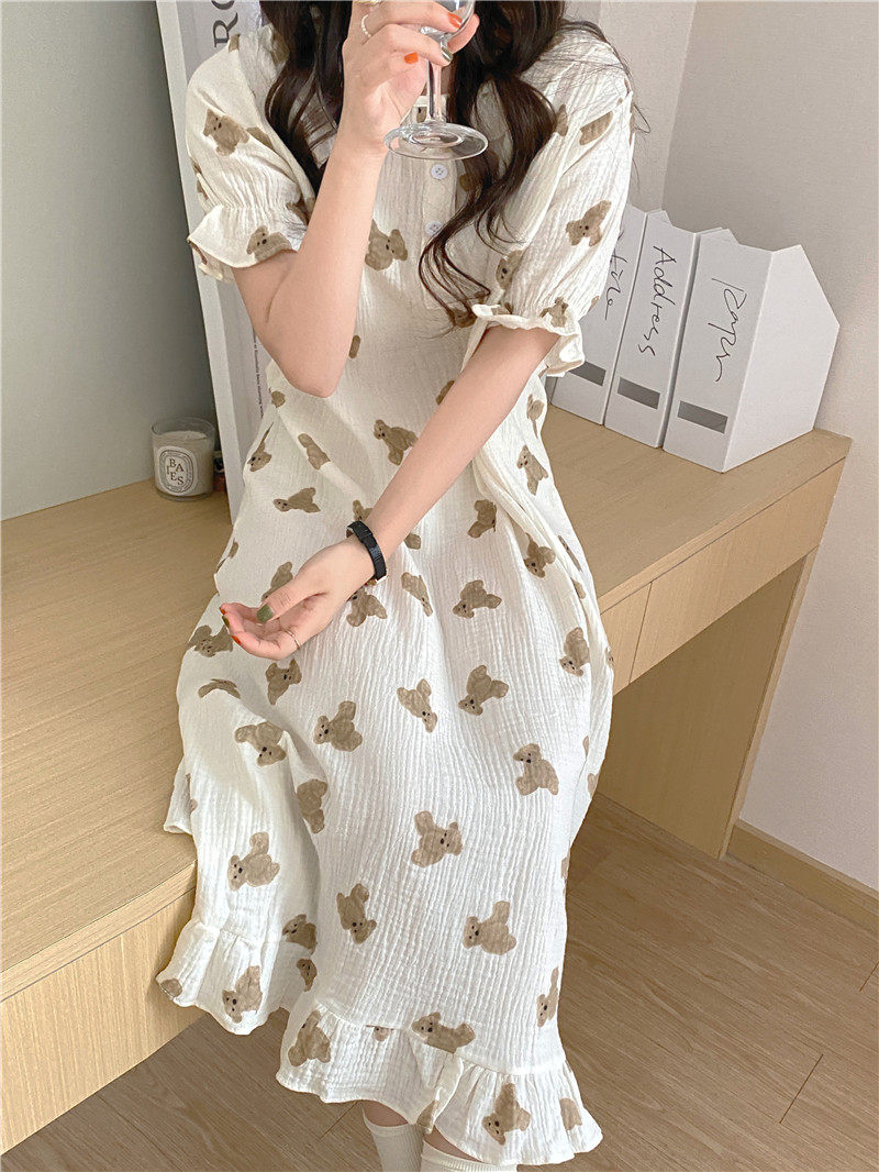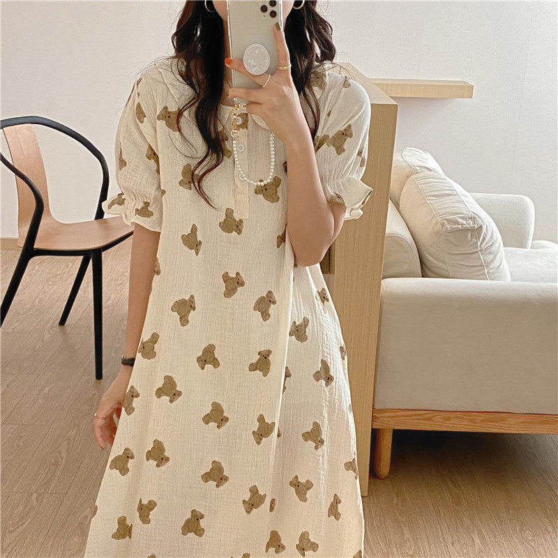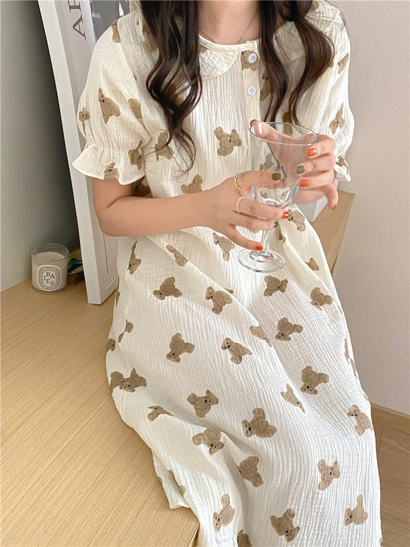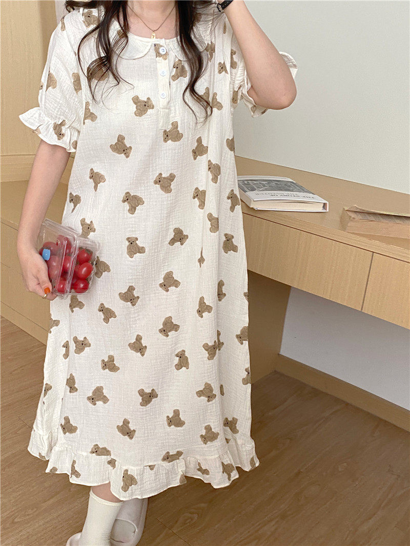 实拍短袖睡裙女夏可爱日系卡通小熊ins印花睡衣家居服