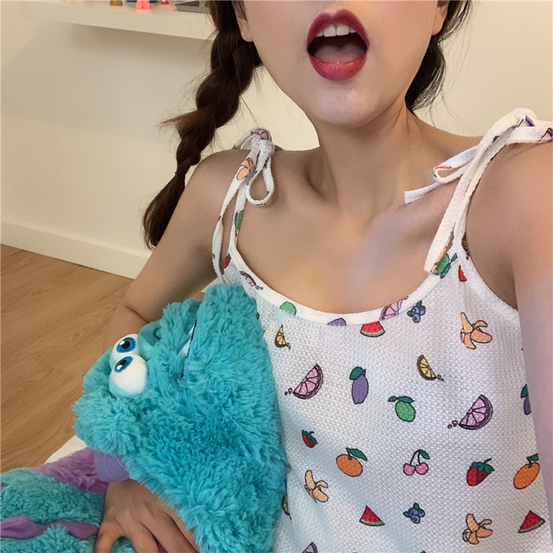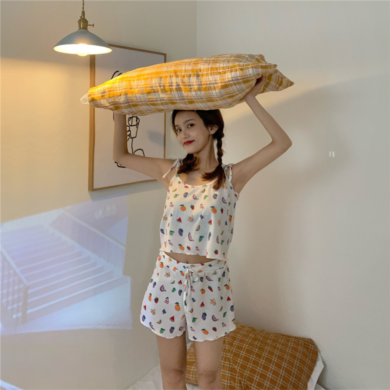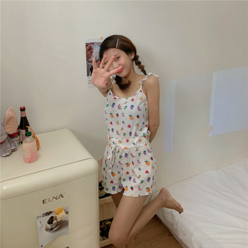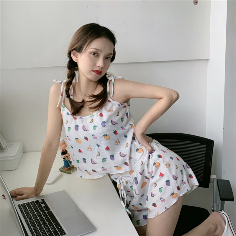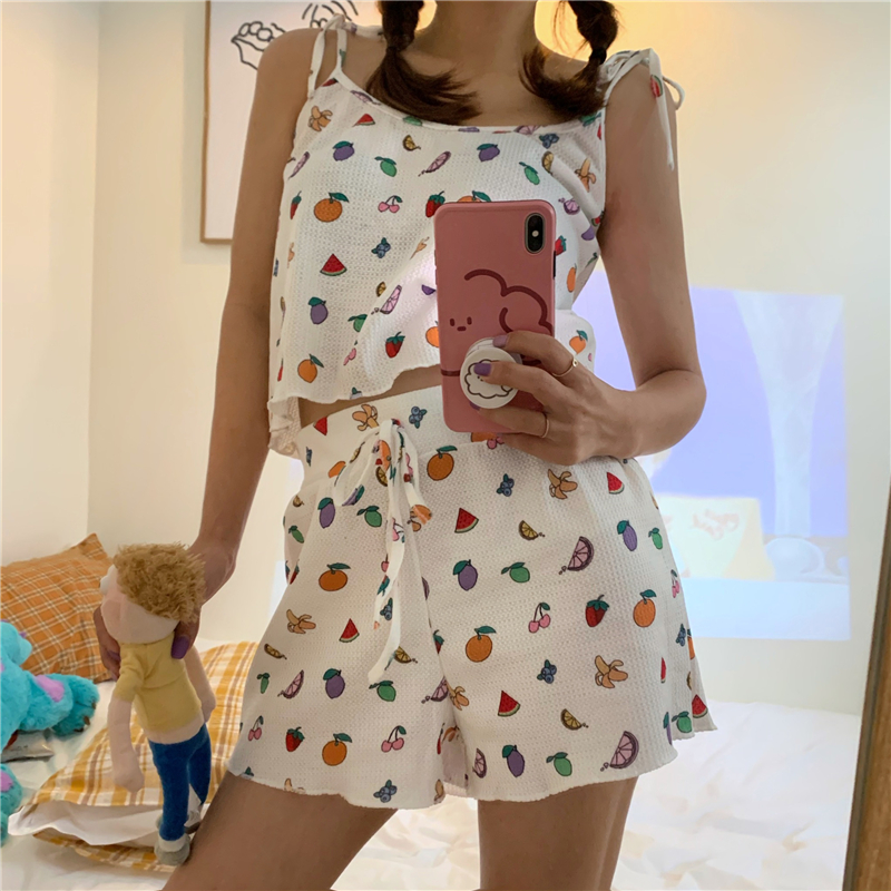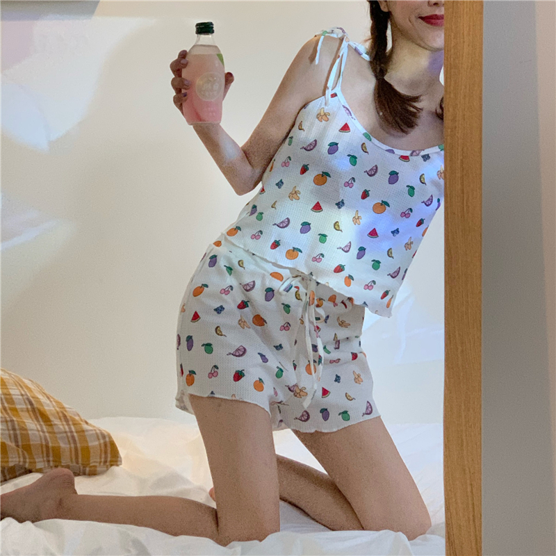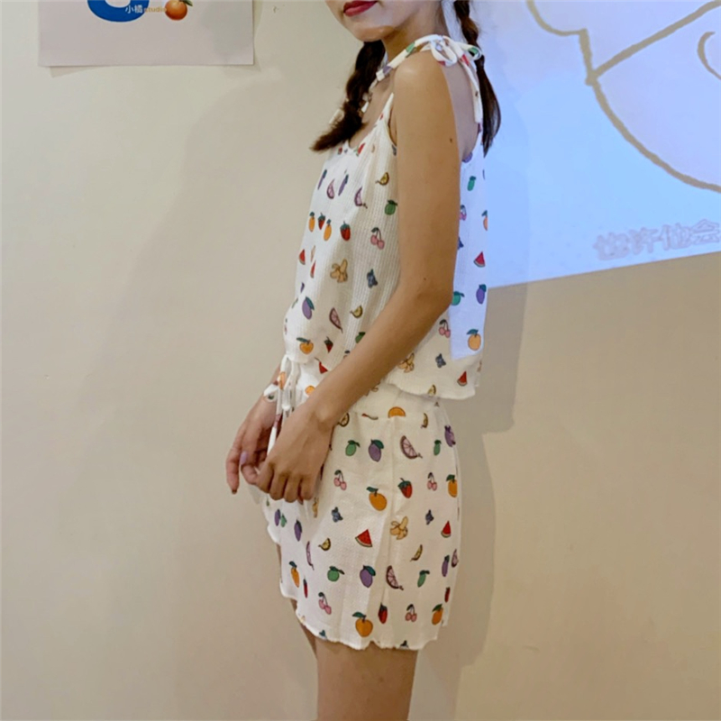 实拍实价 水果印花ins吊带绑带短裤家居服套装两件套