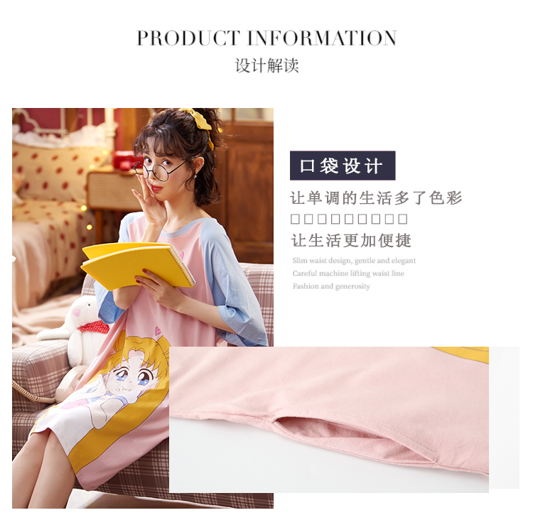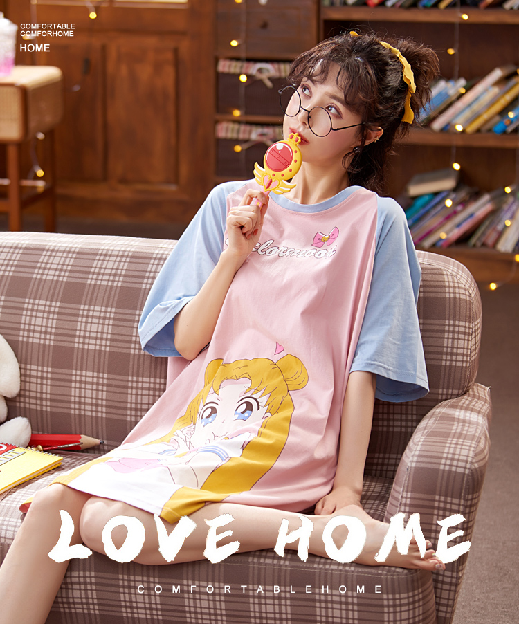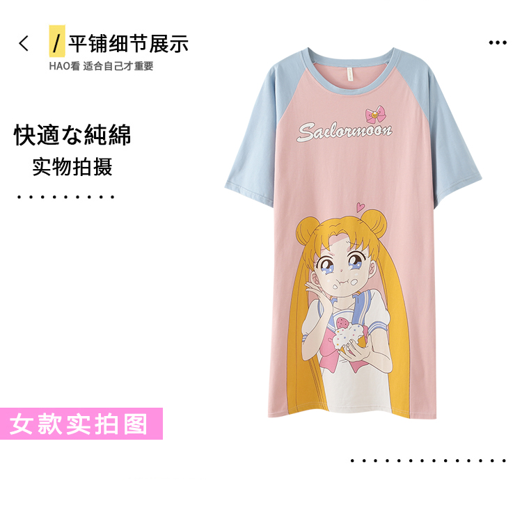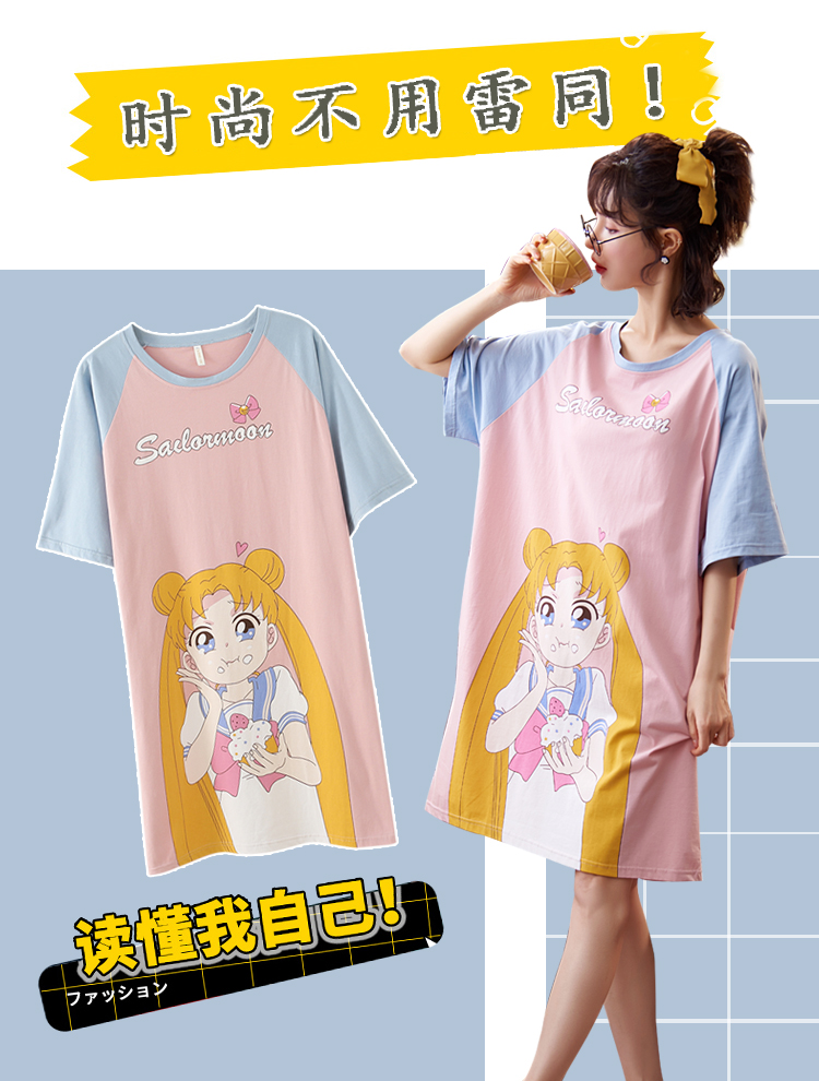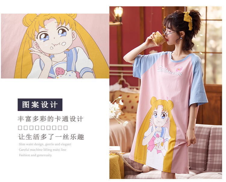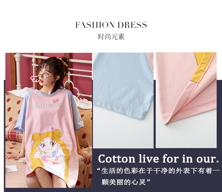 2021春夏季新款睡衣女裙套头短袖卡通印花休闲青年简约连体睡衣裙
