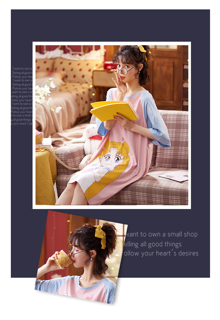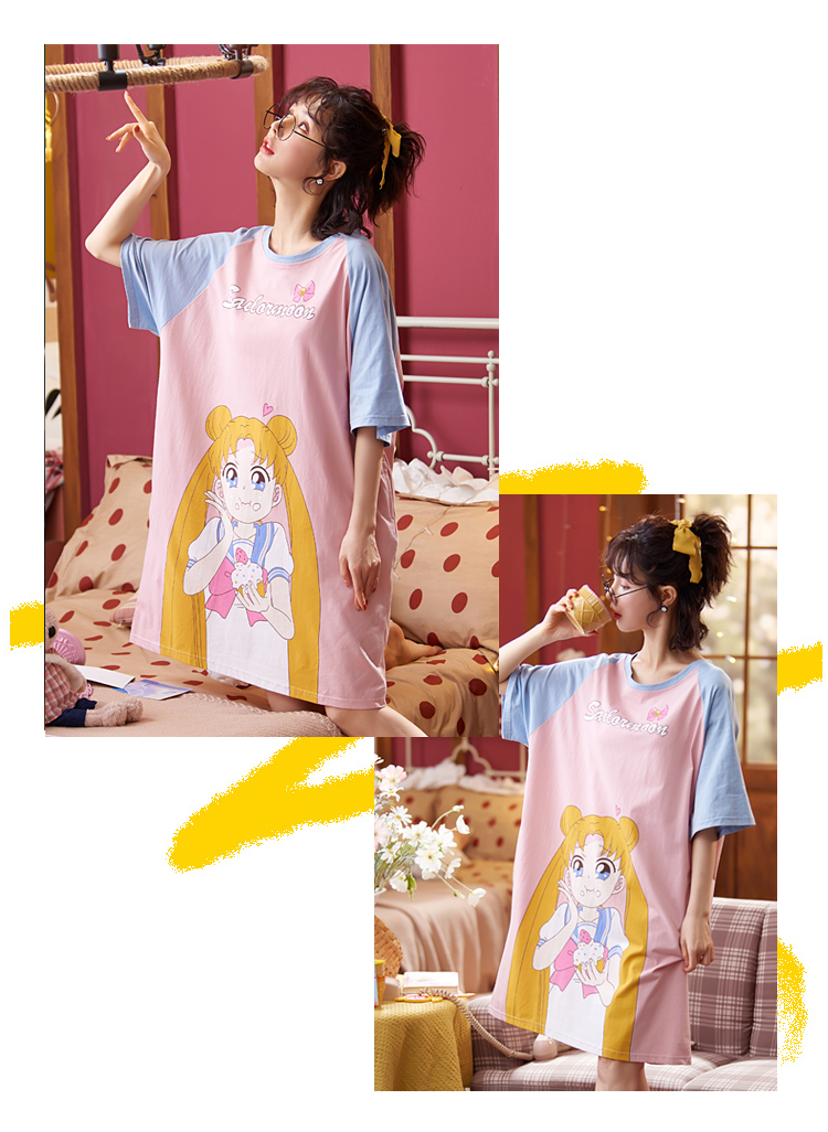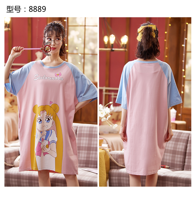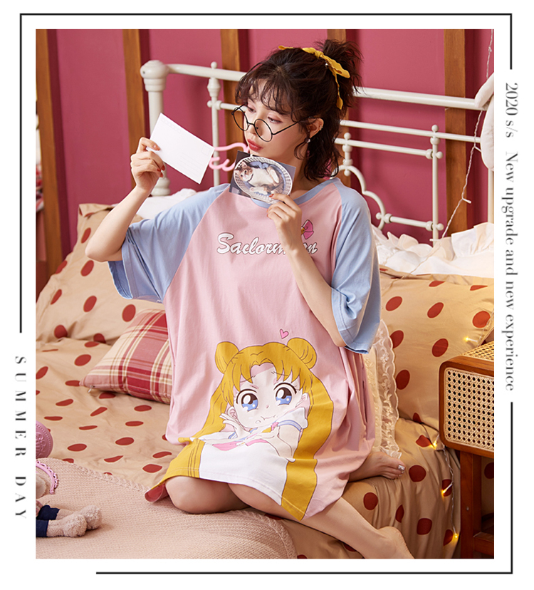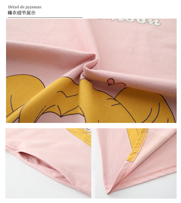 2021春夏季新款睡衣女裙套头短袖卡通印花休闲青年简约连体睡衣裙