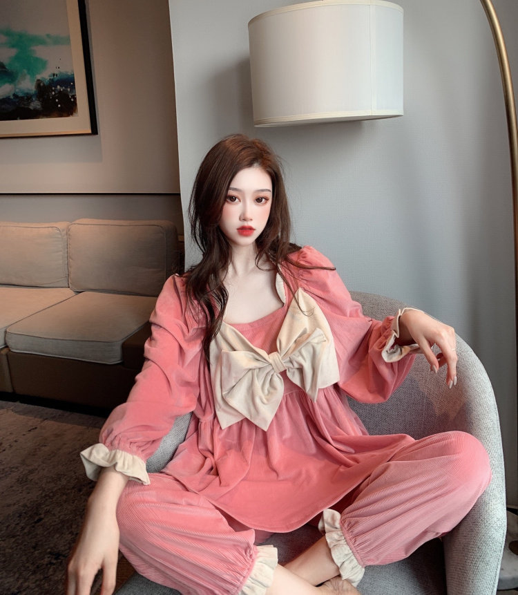实拍实价~丝绒甜美立体蝴蝶结可爱长袖睡衣洋气家居服套装