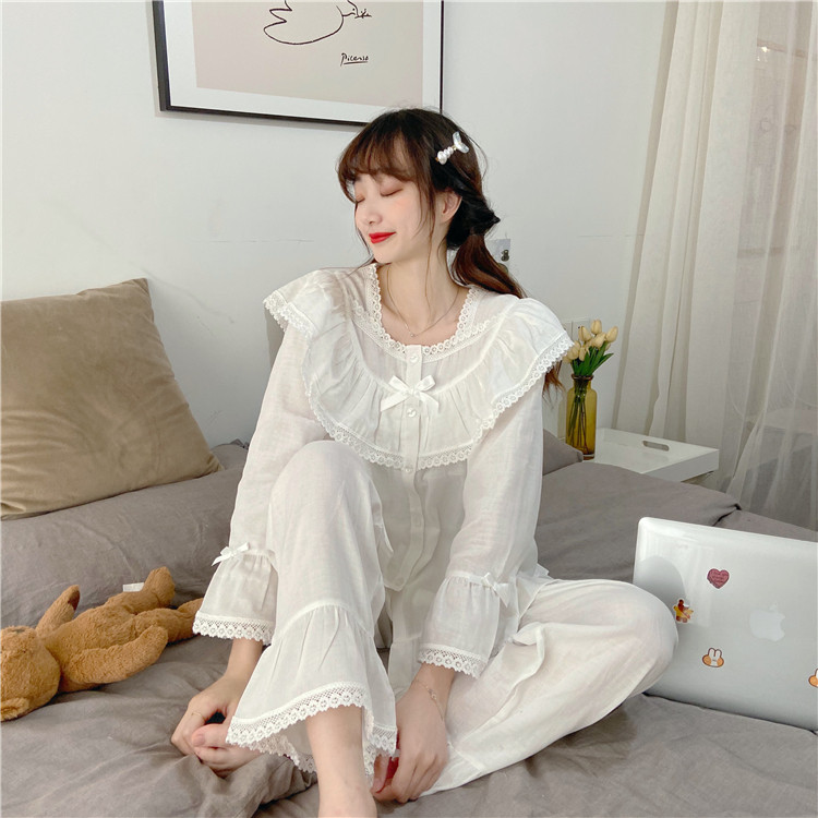 控3 实拍实价~韩版甜美蕾丝花边长袖睡衣套装
