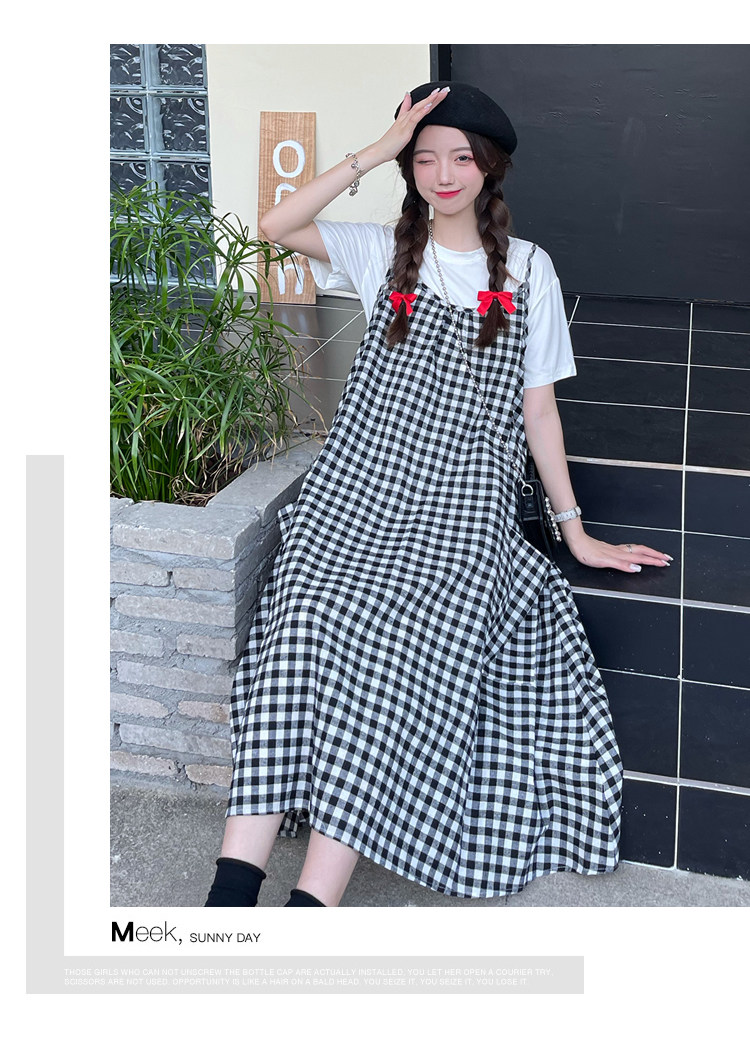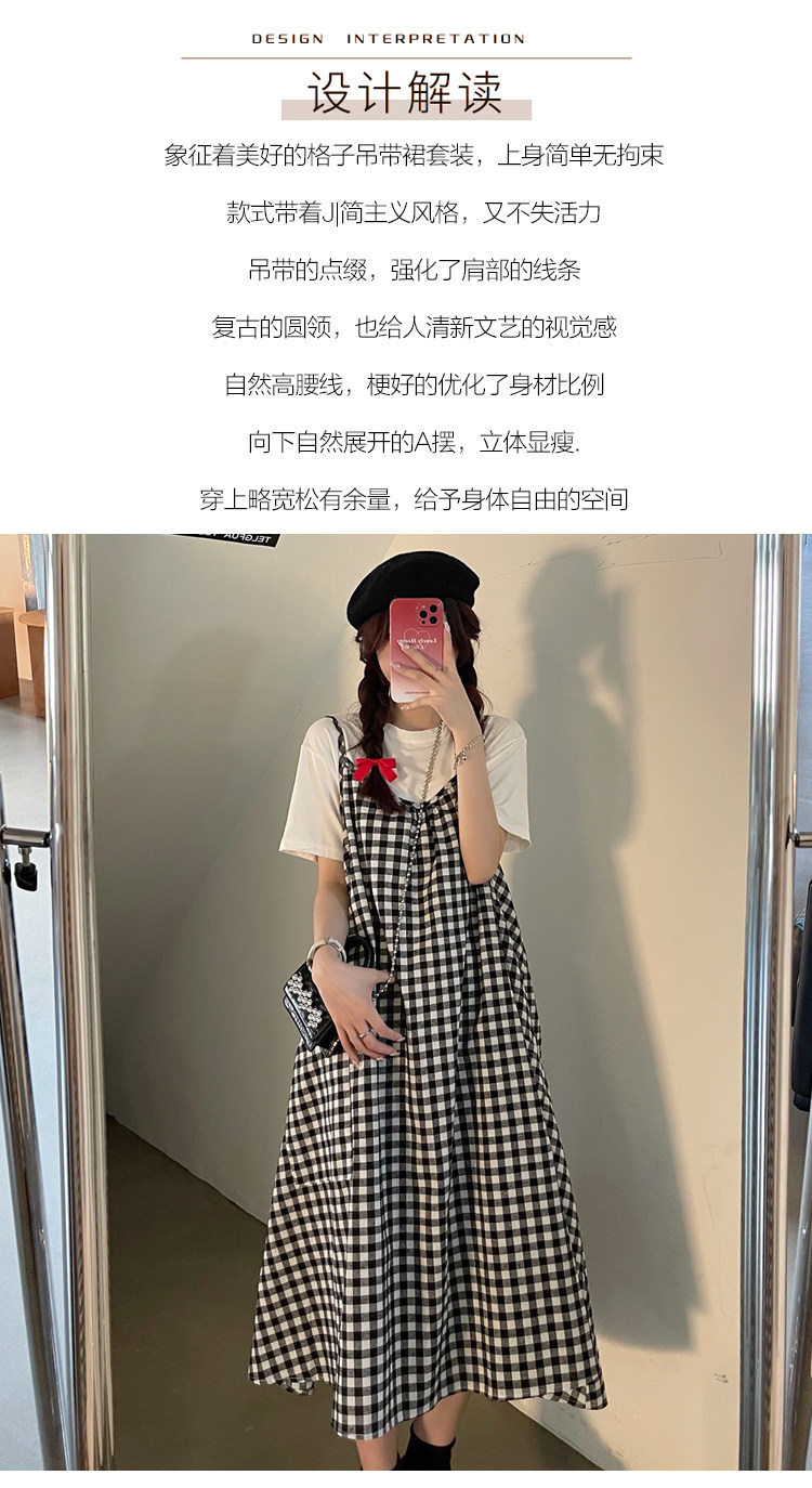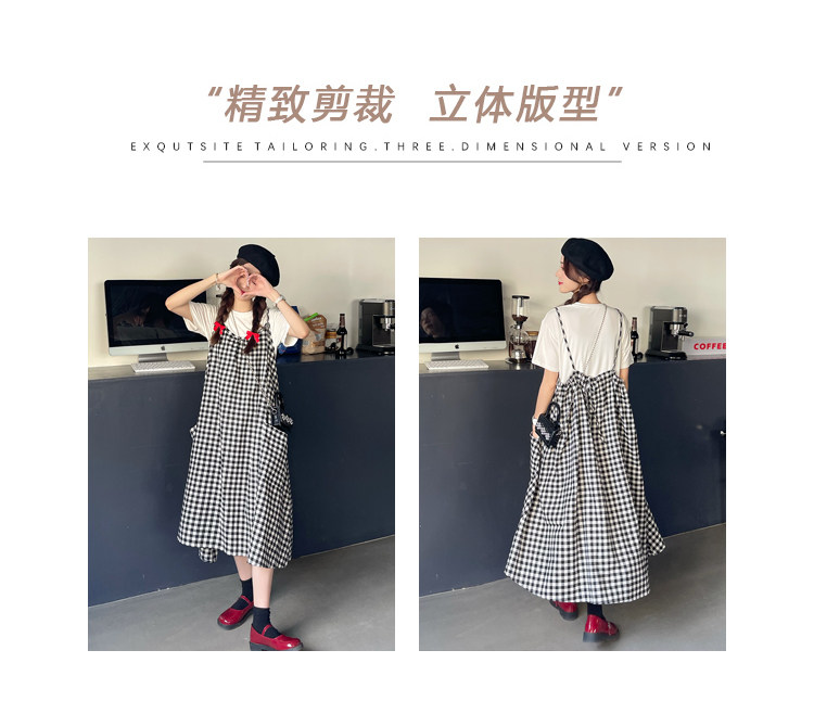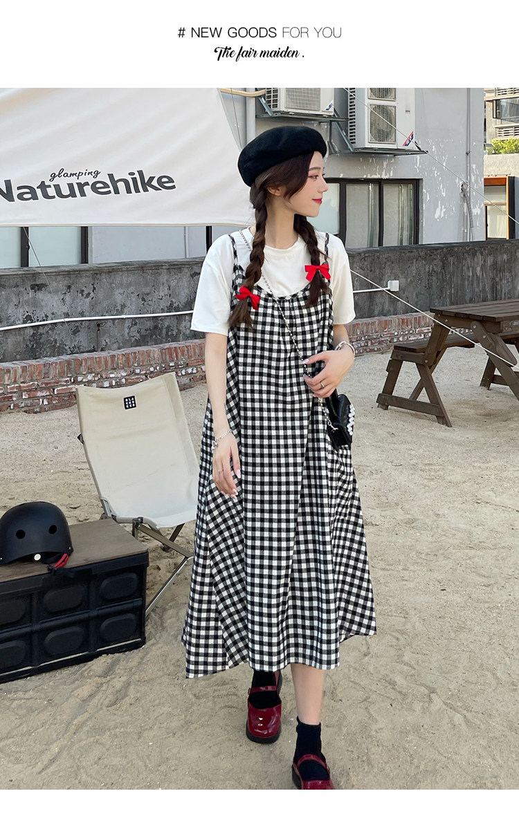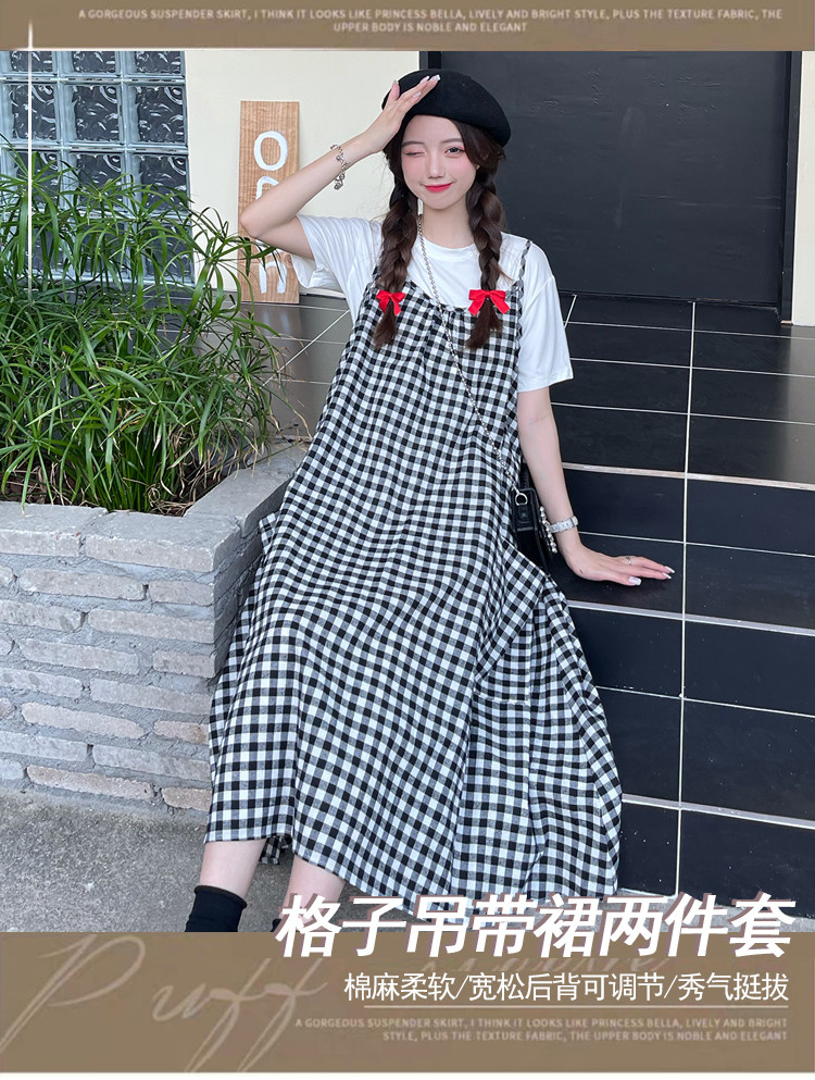 孕妇连衣裙中长款吊带裙两件套大码宽松格子显瘦过膝棉麻现货