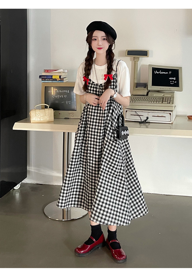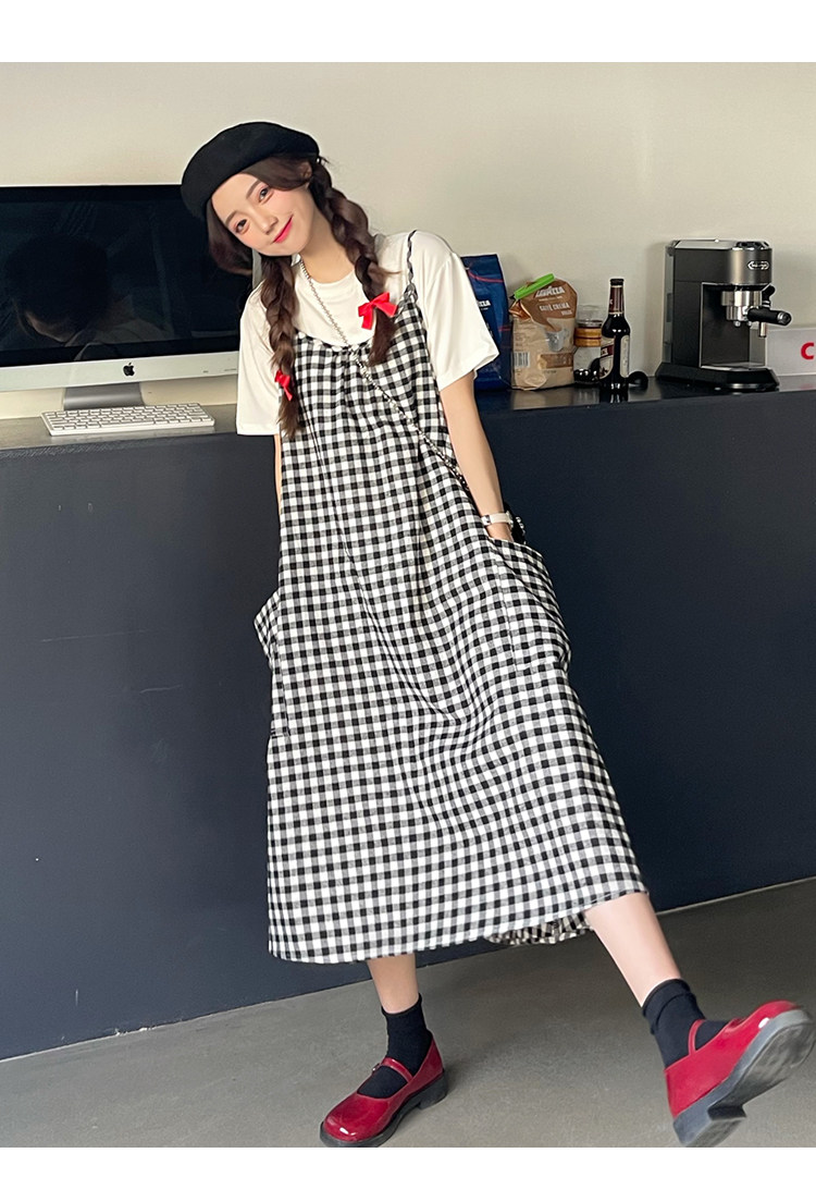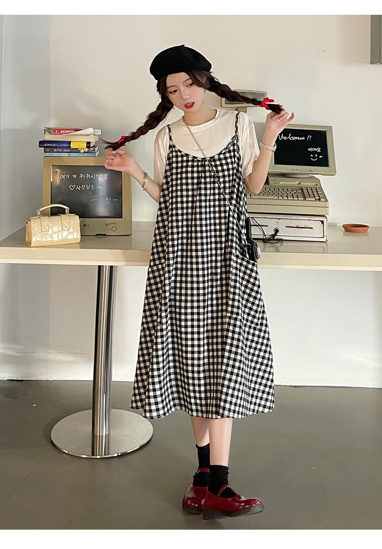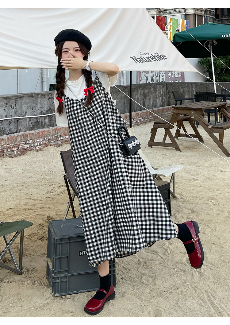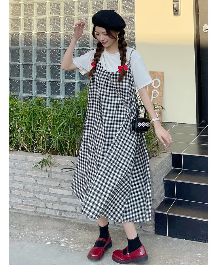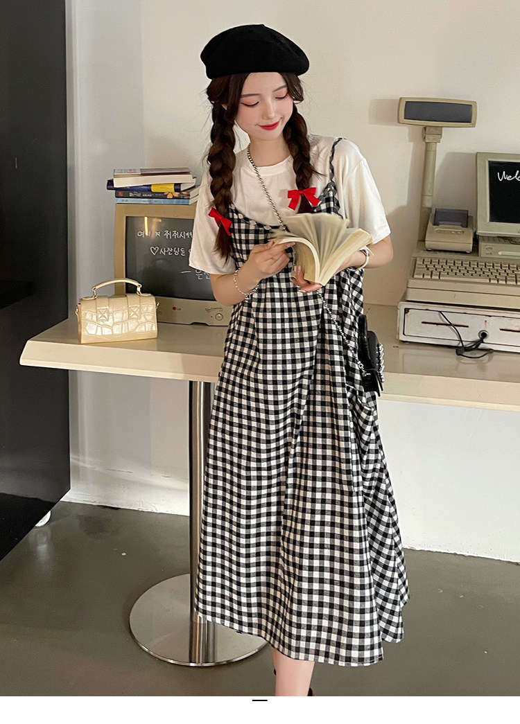 孕妇连衣裙中长款吊带裙两件套大码宽松格子显瘦过膝棉麻现货