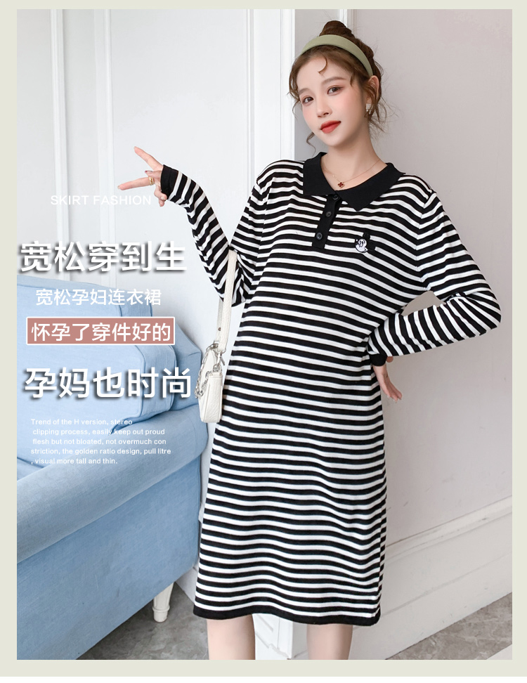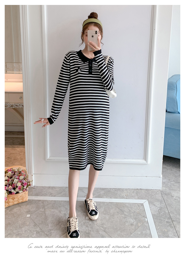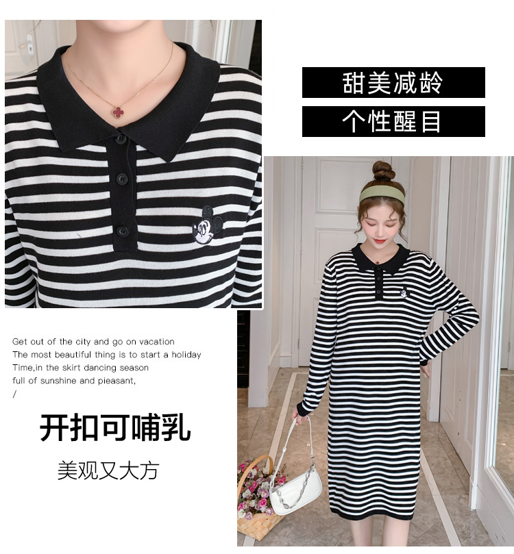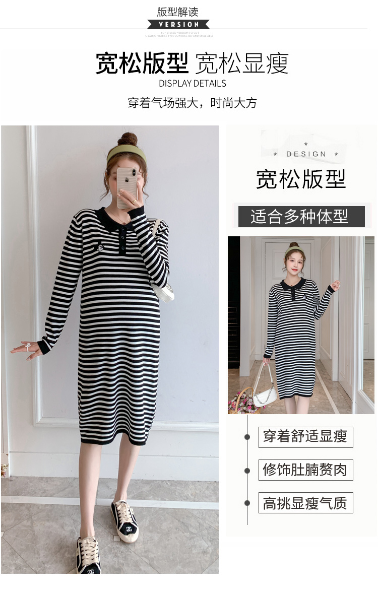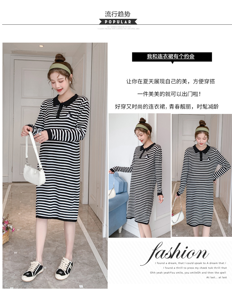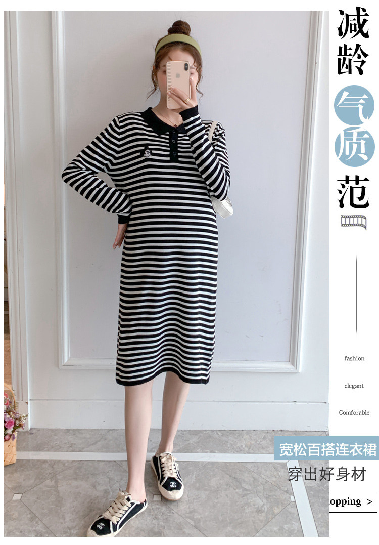 实拍现货新款春秋孕妇时尚条纹宽松显瘦开扣可哺乳网红POLO衫冰丝针织裙
