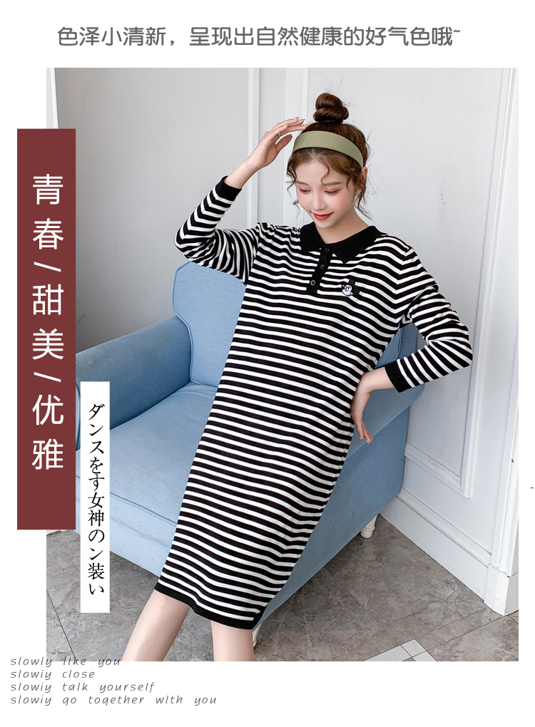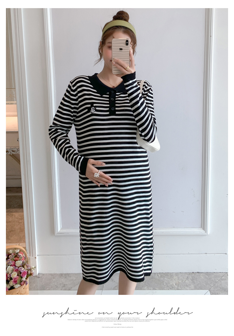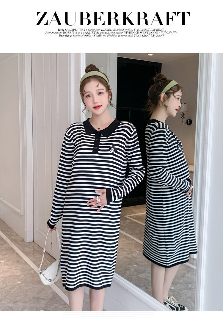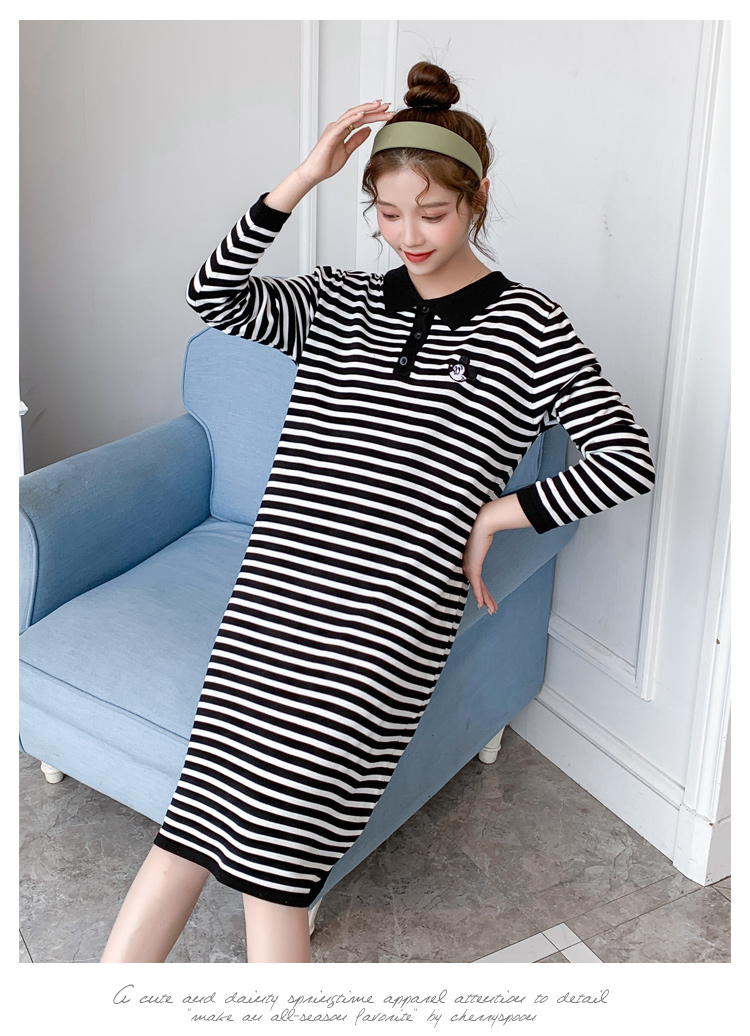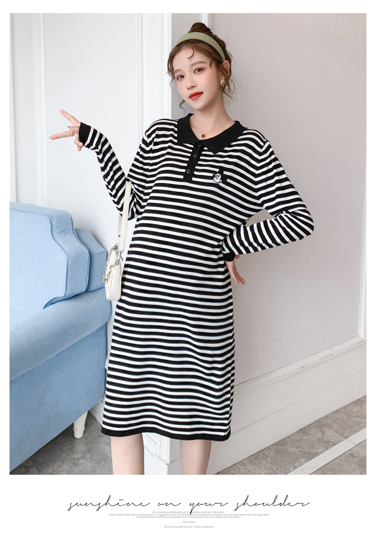 实拍现货新款春秋孕妇时尚条纹宽松显瘦开扣可哺乳网红POLO衫冰丝针织裙