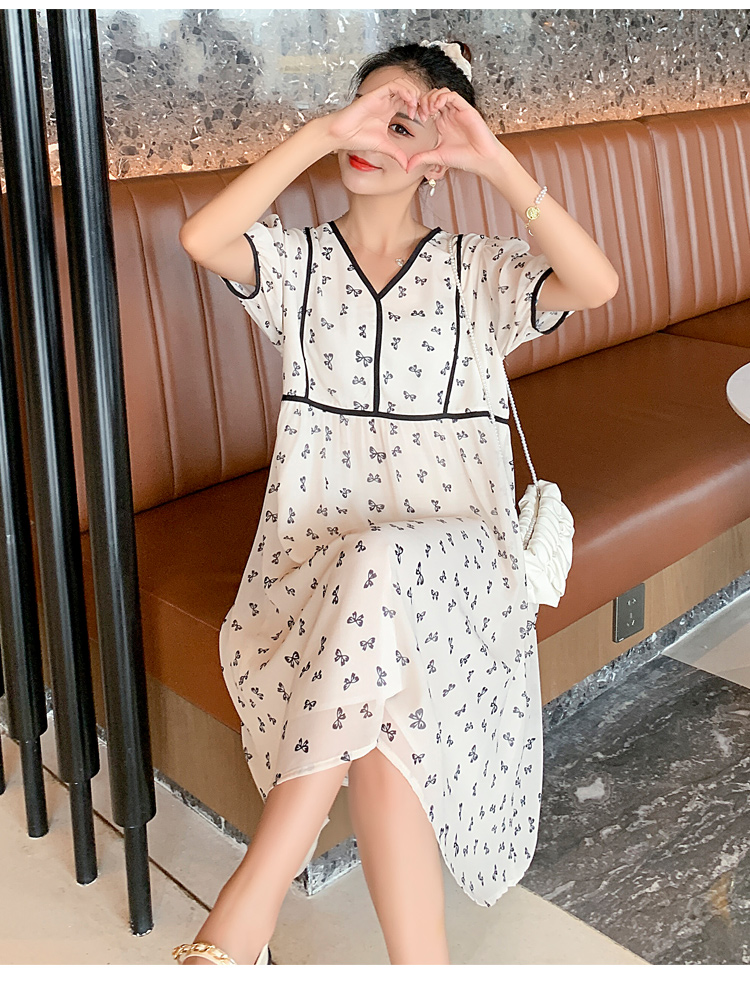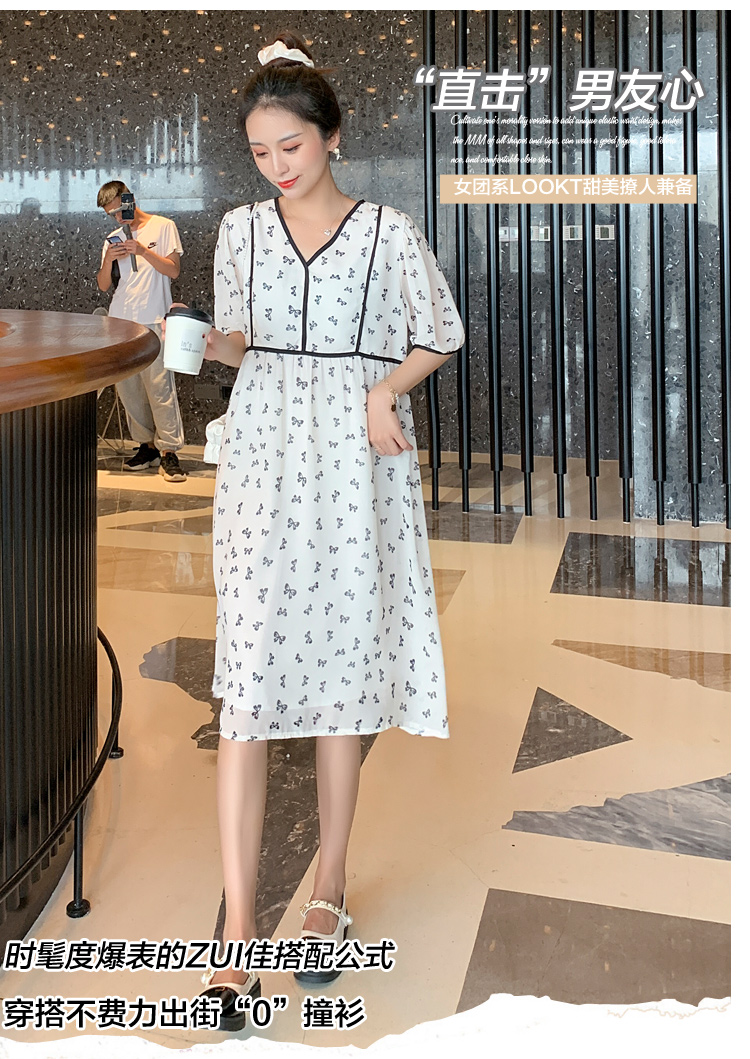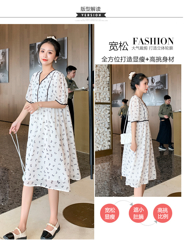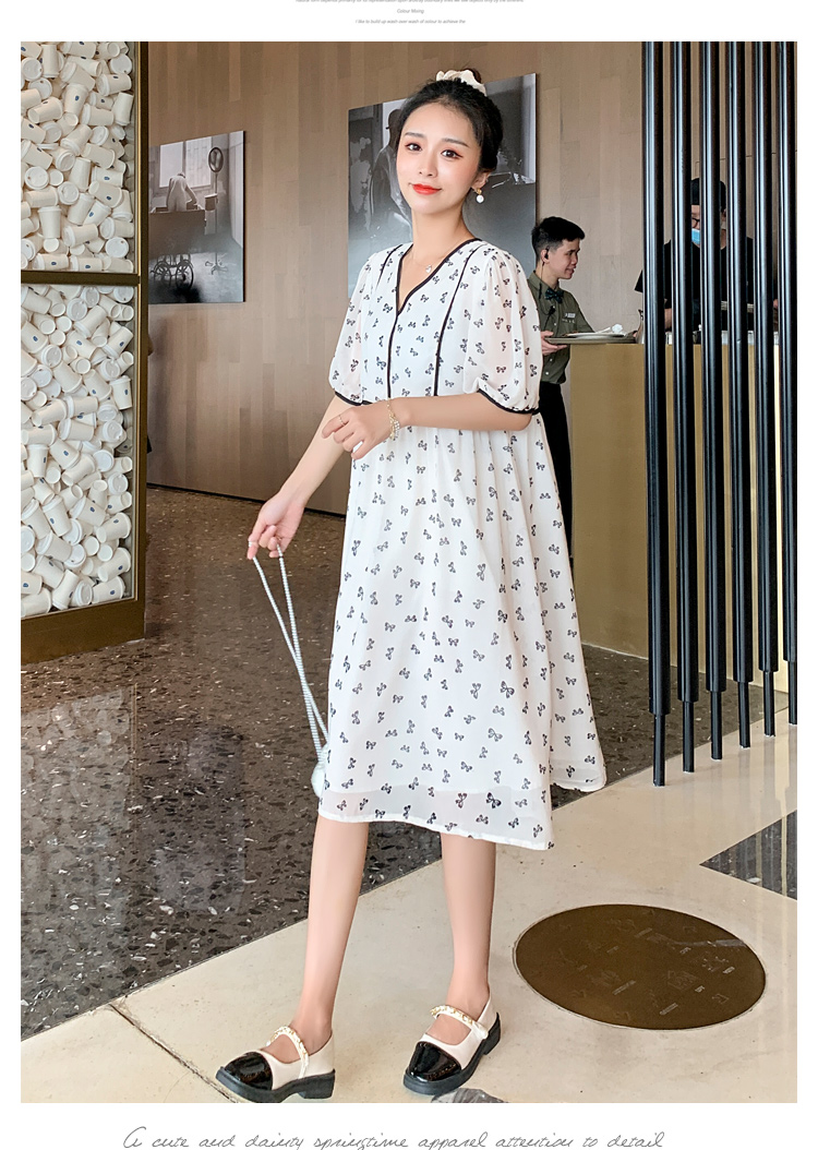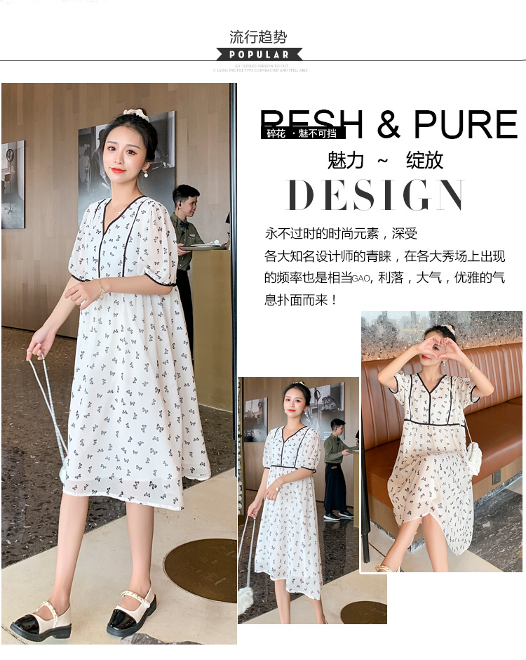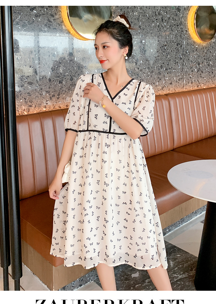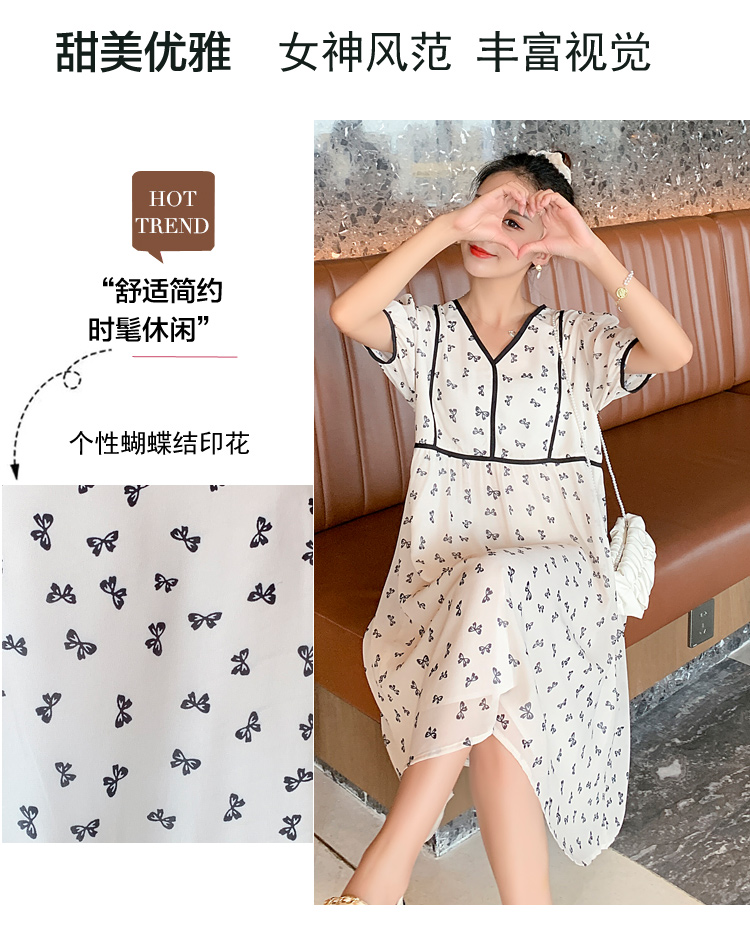 现货2021新款实拍洋气时尚孕妇装短袖V领雪纺连衣裙可爱甜美减龄