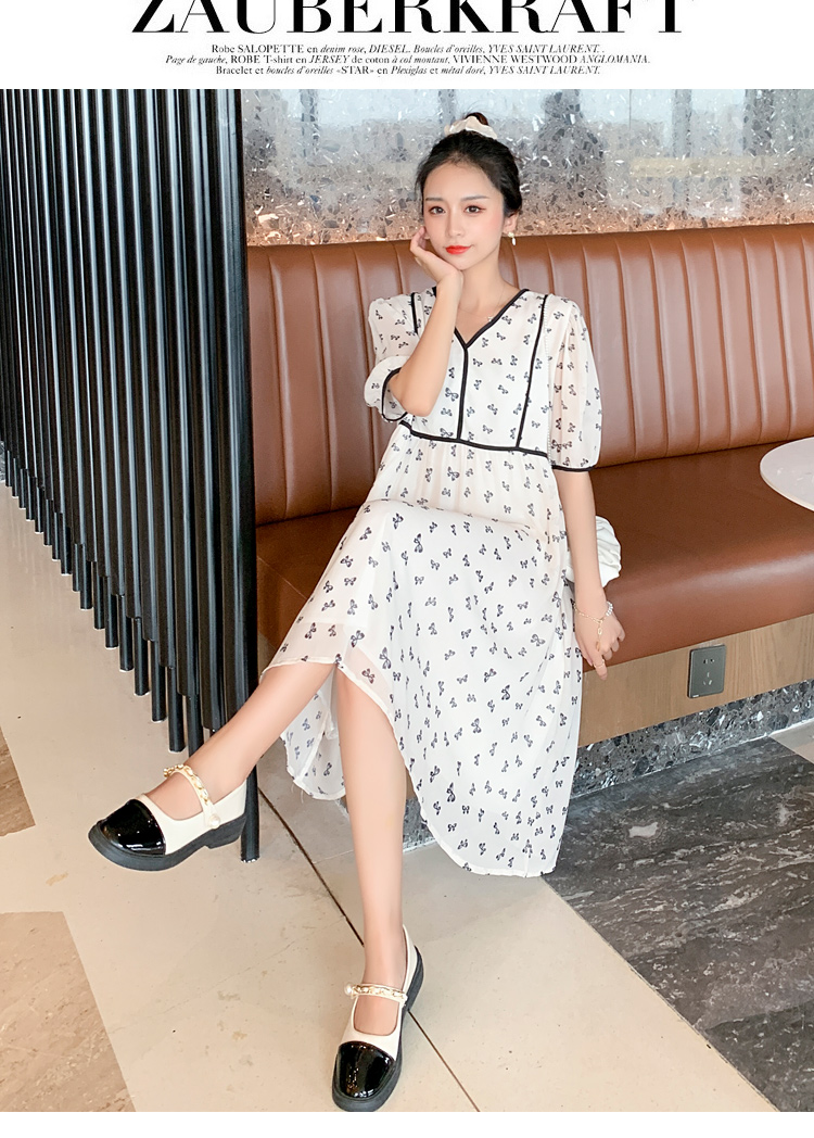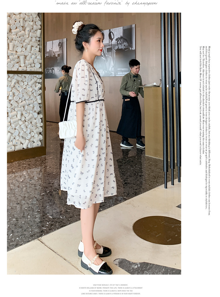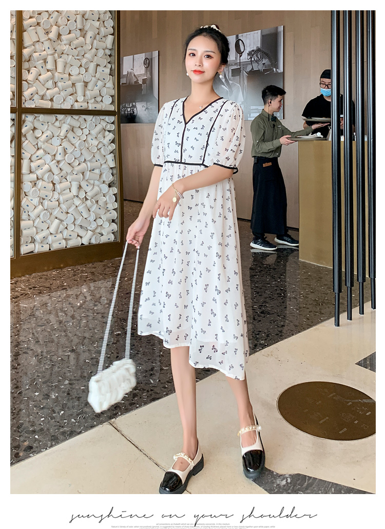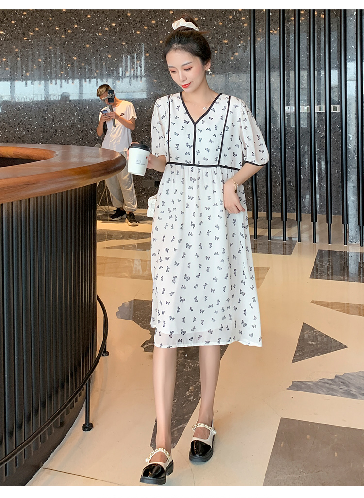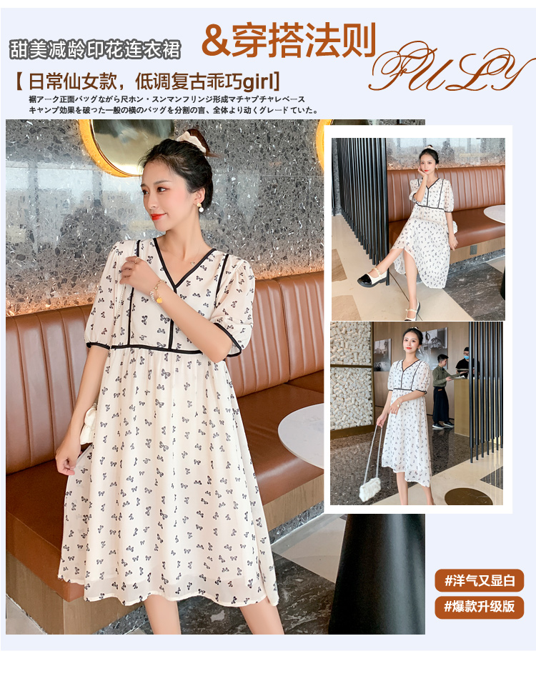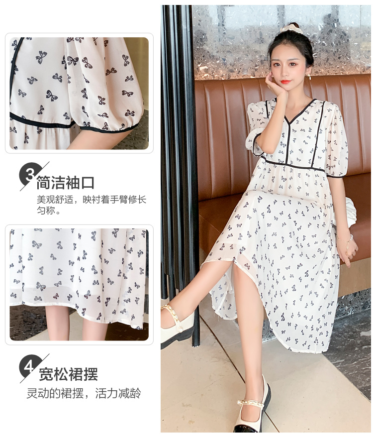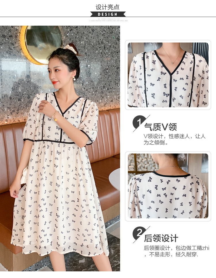现货2021新款实拍洋气时尚孕妇装短袖V领雪纺连衣裙可爱甜美减龄