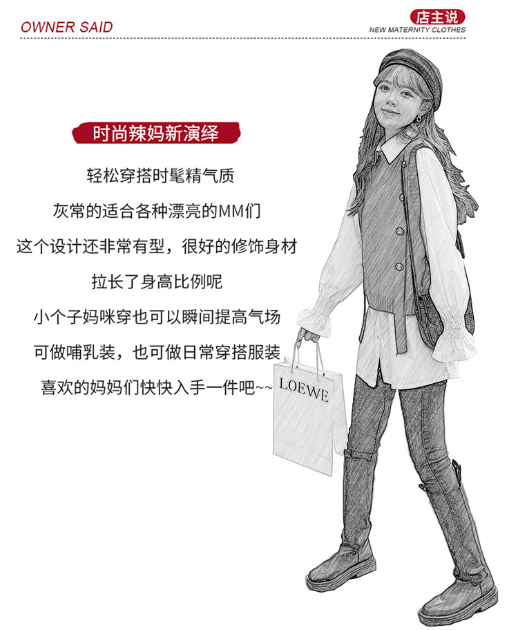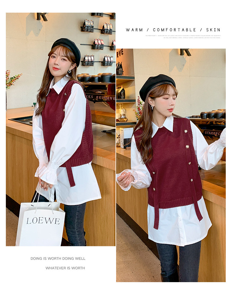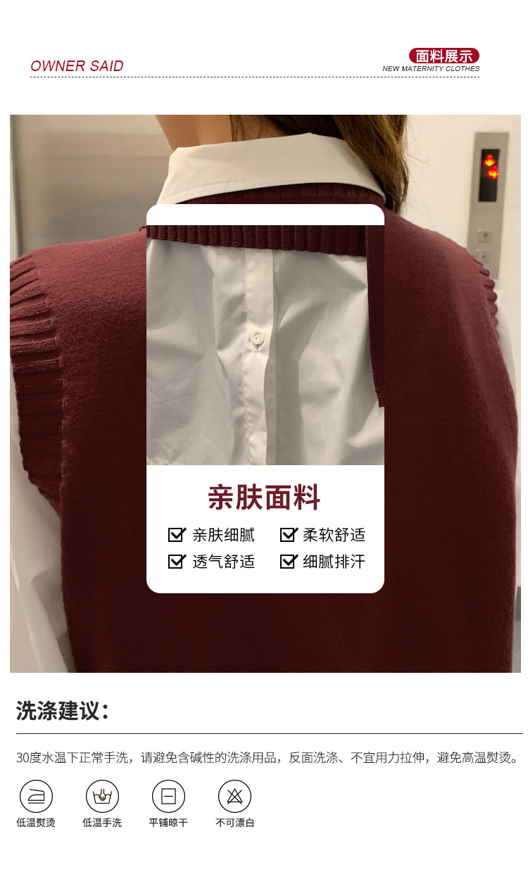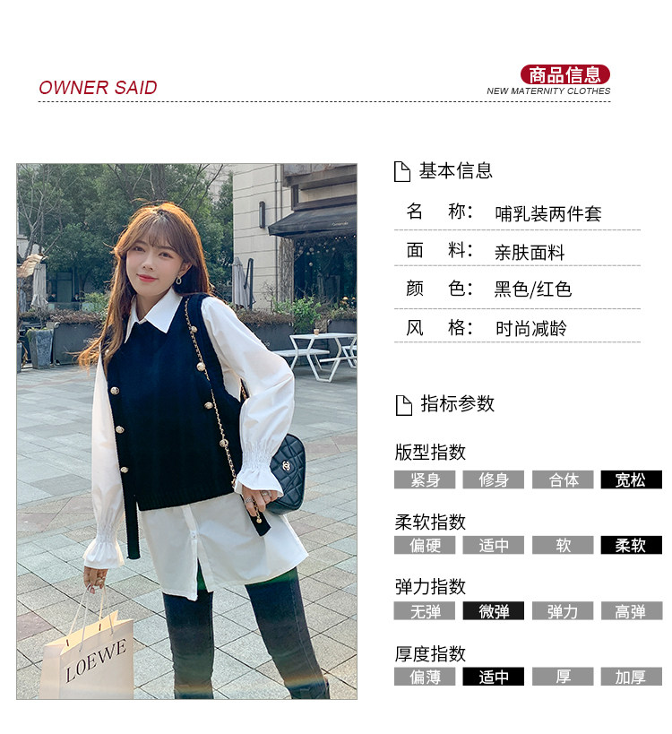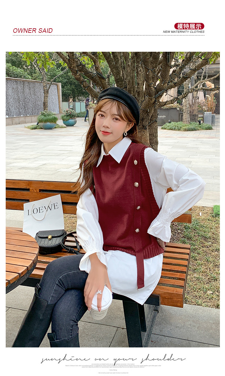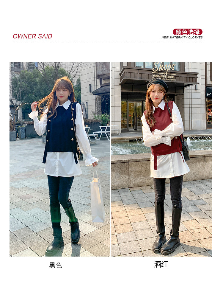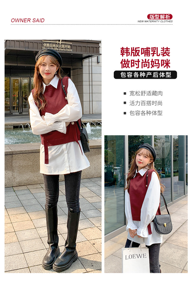 实拍2021早春欧洲站设计感孕妇套装喇叭袖翻领衬衫针织马甲哺乳装