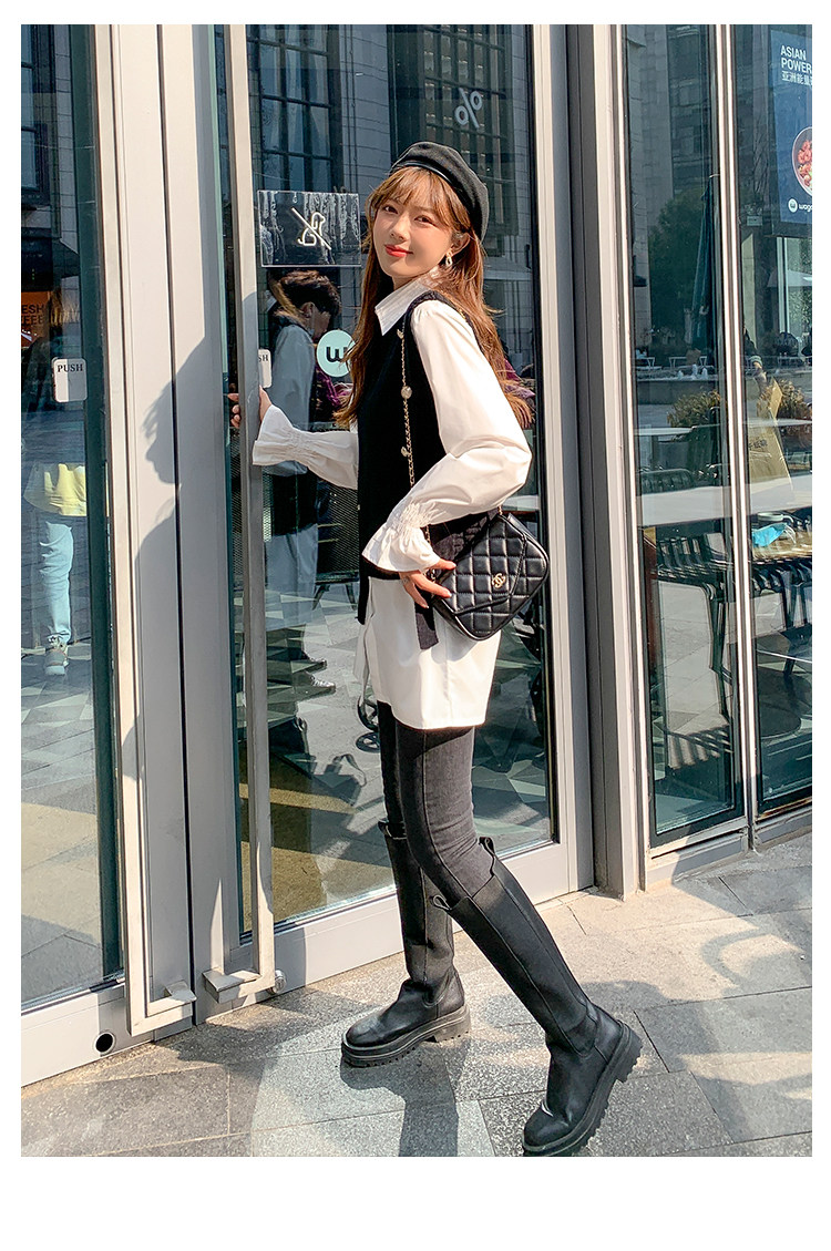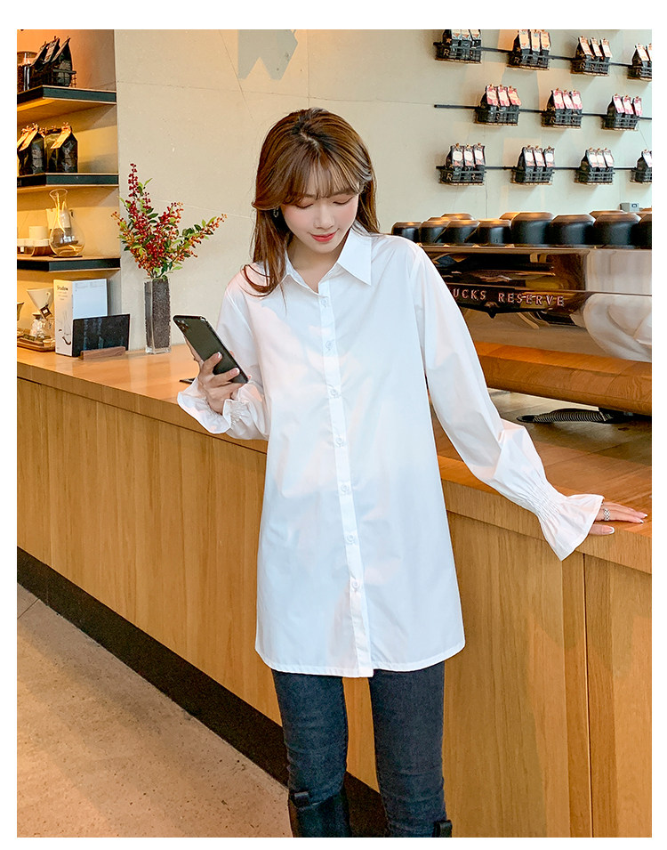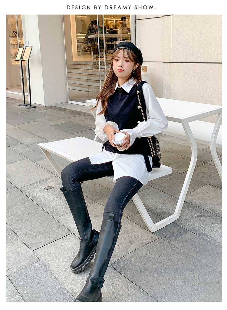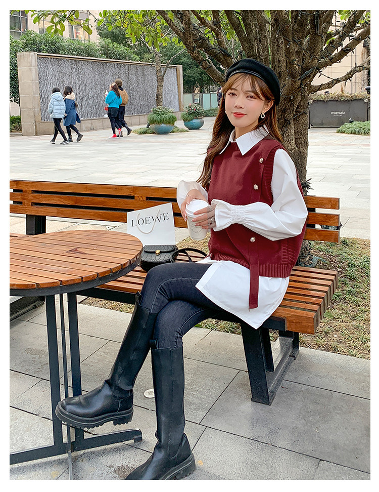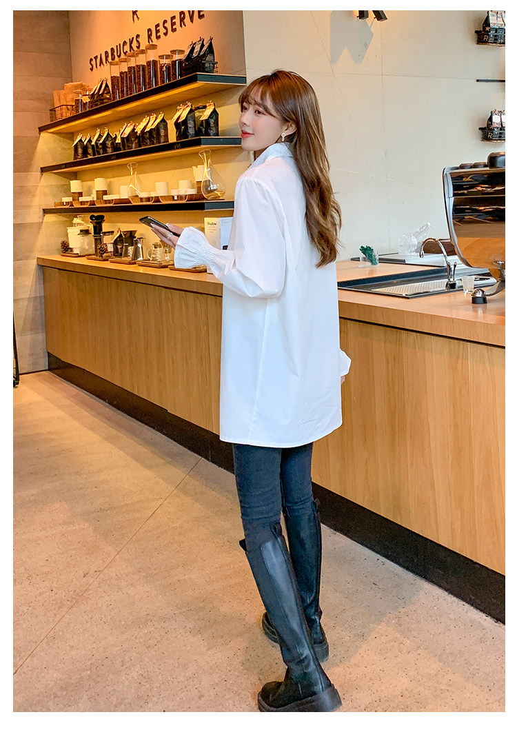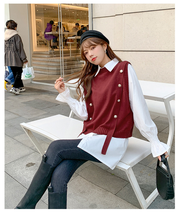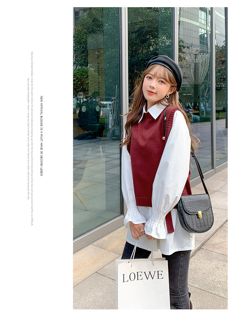 实拍2021早春欧洲站设计感孕妇套装喇叭袖翻领衬衫针织马甲哺乳装