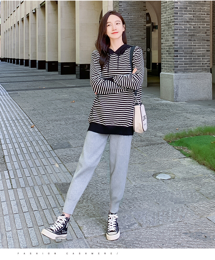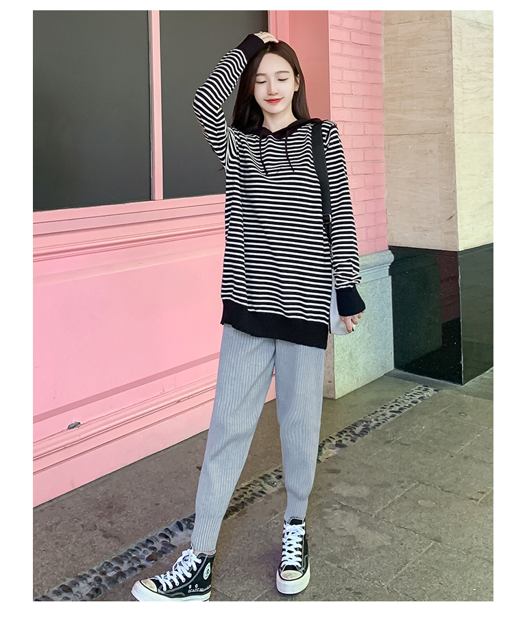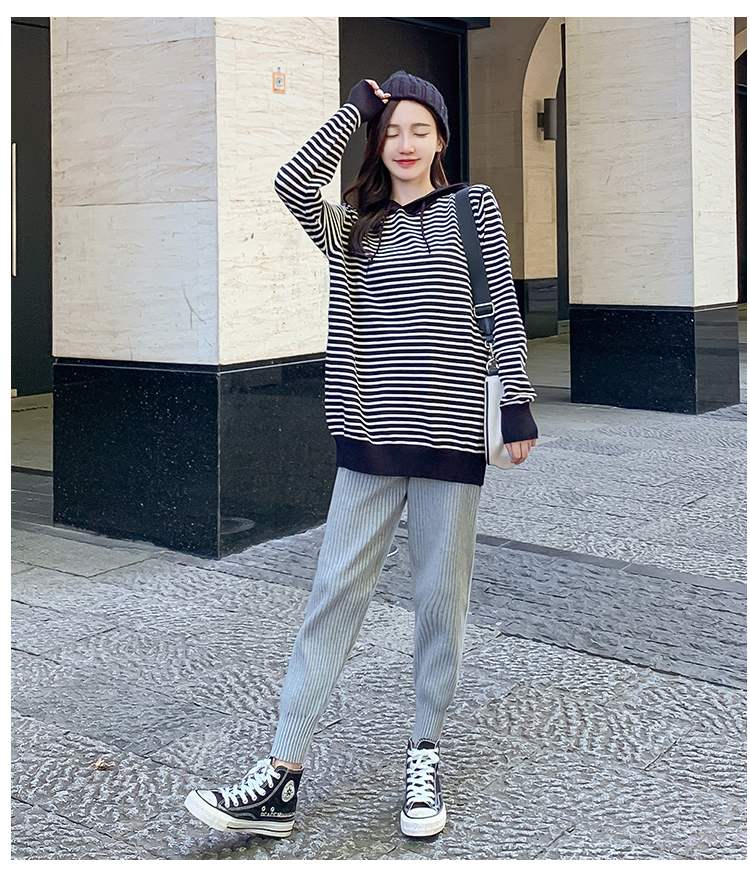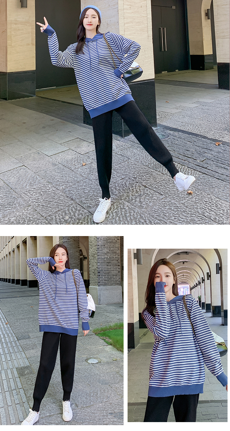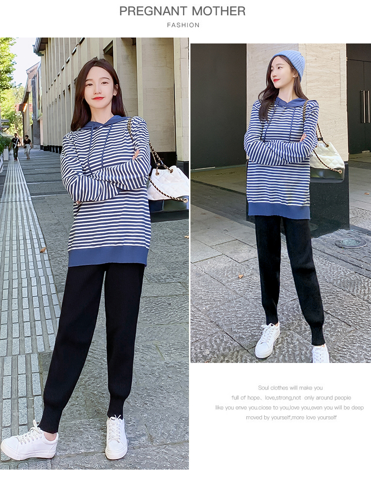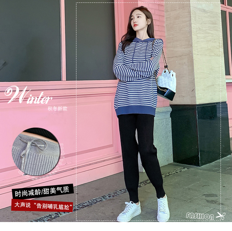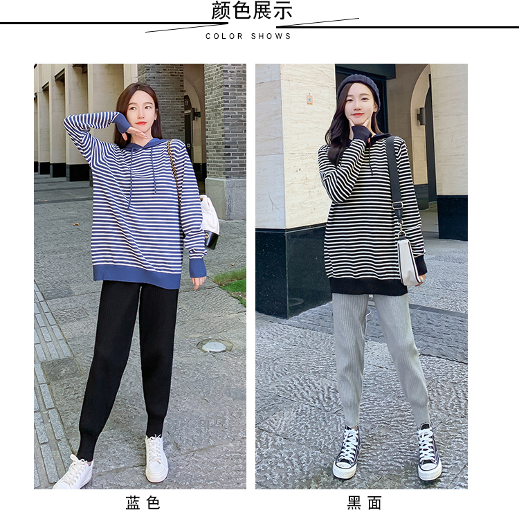 实拍6002#孕妇秋冬毛衣套装网红连帽条纹卫衣两件套针织阔腿长裤