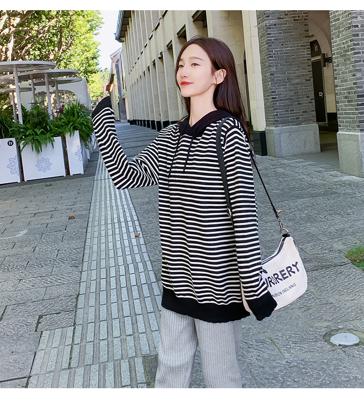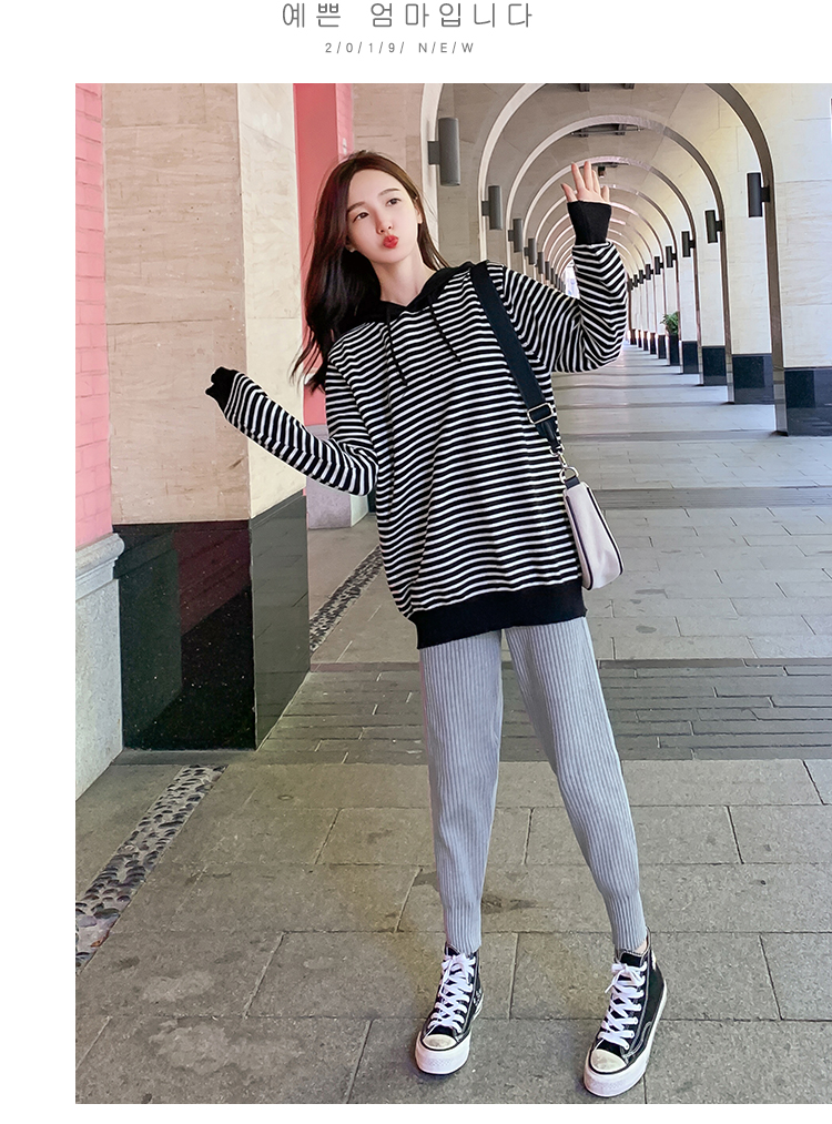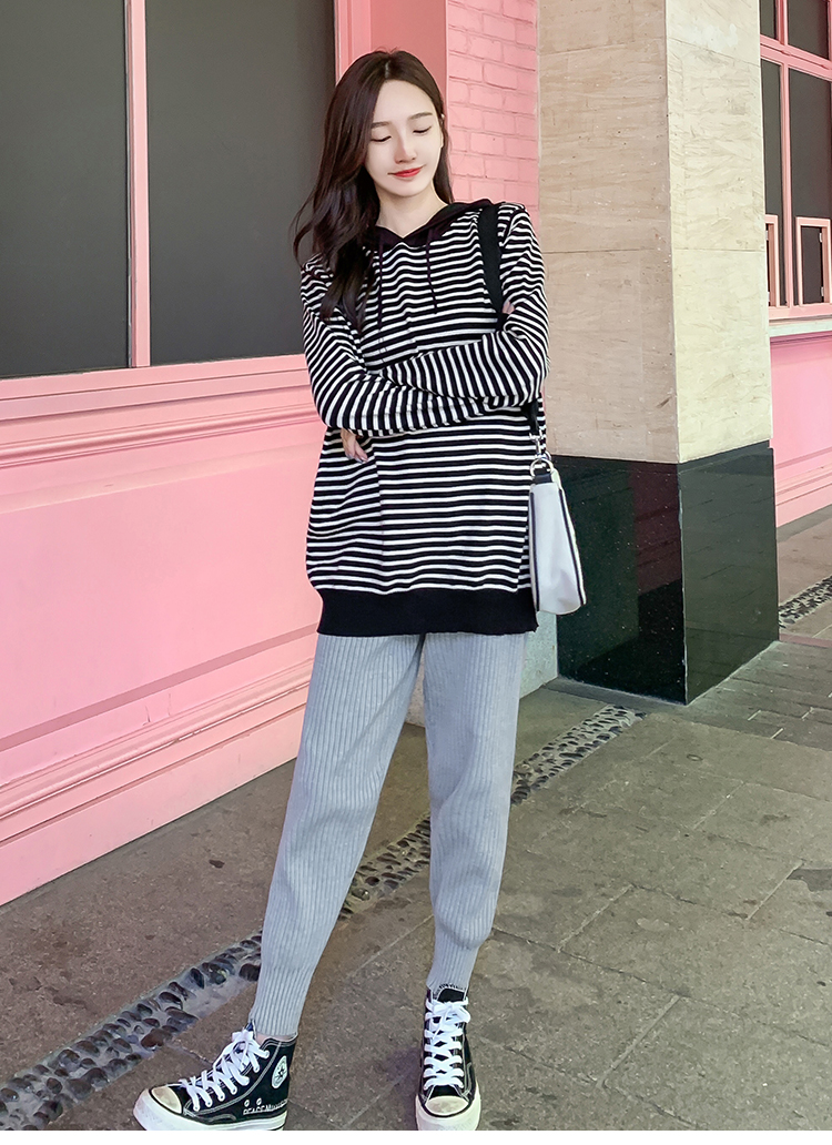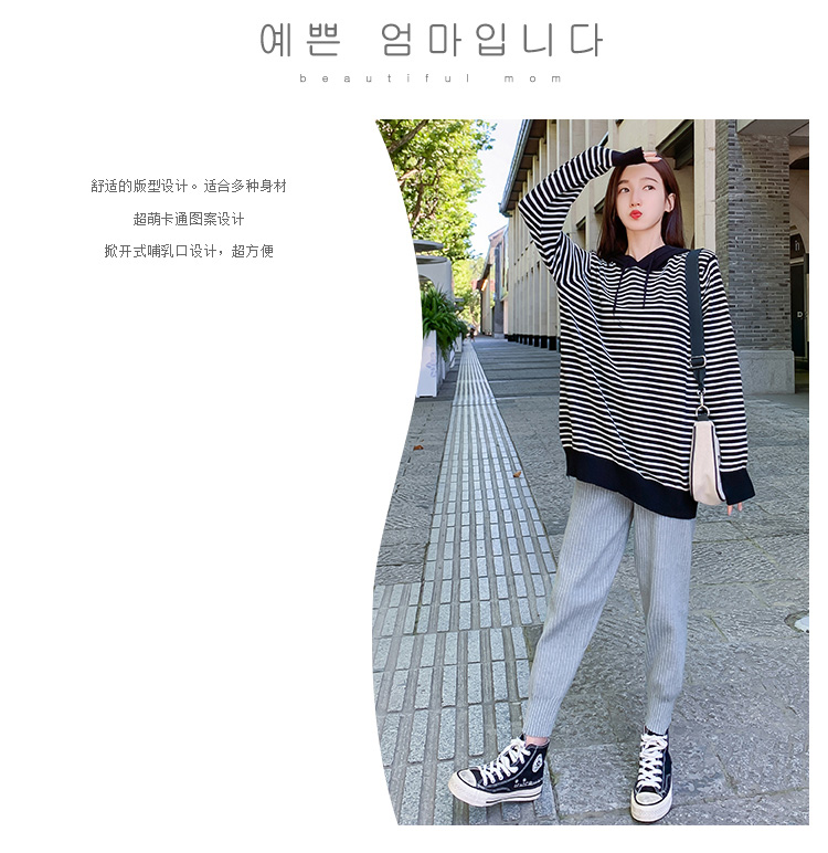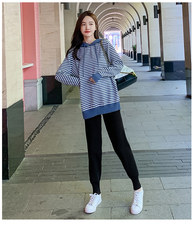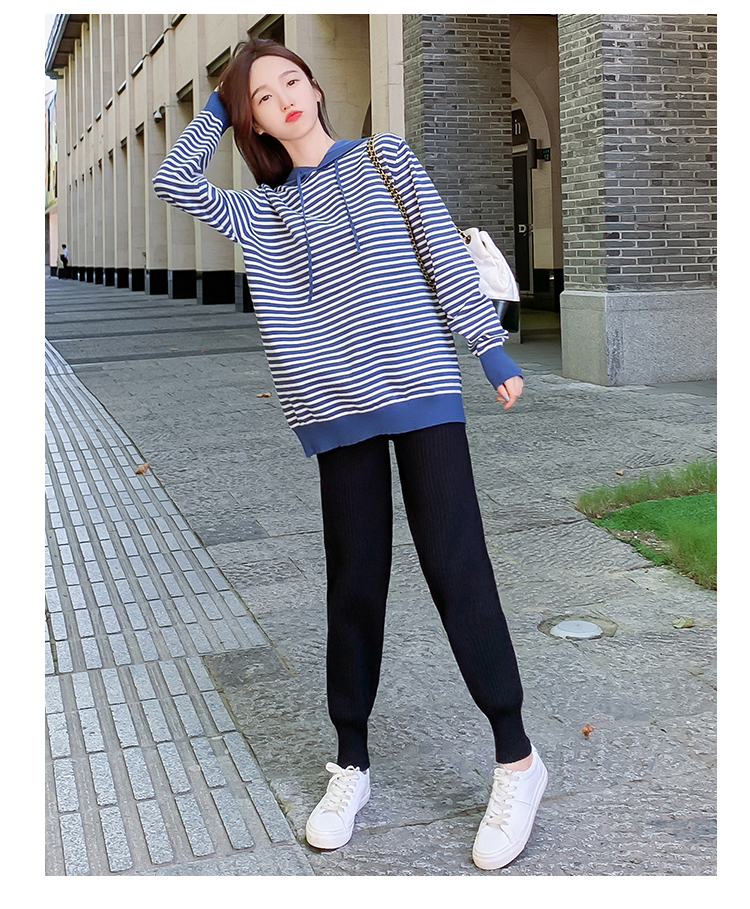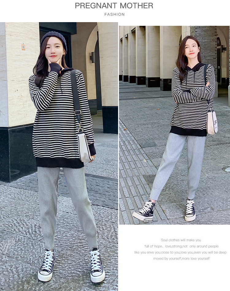 实拍6002#孕妇秋冬毛衣套装网红连帽条纹卫衣两件套针织阔腿长裤