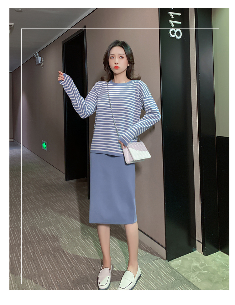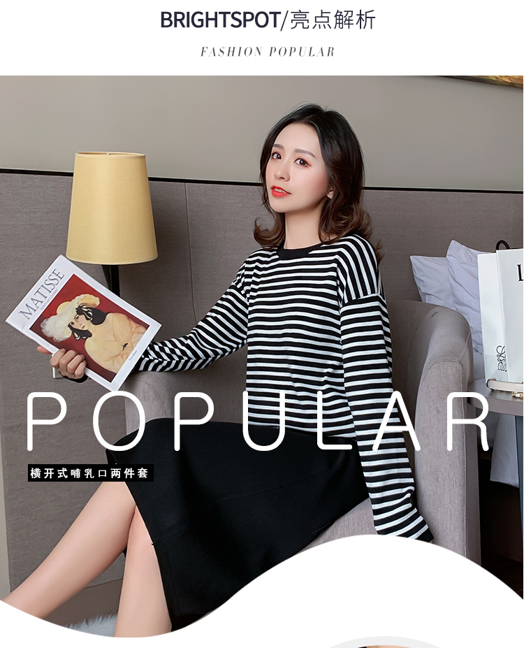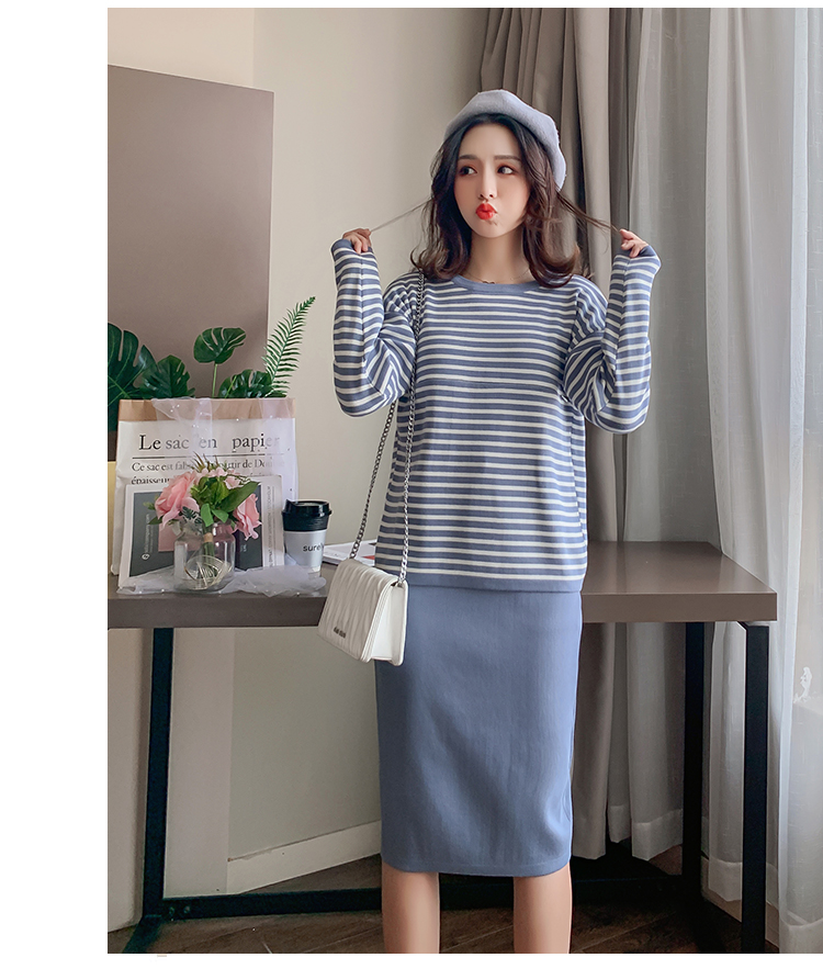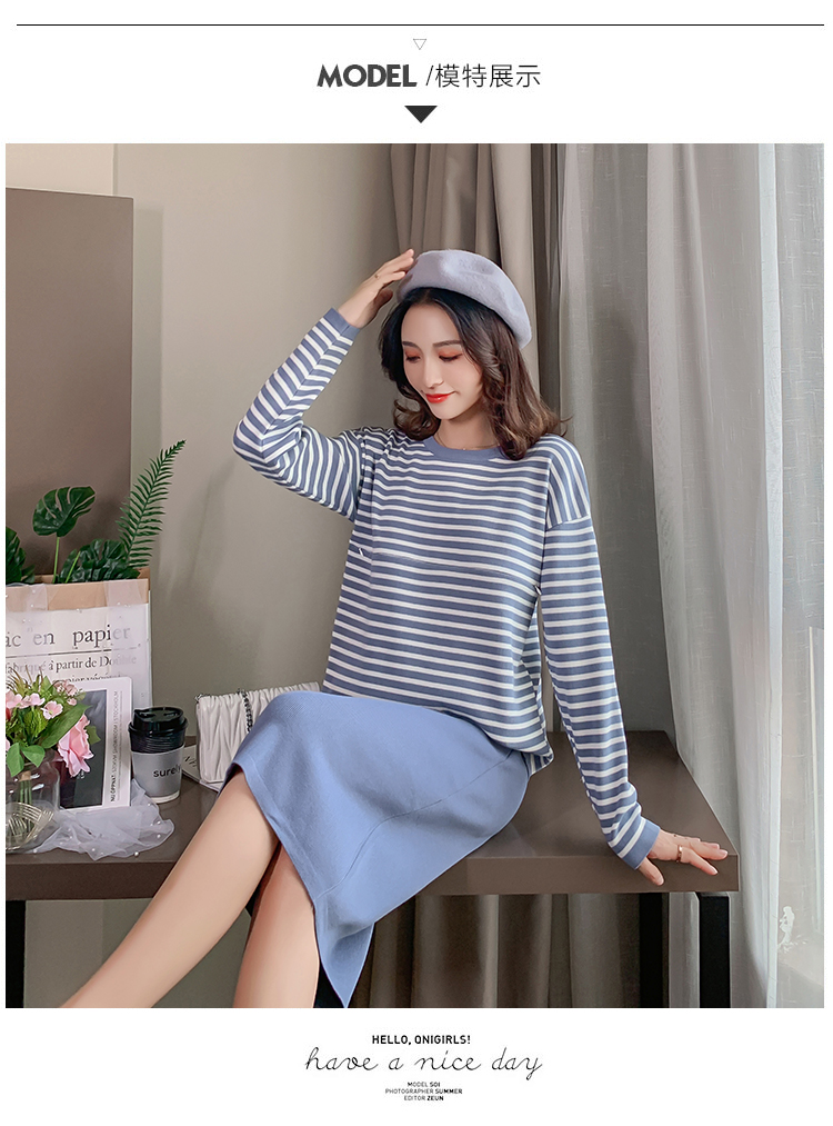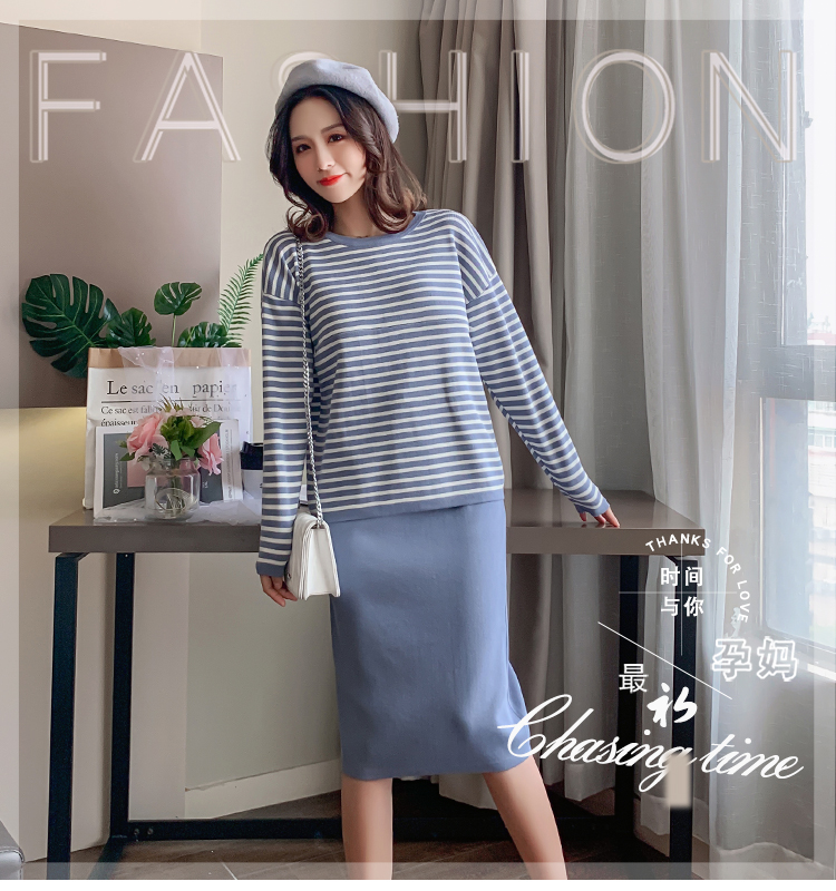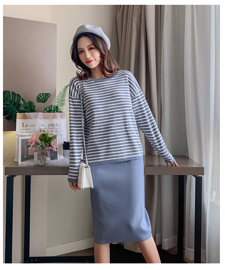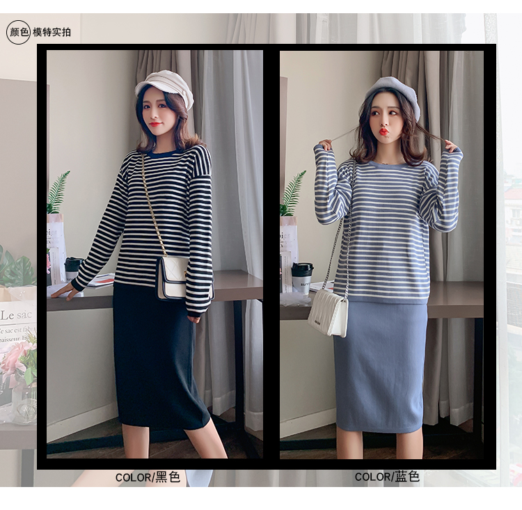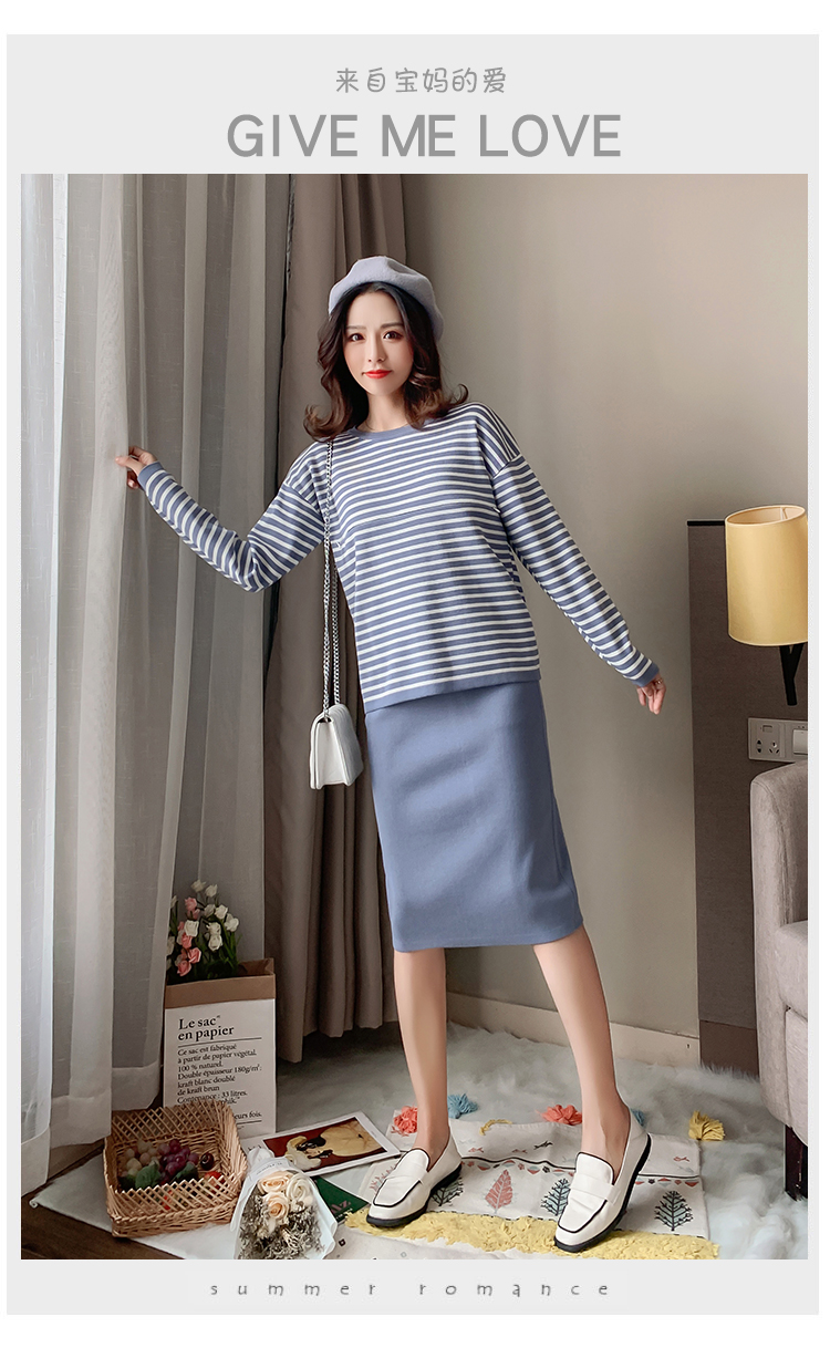 实拍哺乳毛衣套装时尚条纹喂奶针织衫高腰半身裙显瘦两件套