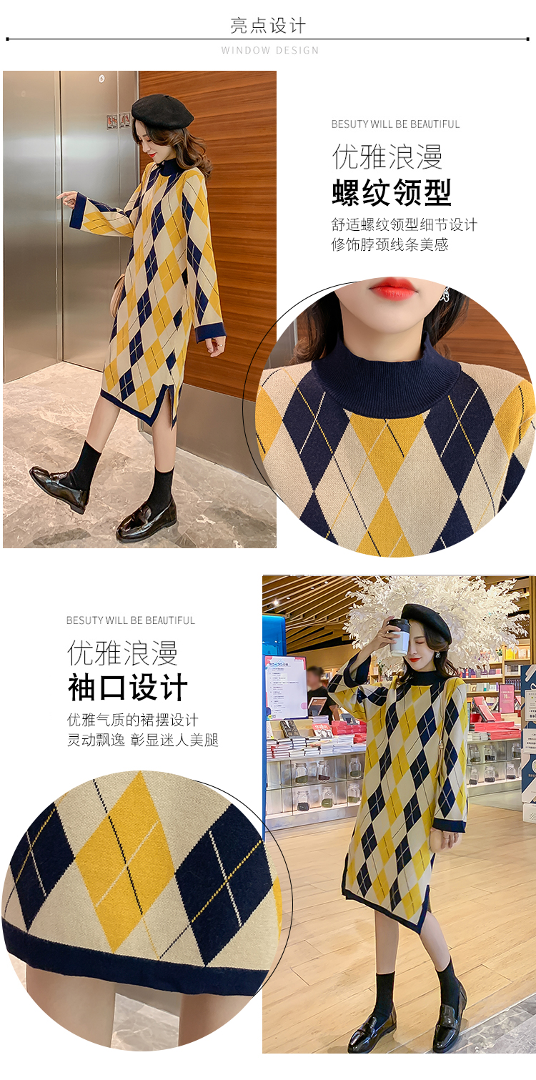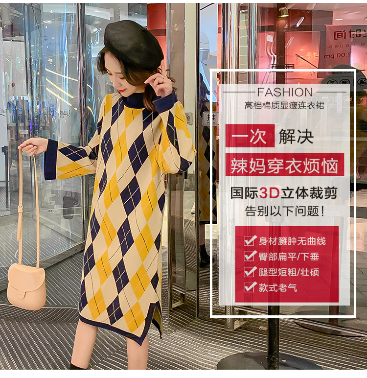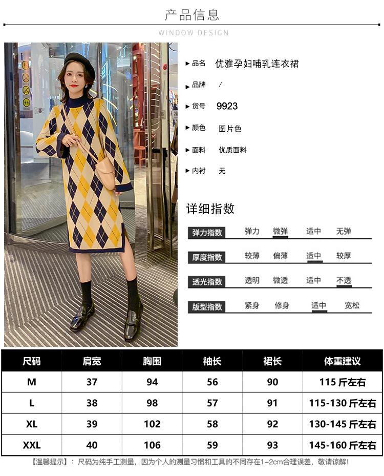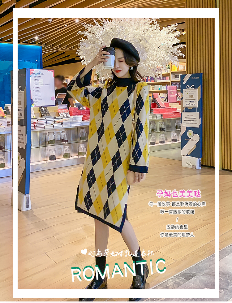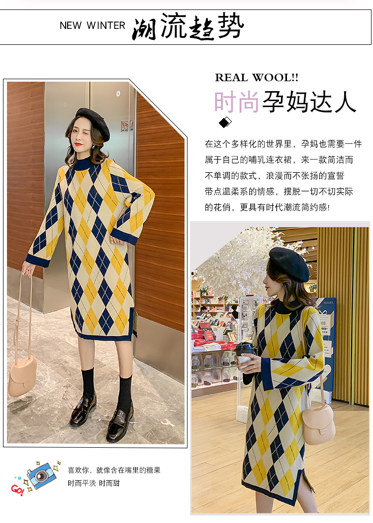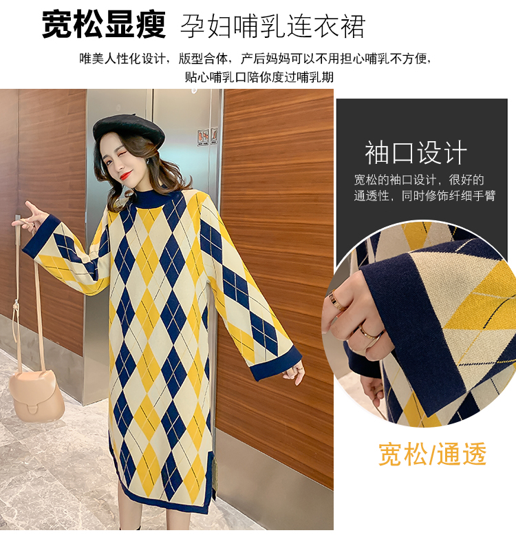 实拍9923秋冬包芯纱哺乳毛衣潮妈产后网红港风格子喂奶针织连衣裙