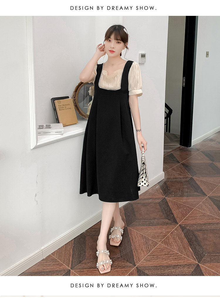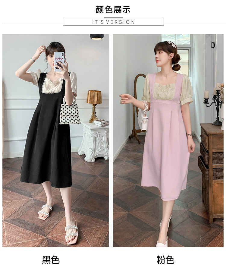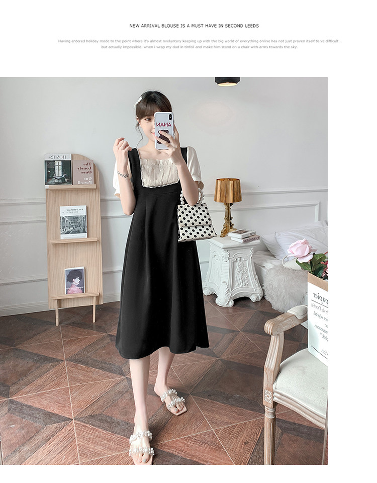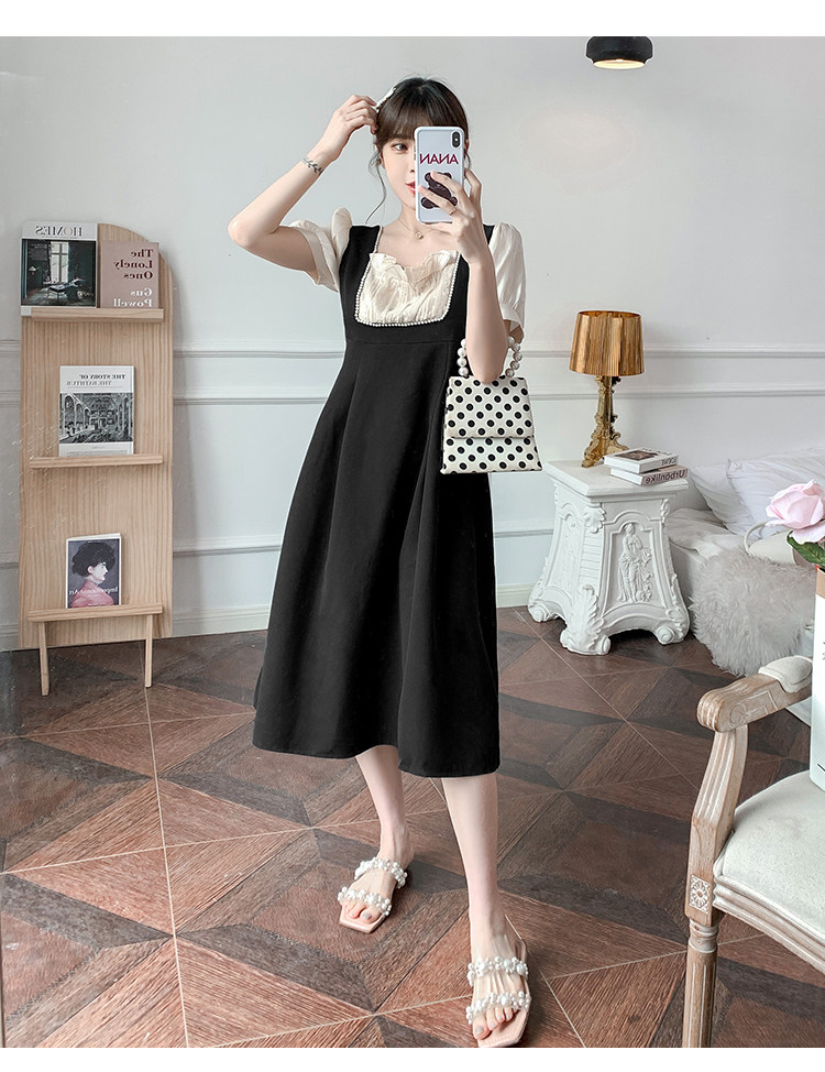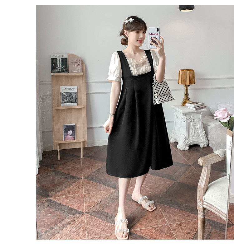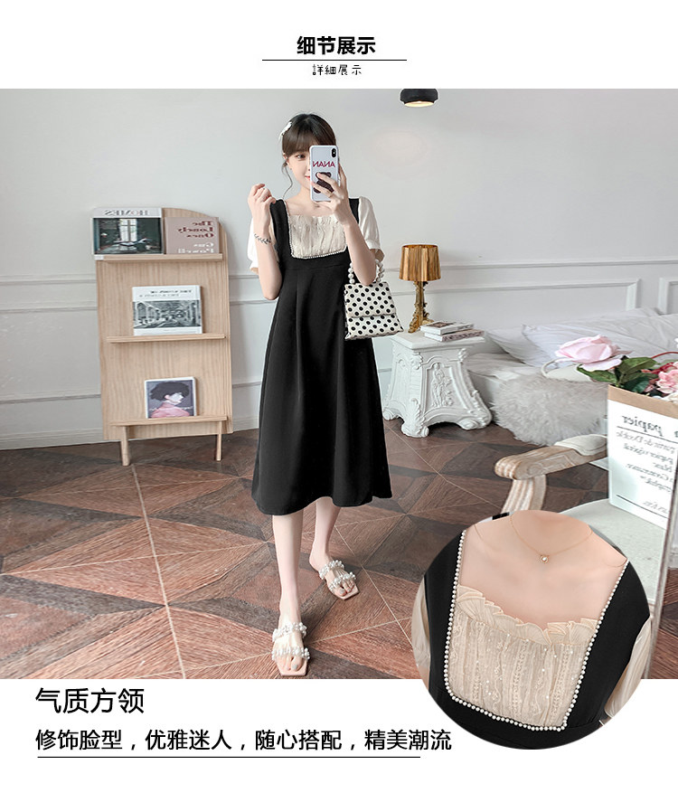 实拍法式方领孕妇连衣裙2021夏产后气质修身短袖小黑裙外出哺乳装