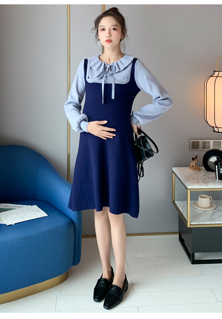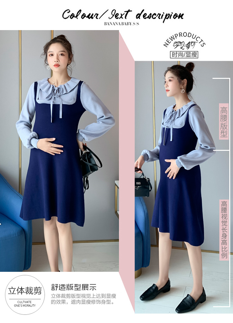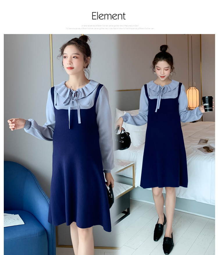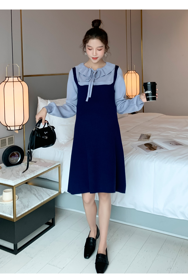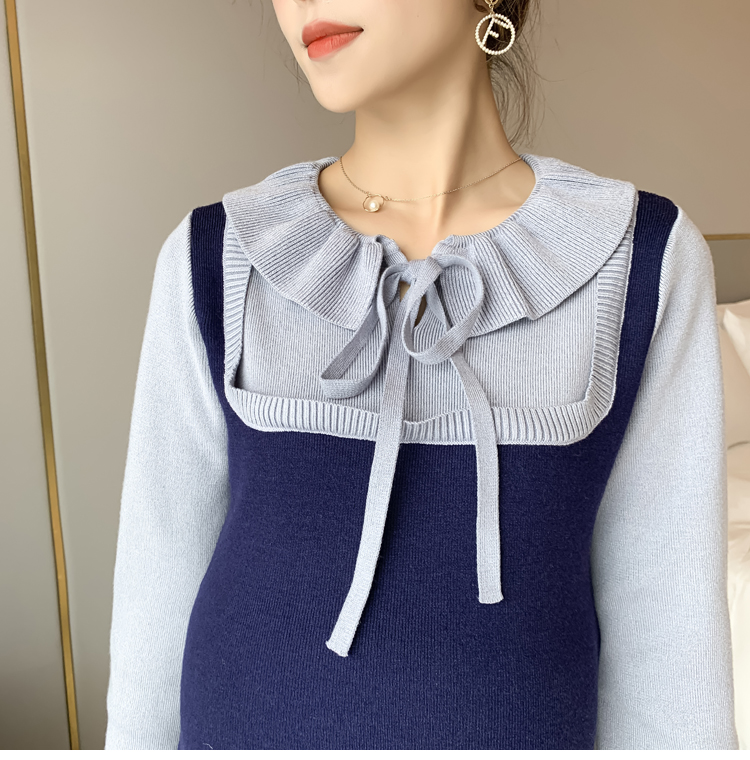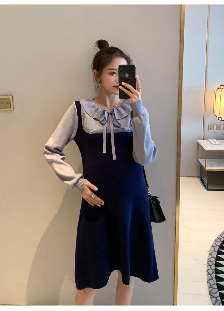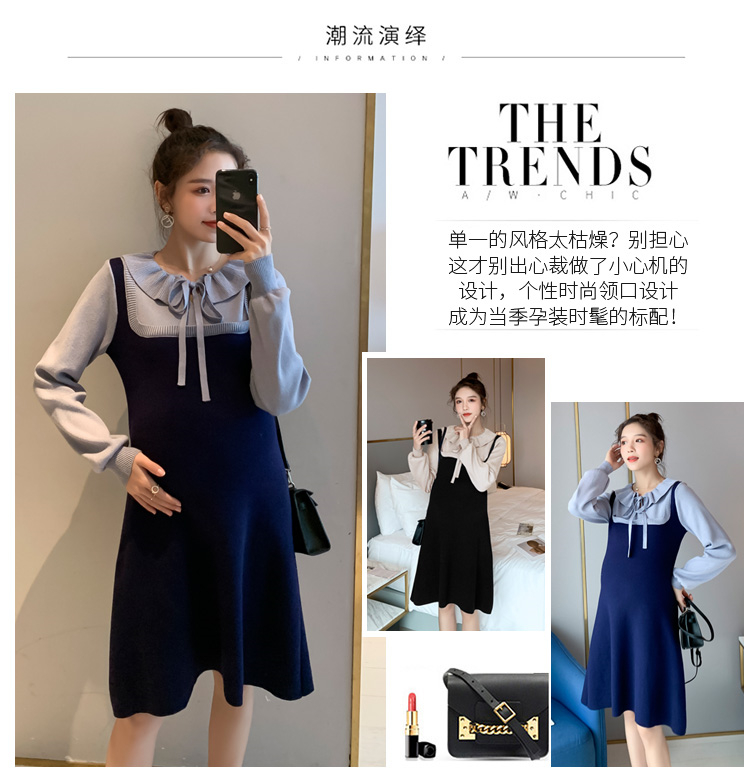 实拍现货2020秋冬新款孕妇法式小众木耳边系带胖mm针织拼接假两件大码连衣裙