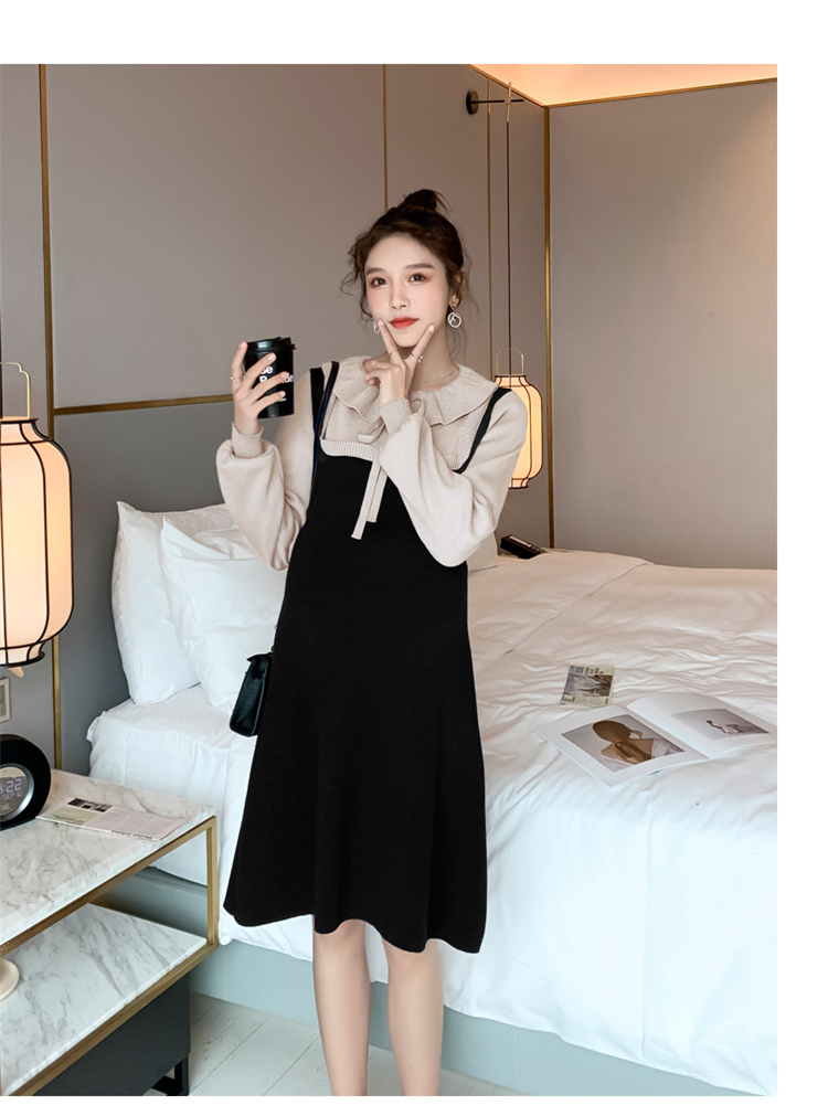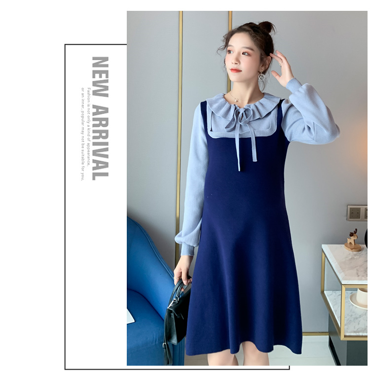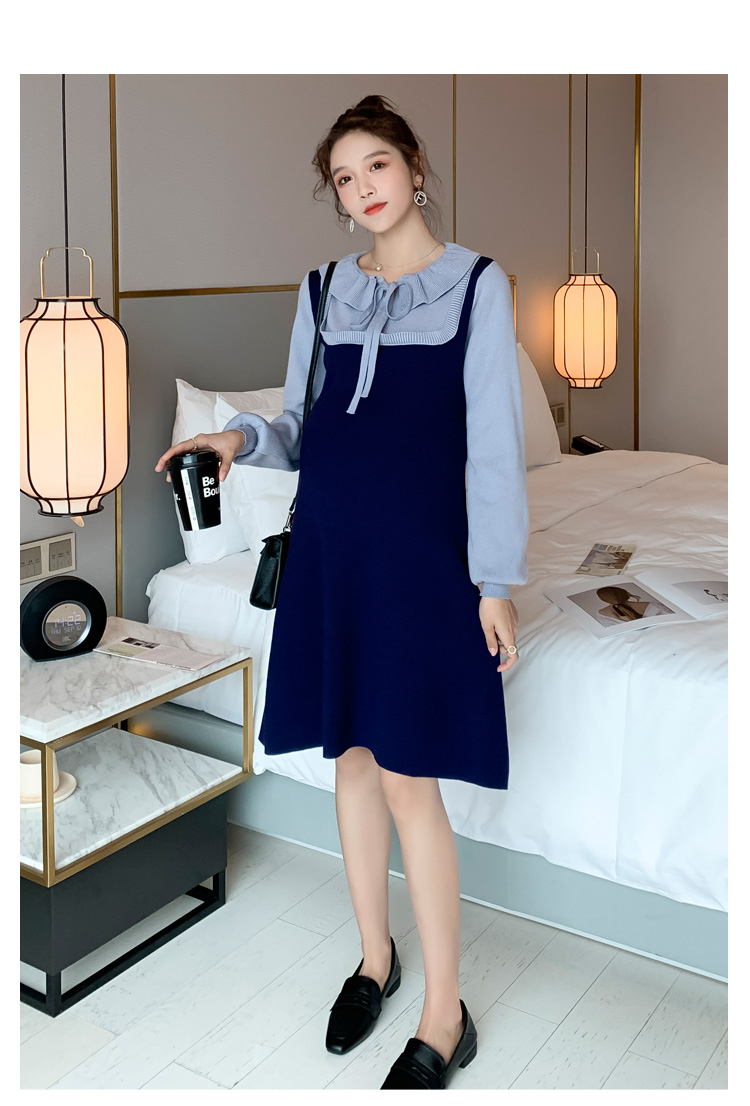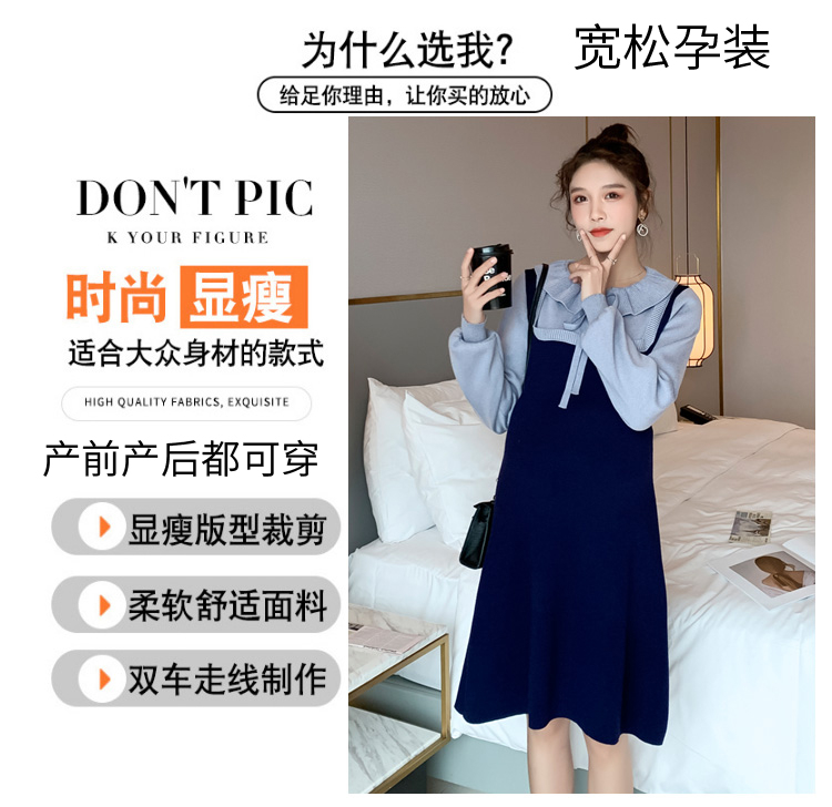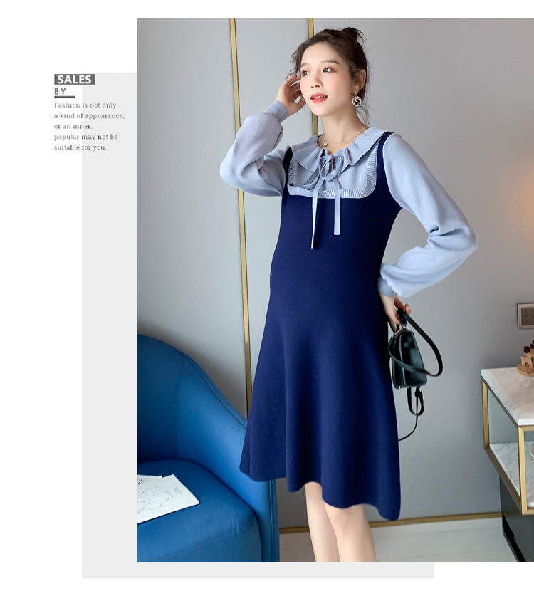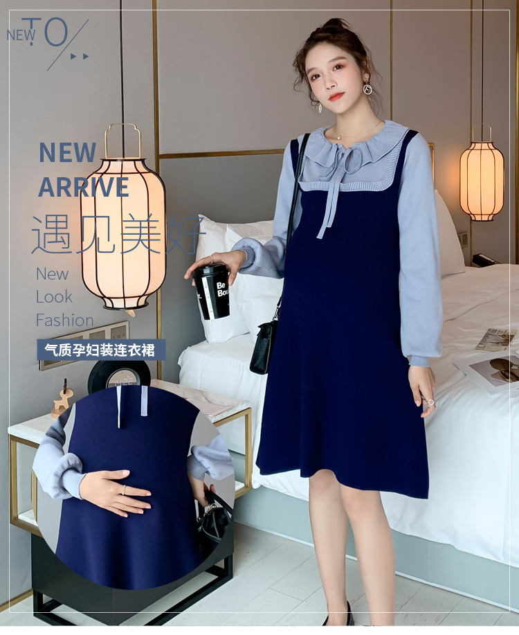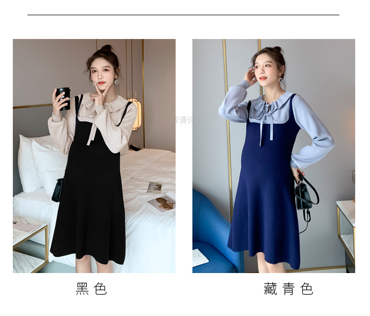 实拍现货2020秋冬新款孕妇法式小众木耳边系带胖mm针织拼接假两件大码连衣裙