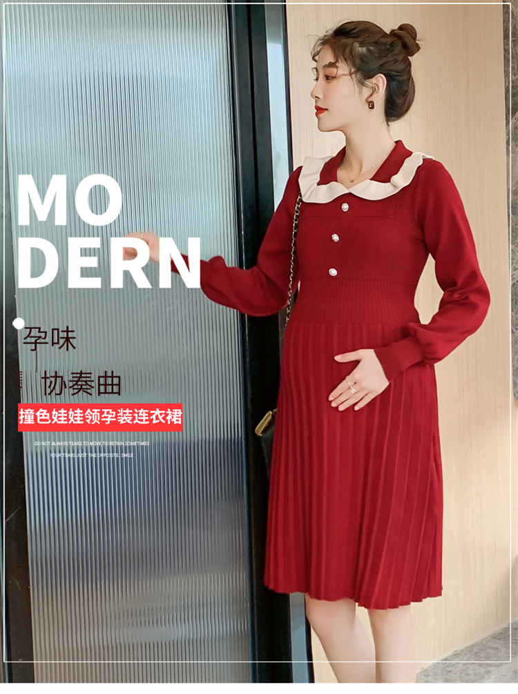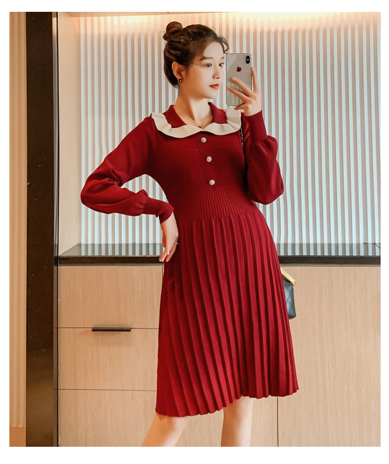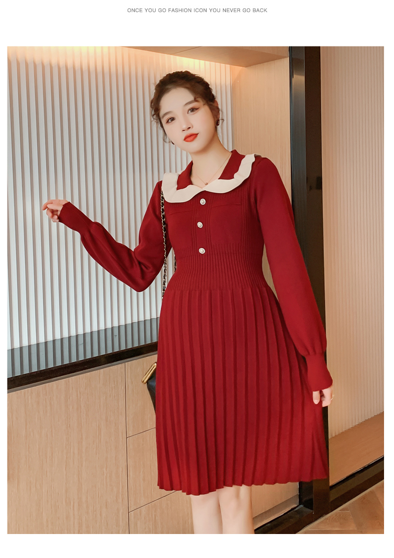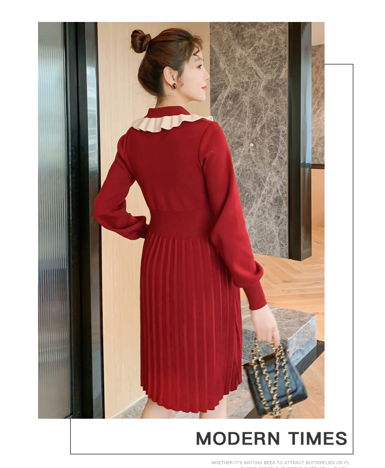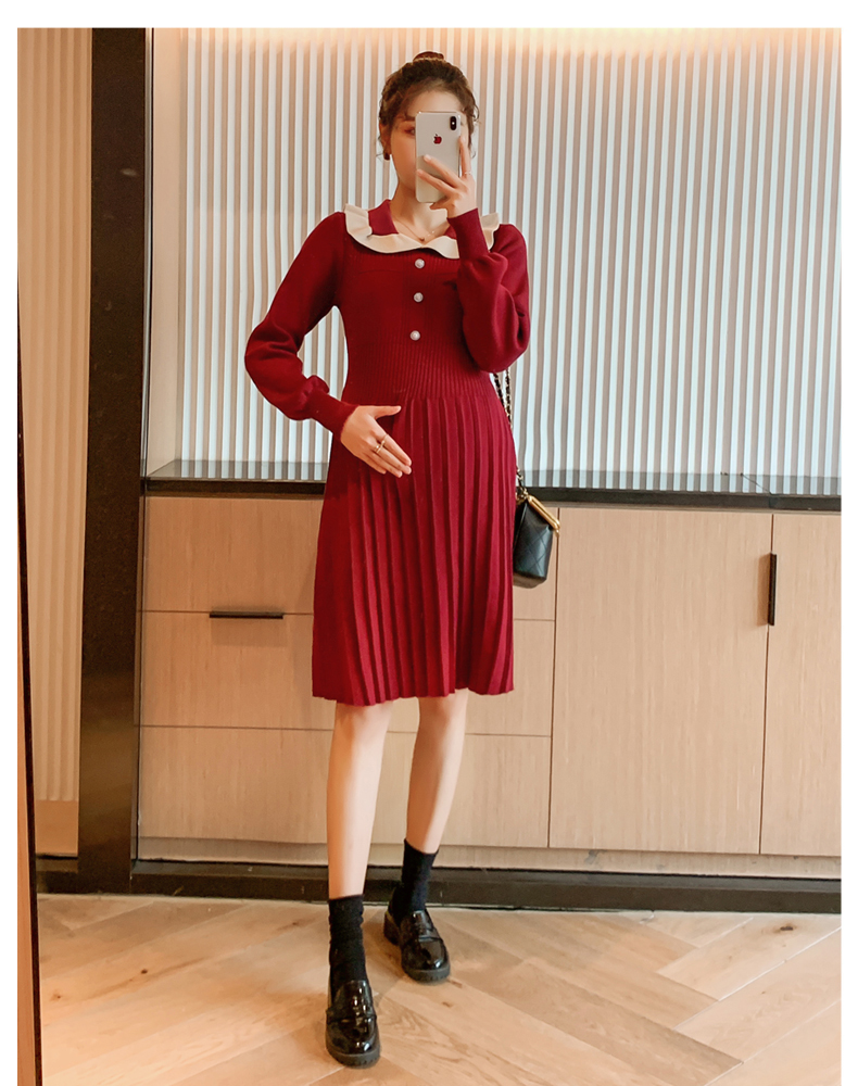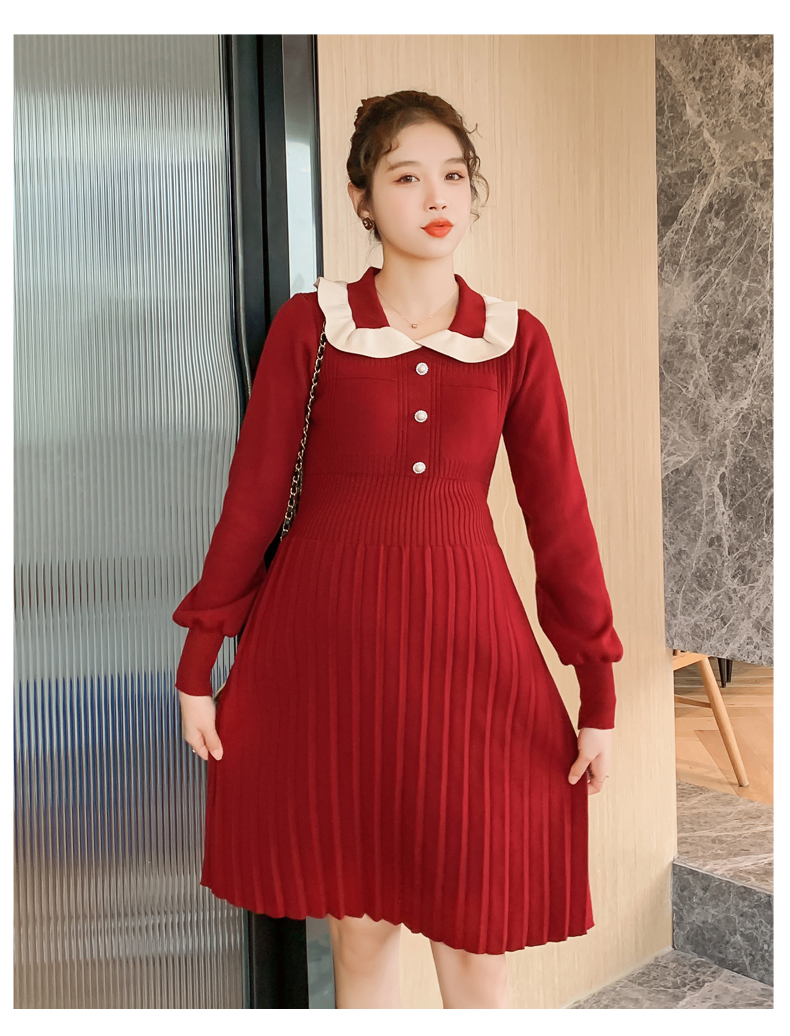 实拍现货2021新款孕妇圣诞红色高品质甜美公主范荷叶领百褶针织裙胖mm大码网红毛衣连衣裙