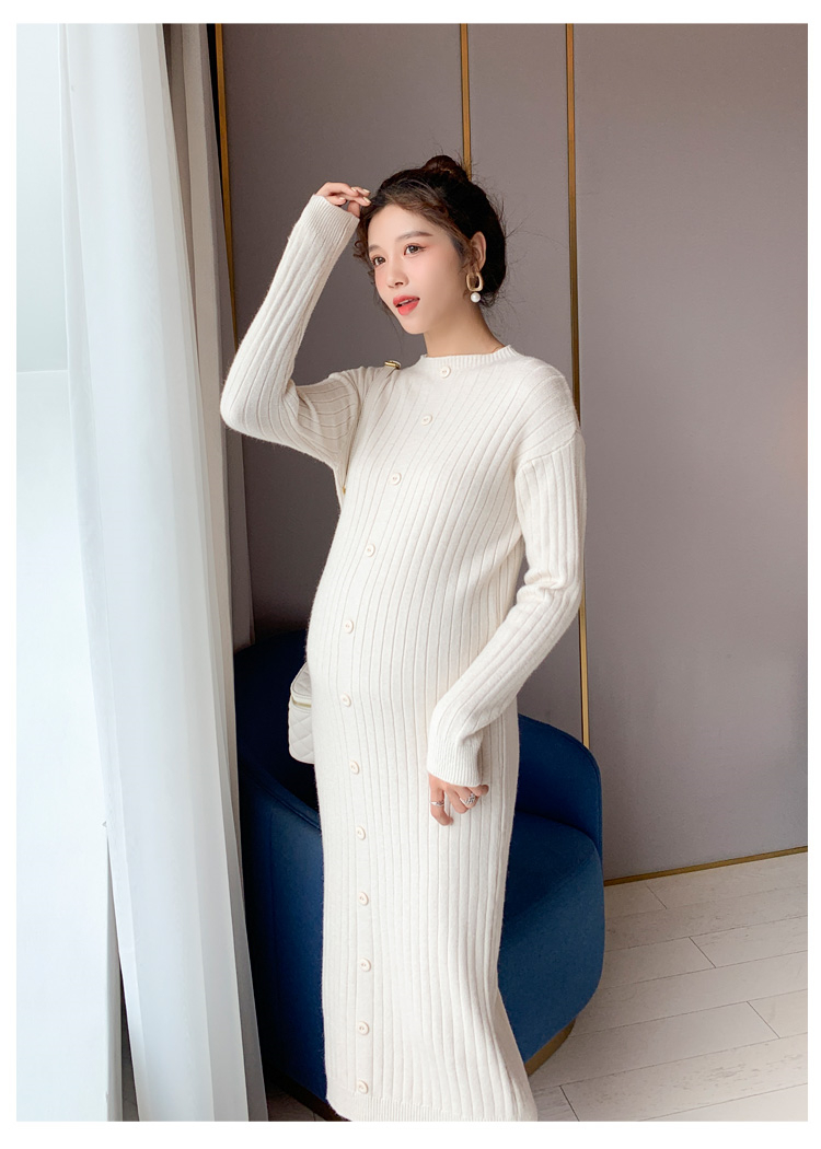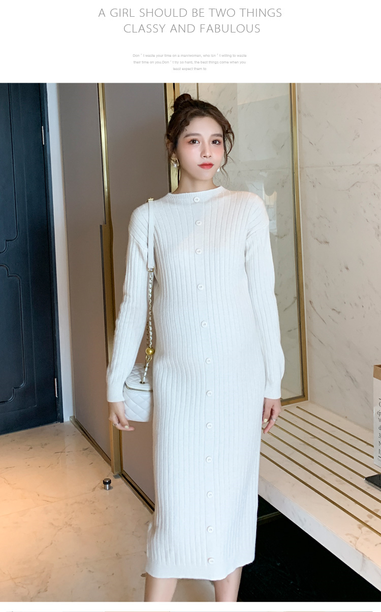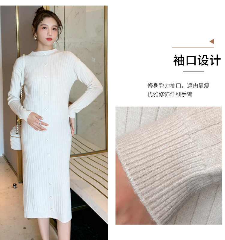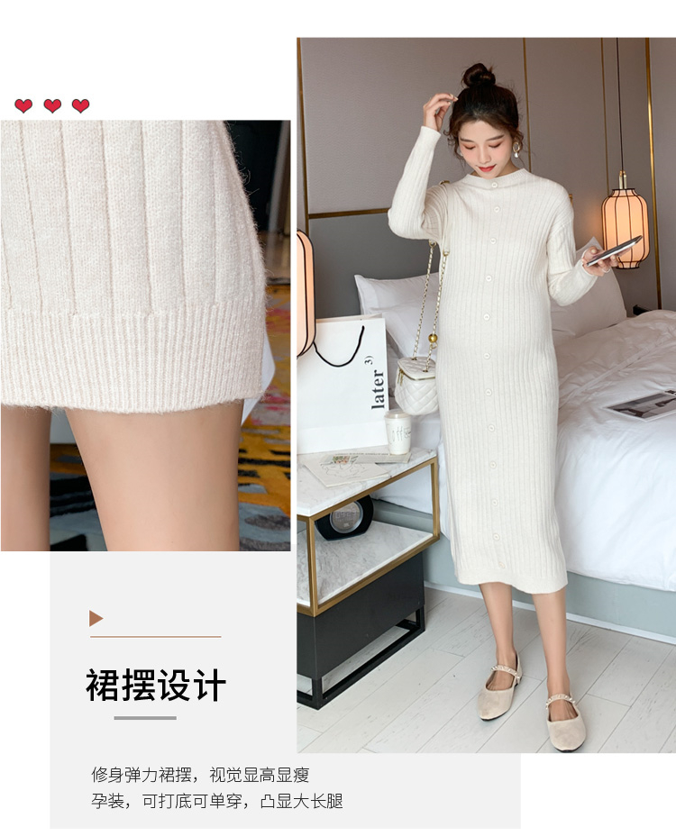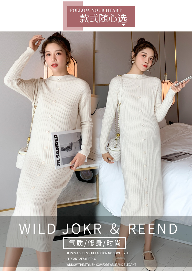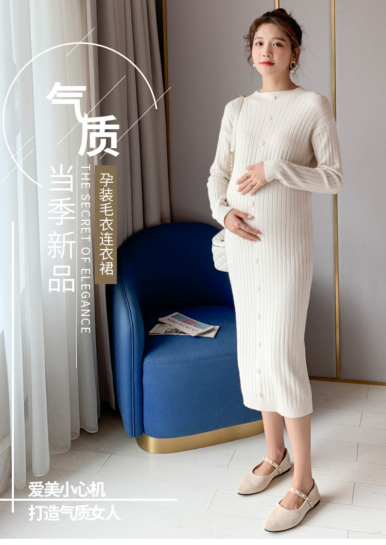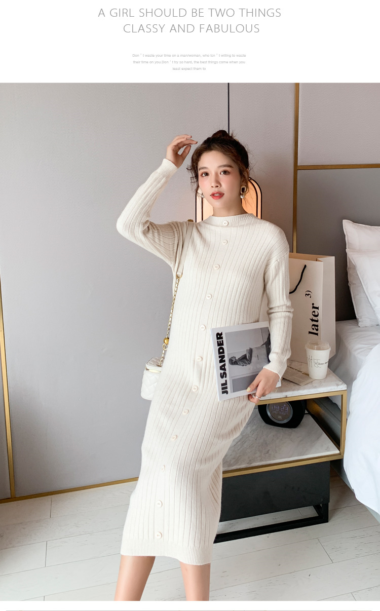 实拍现货2020秋冬新款孕妇半高领过膝气质复古单排扣百搭毛衣裙