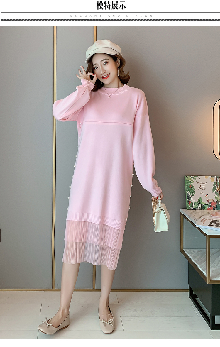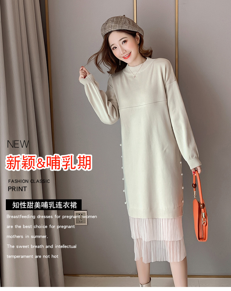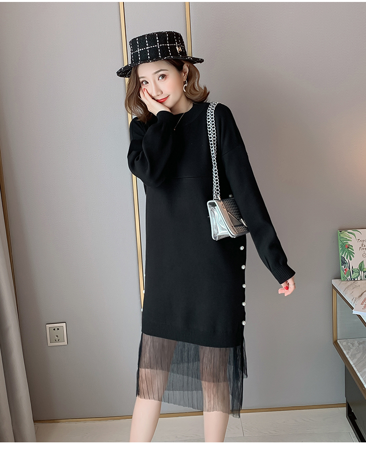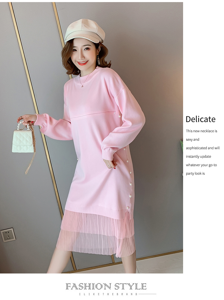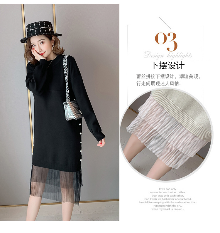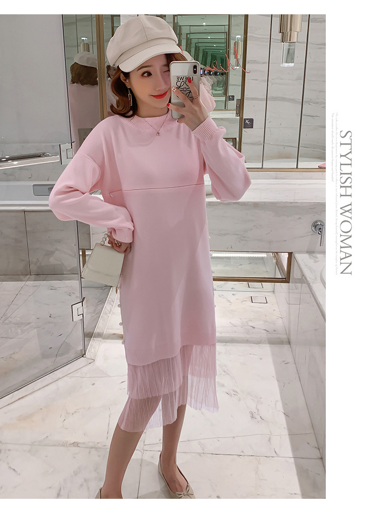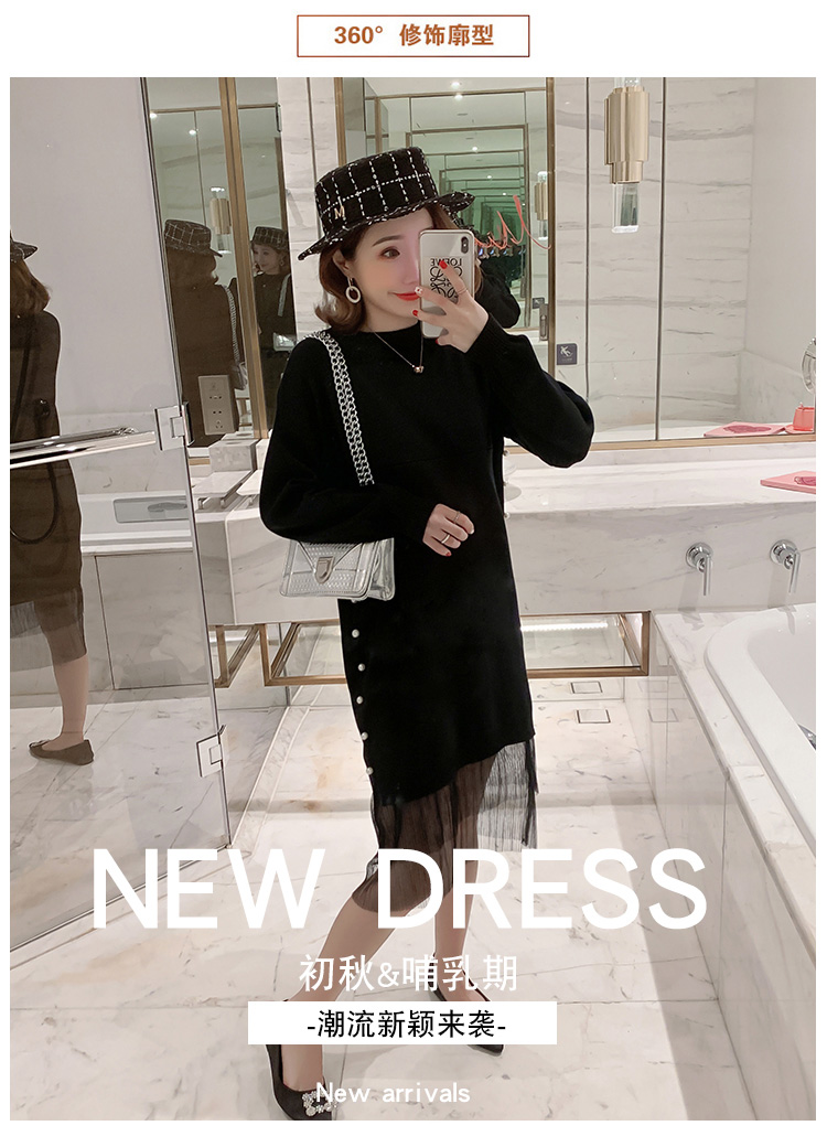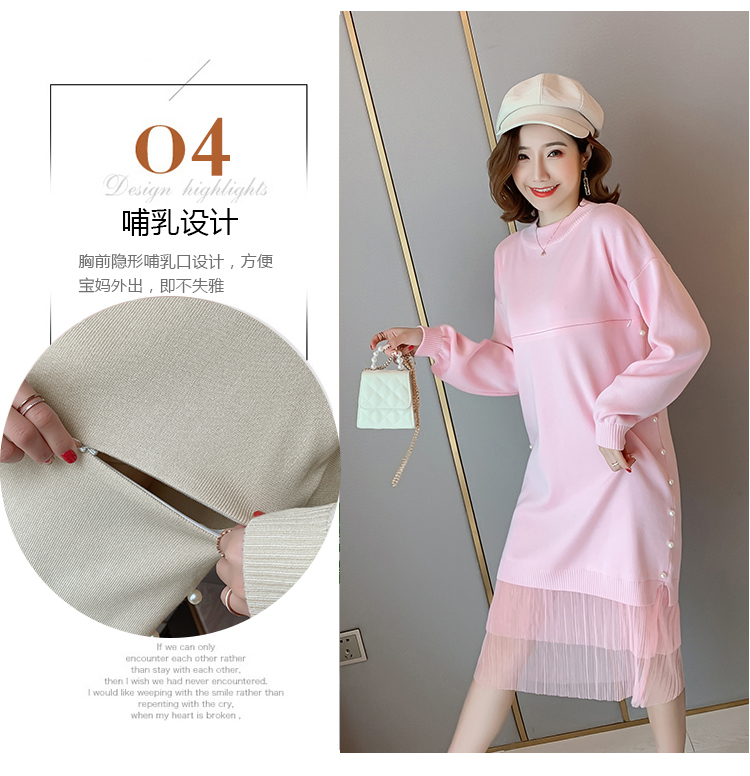 实拍9903#哺乳毛衣甜美网纱拼接针织打底衫产后钉珠喂奶连衣裙潮