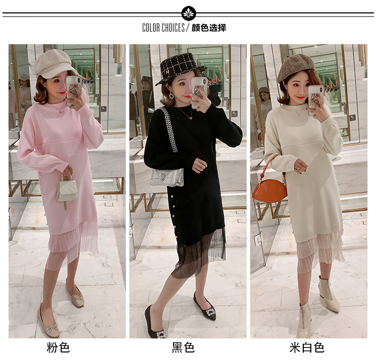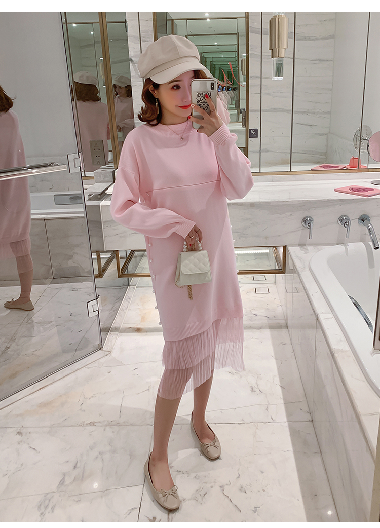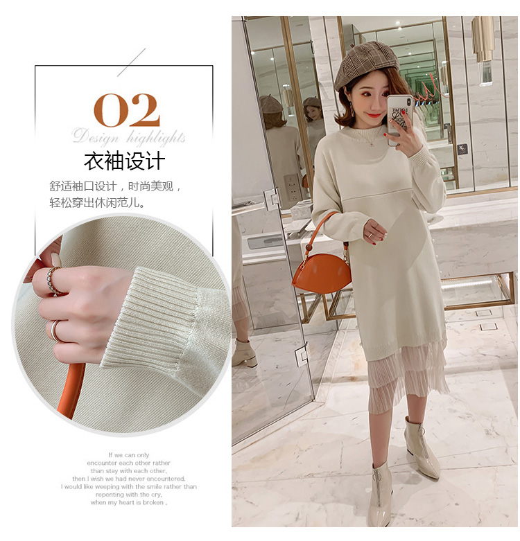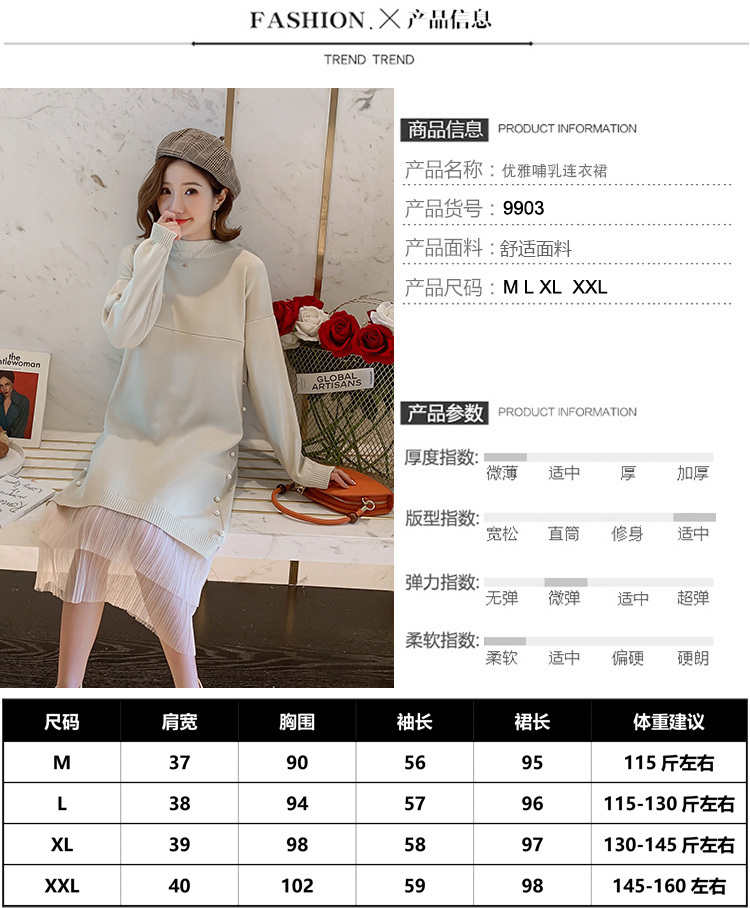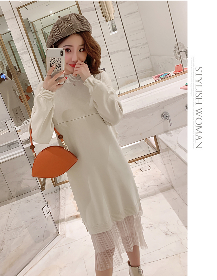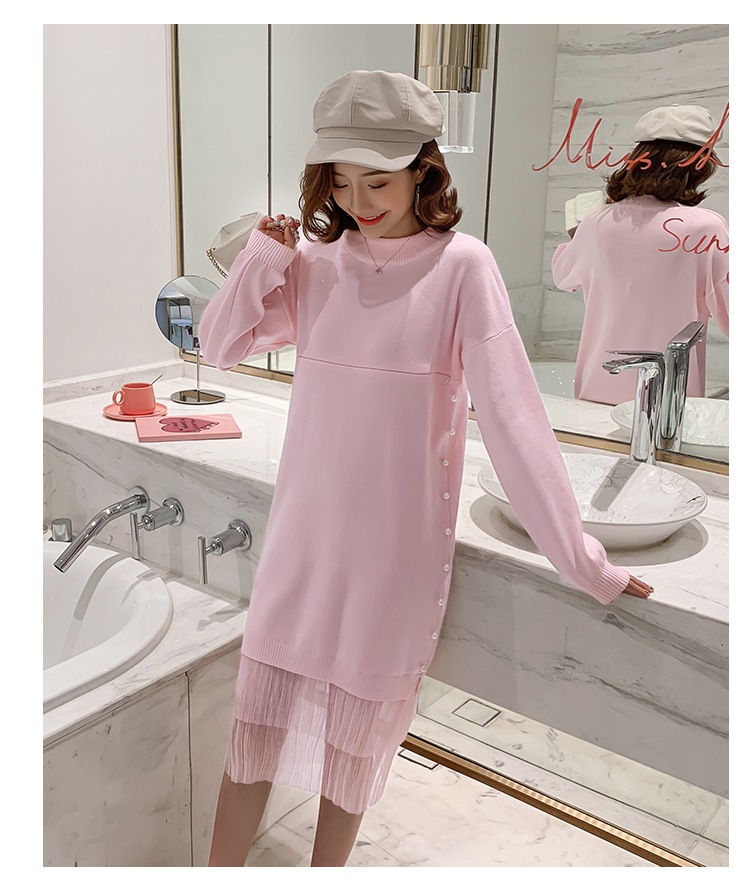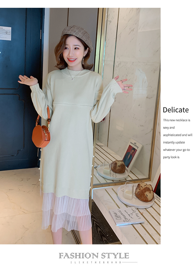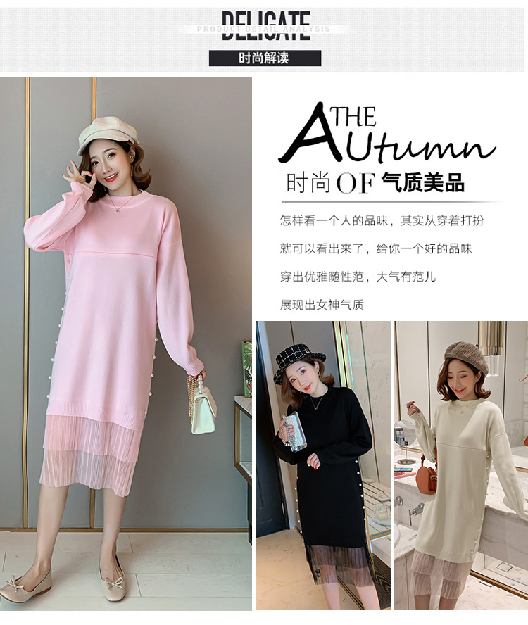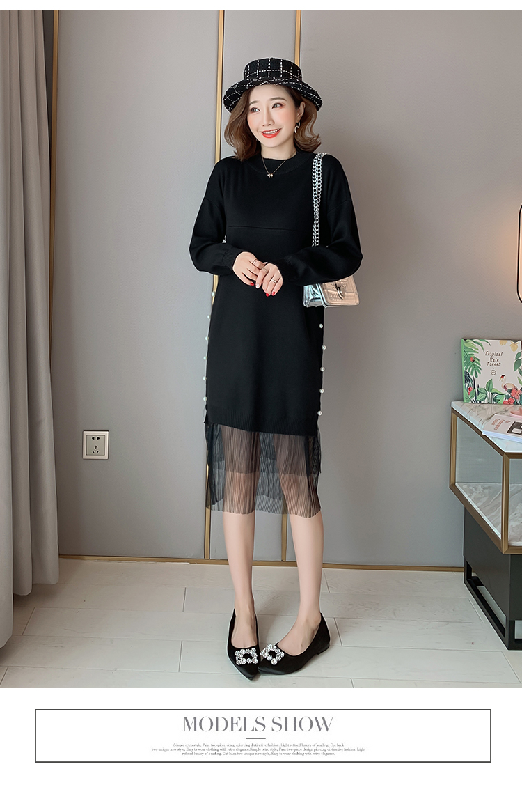 实拍9903#哺乳毛衣甜美网纱拼接针织打底衫产后钉珠喂奶连衣裙潮