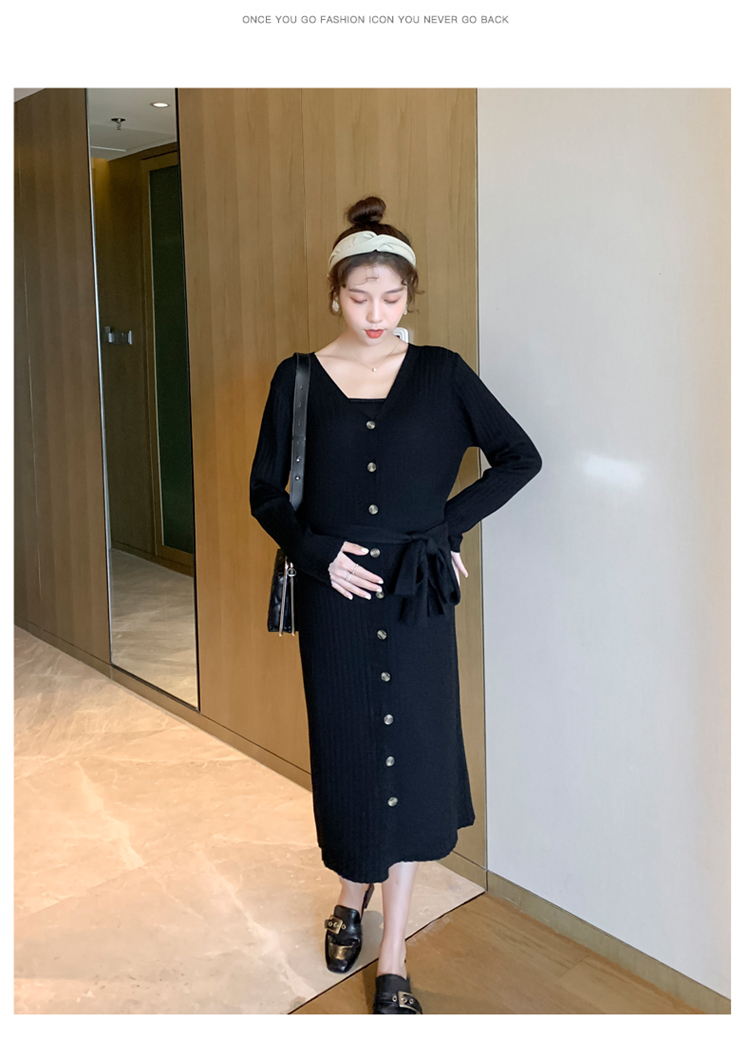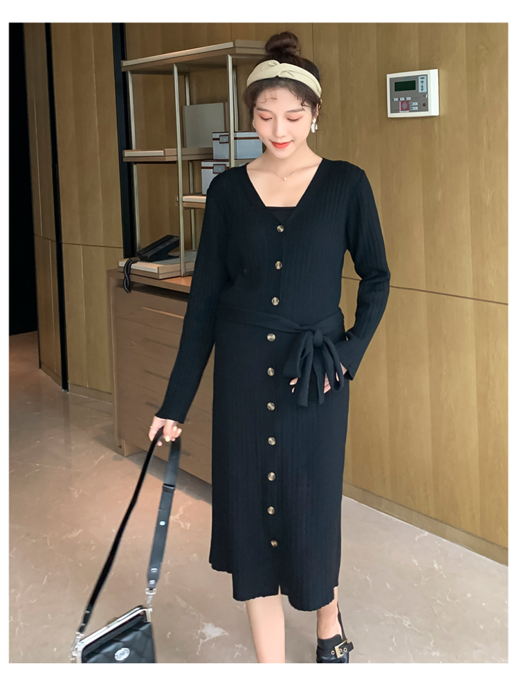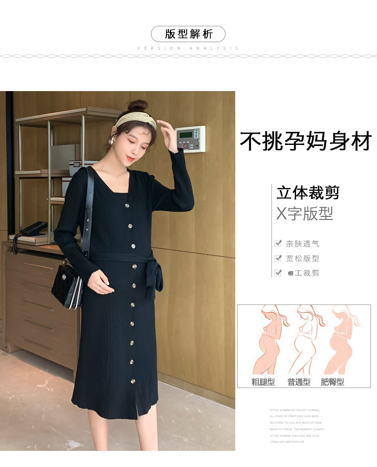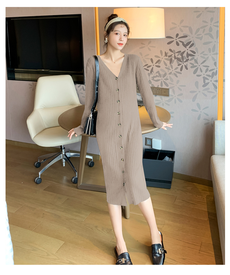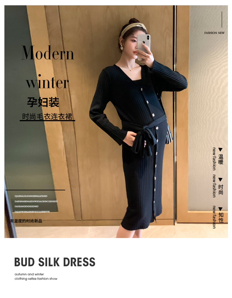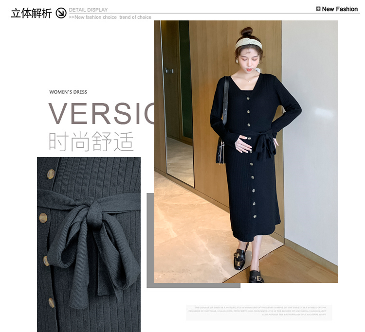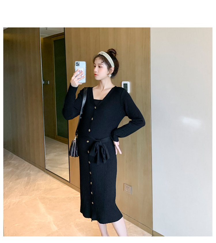 实拍现货2020秋冬新款孕妇法式单排扣V领可开扣哺乳很仙的针织大码毛衣裙