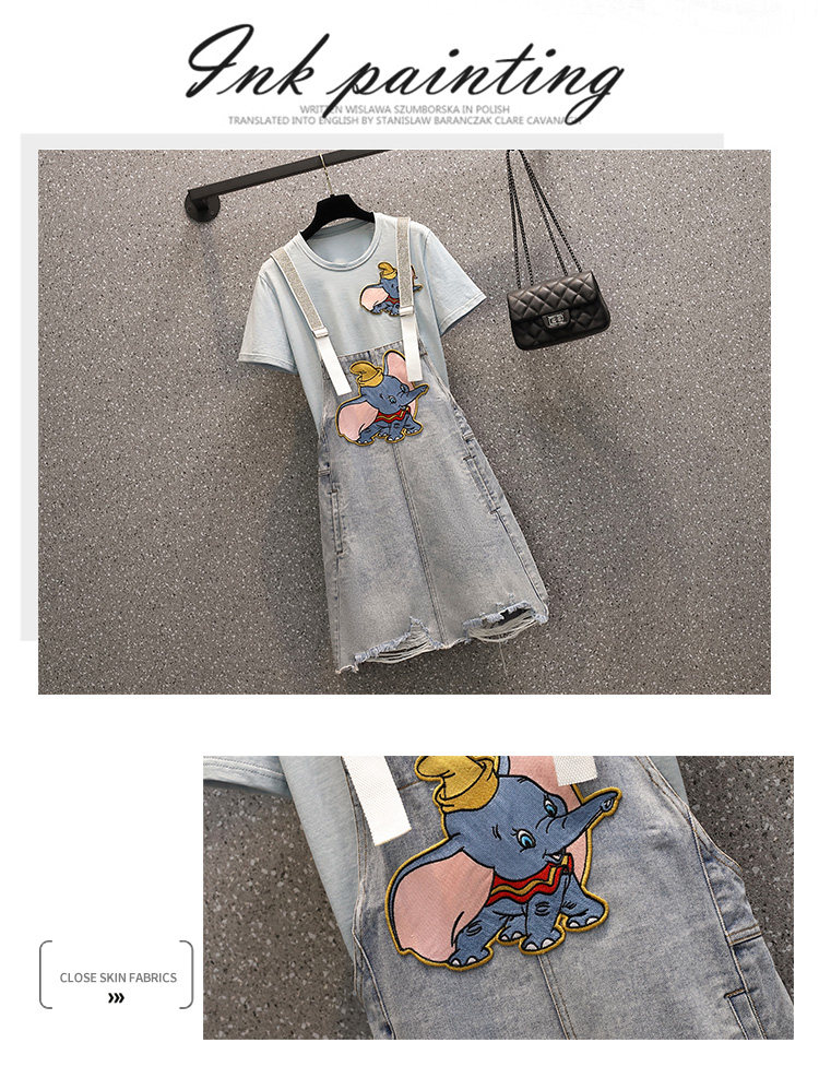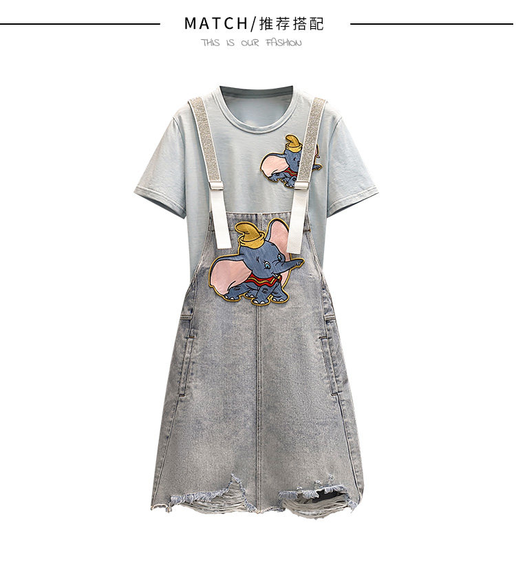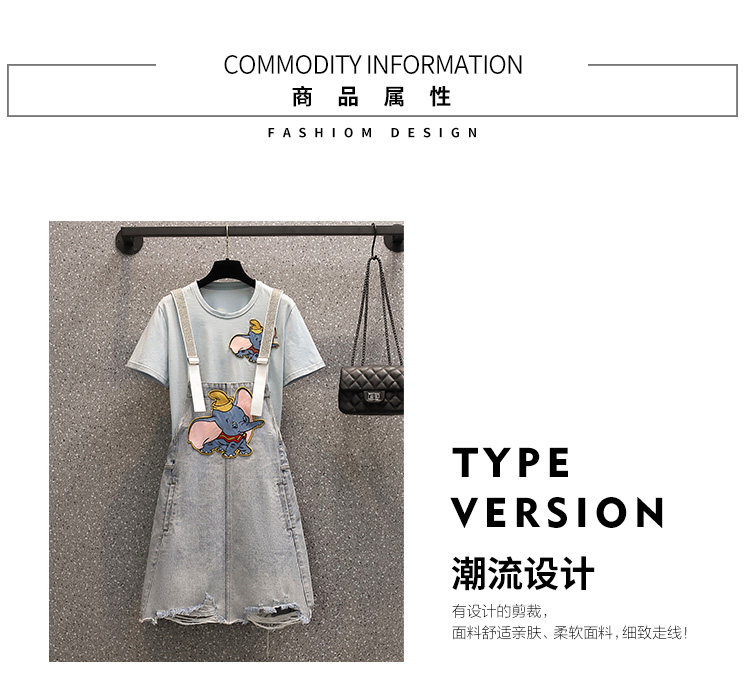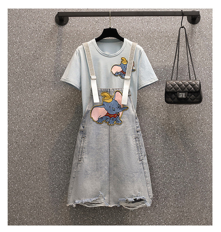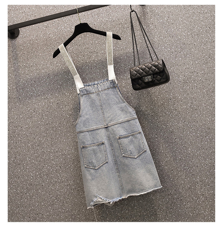 实拍2021大码女装新款胖妹妹遮肉夏季显瘦牛仔背带连衣裙套装