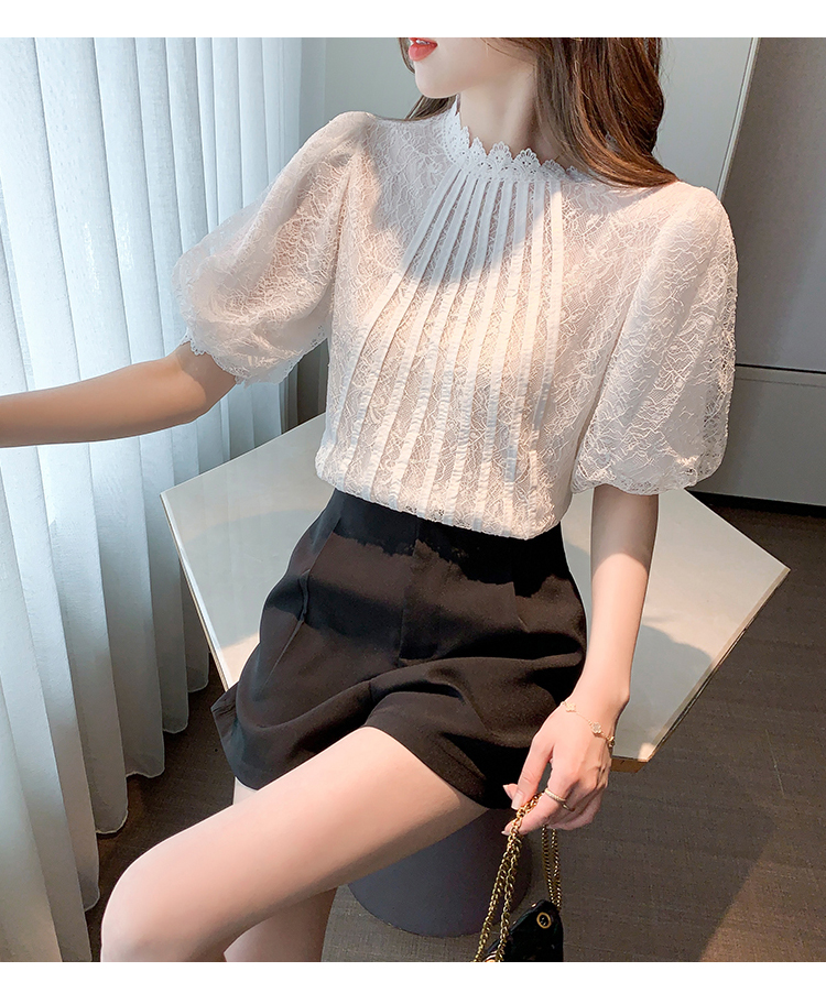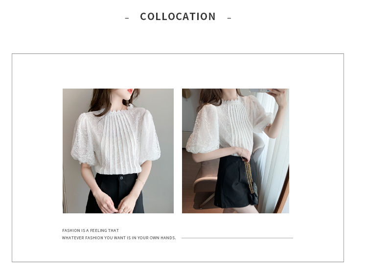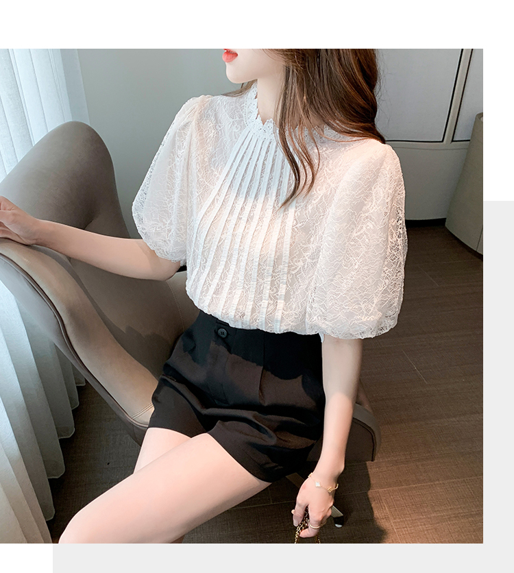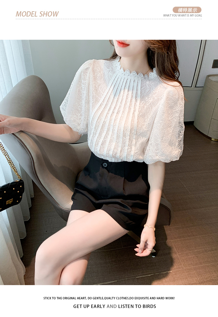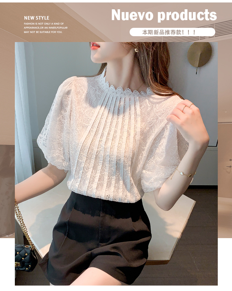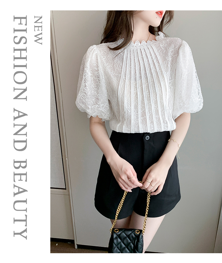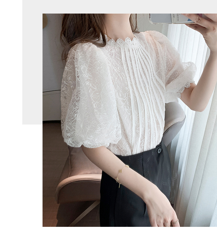 实拍2021夏季新款韩版百搭灯笼袖圆领短袖蕾丝衫女上衣夏