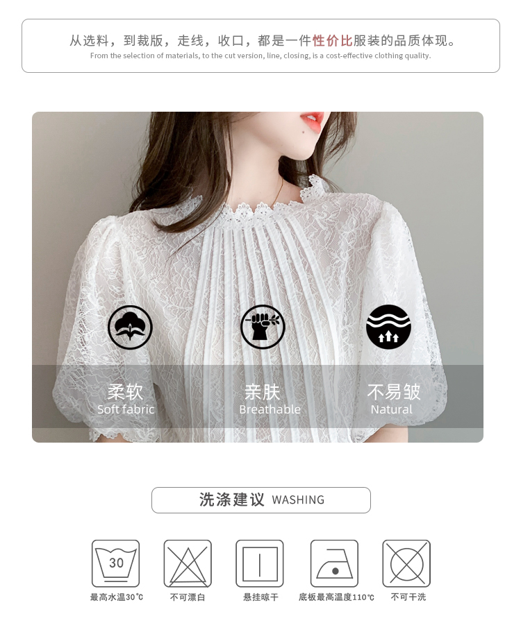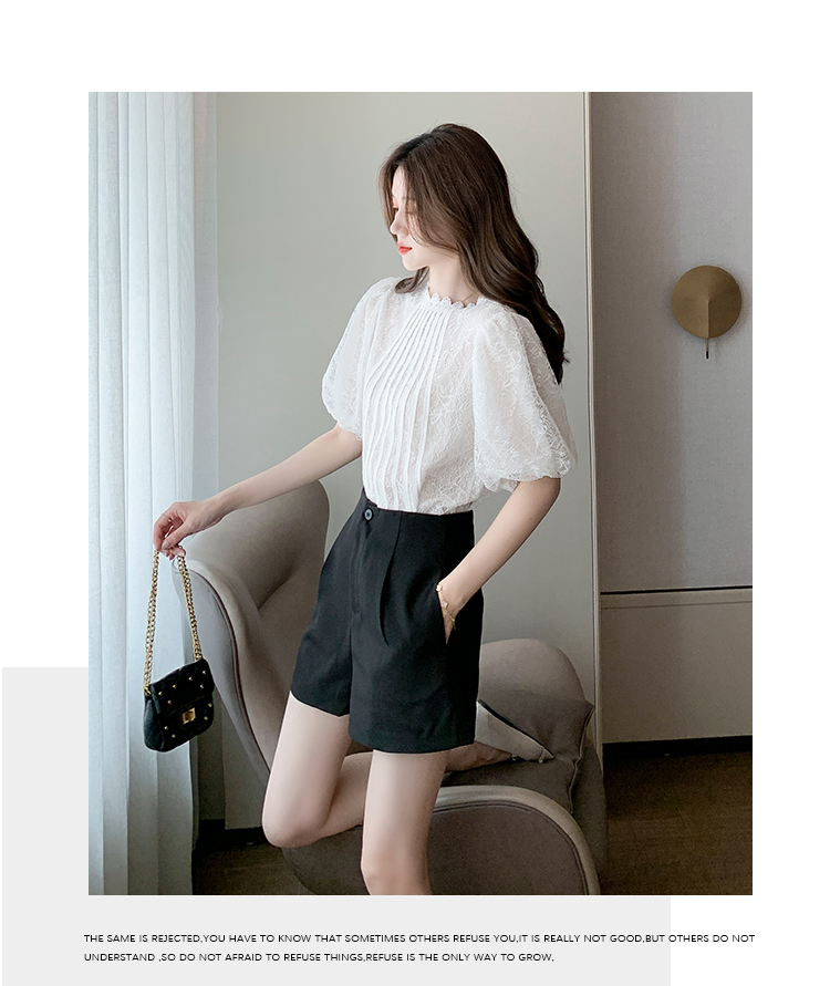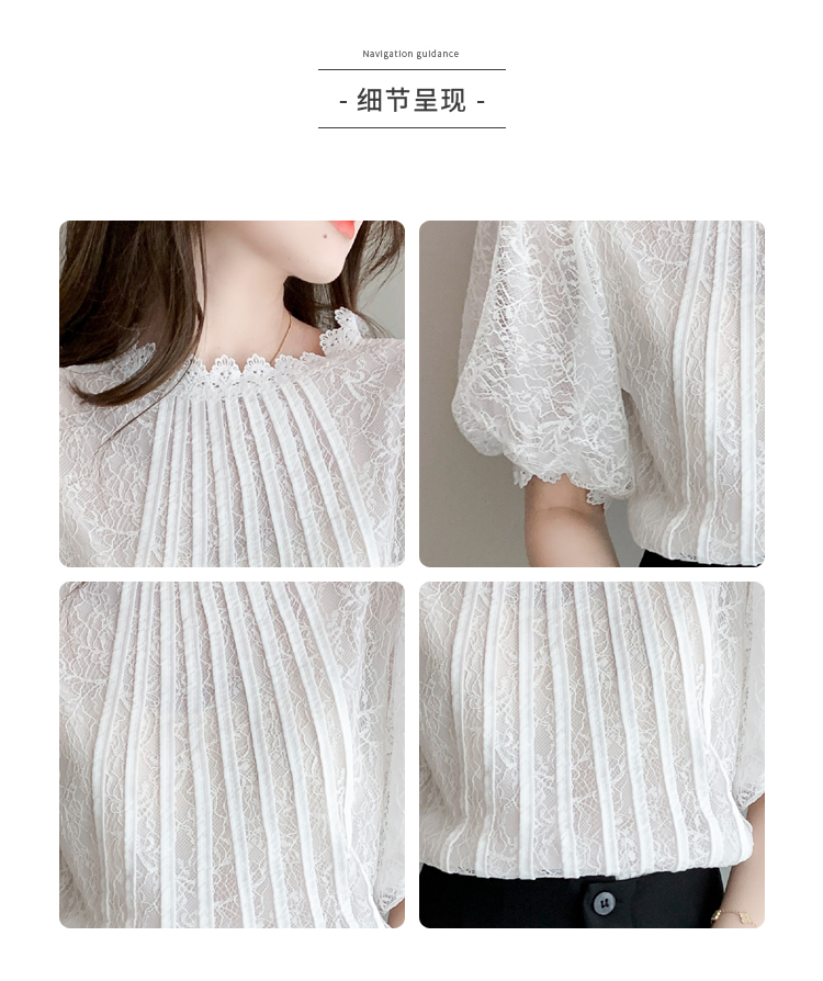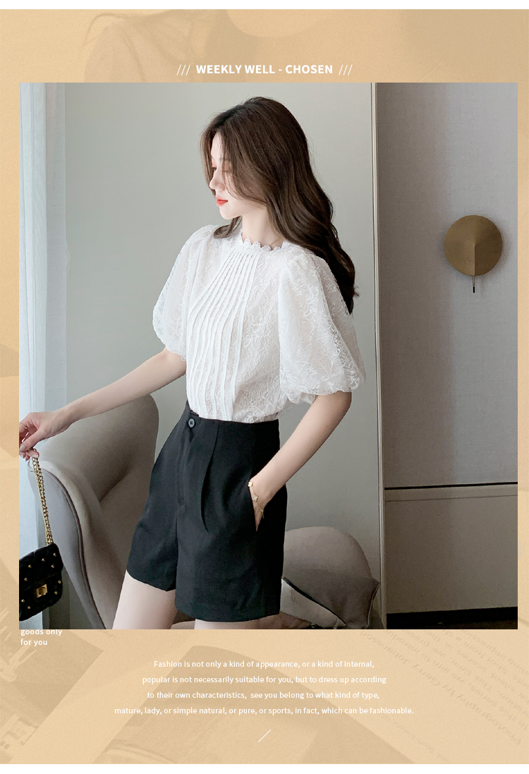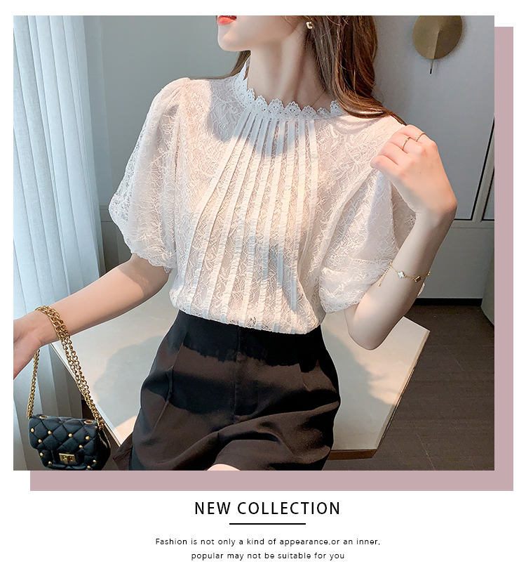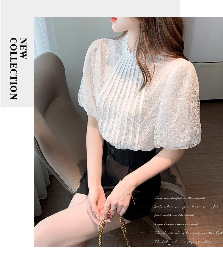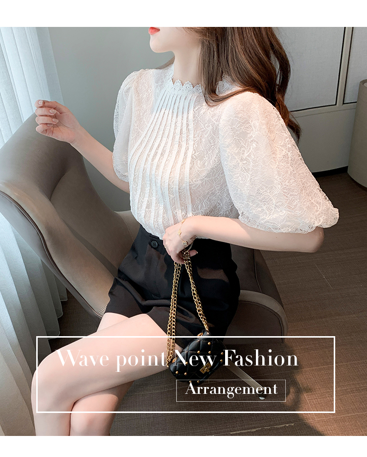 实拍2021夏季新款韩版百搭灯笼袖圆领短袖蕾丝衫女上衣夏