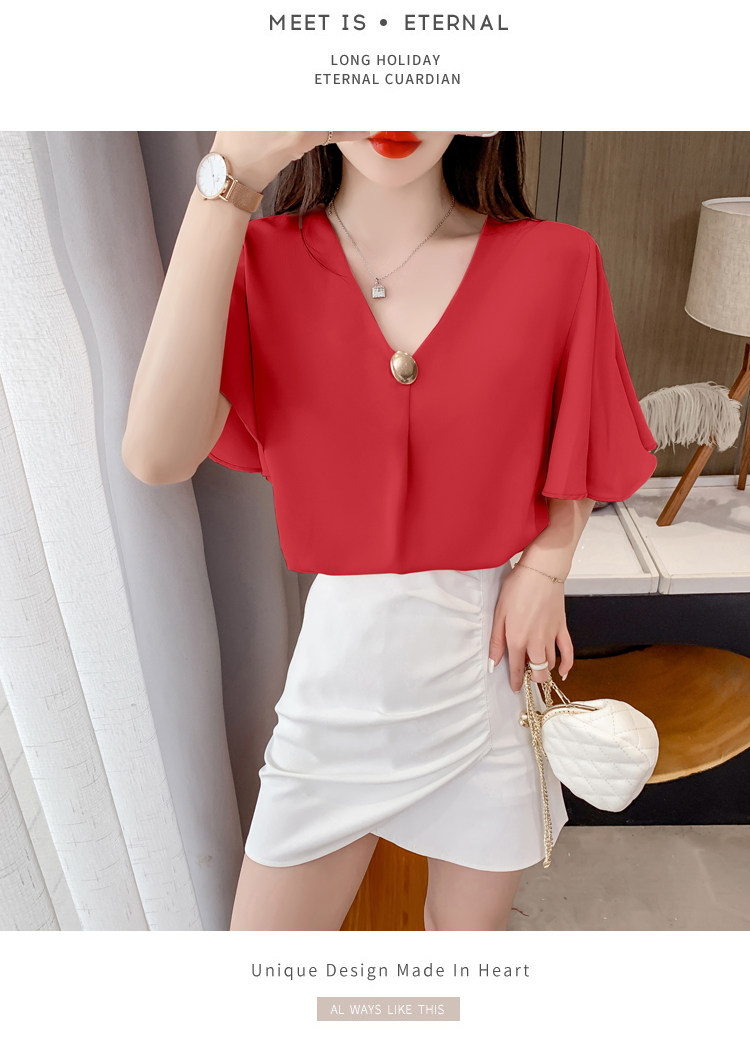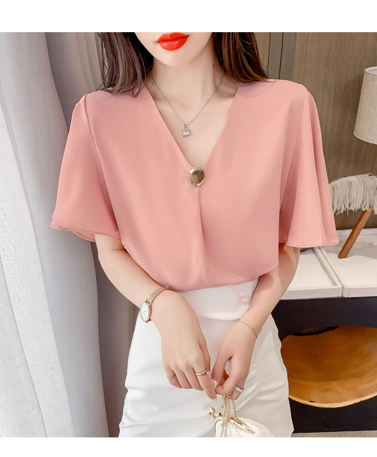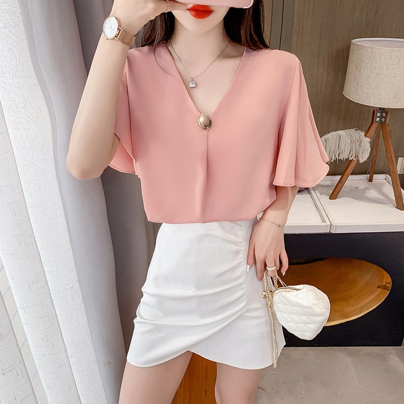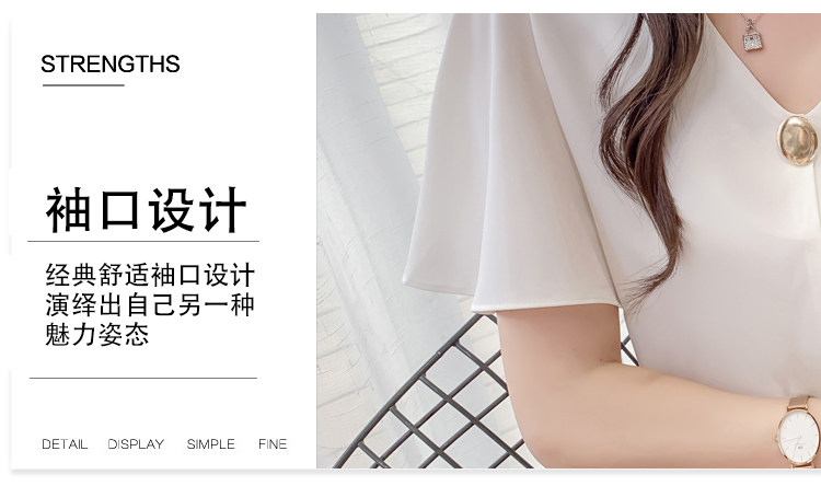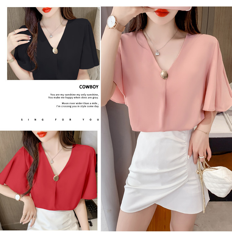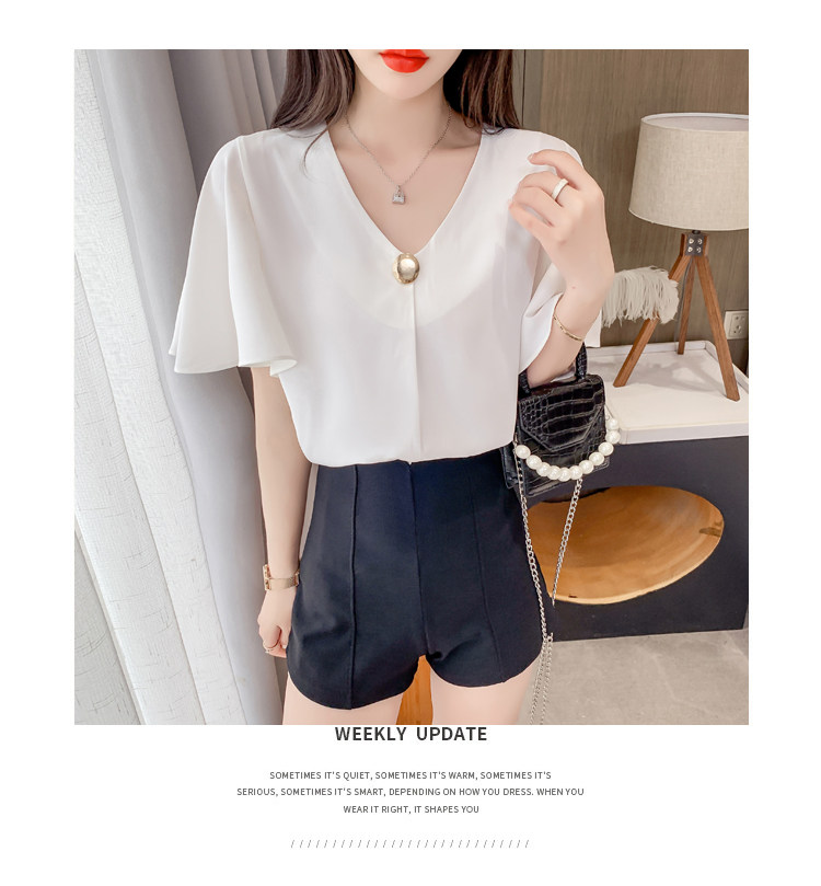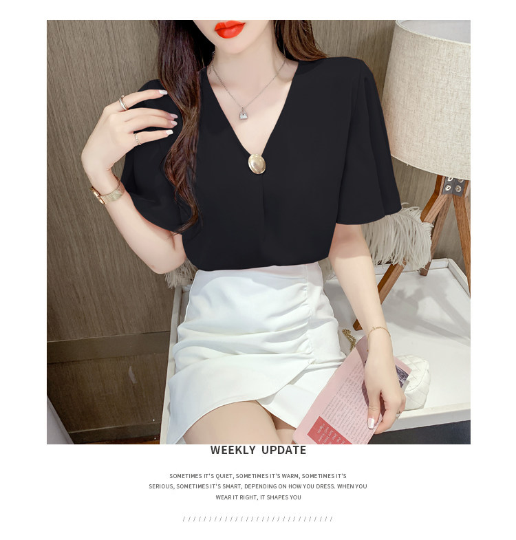 实拍 2021夏装新款韩版百搭V领设计感荷叶袖雪纺衫衬衫女上衣夏