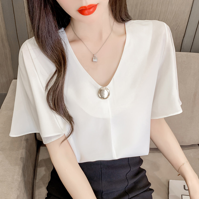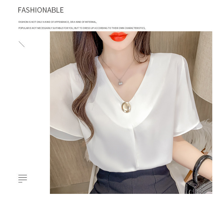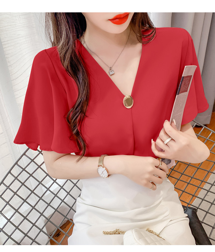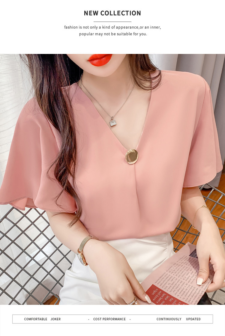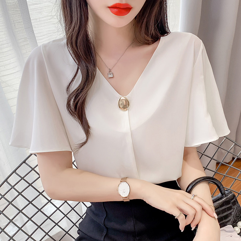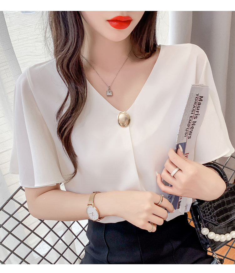 实拍 2021夏装新款韩版百搭V领设计感荷叶袖雪纺衫衬衫女上衣夏