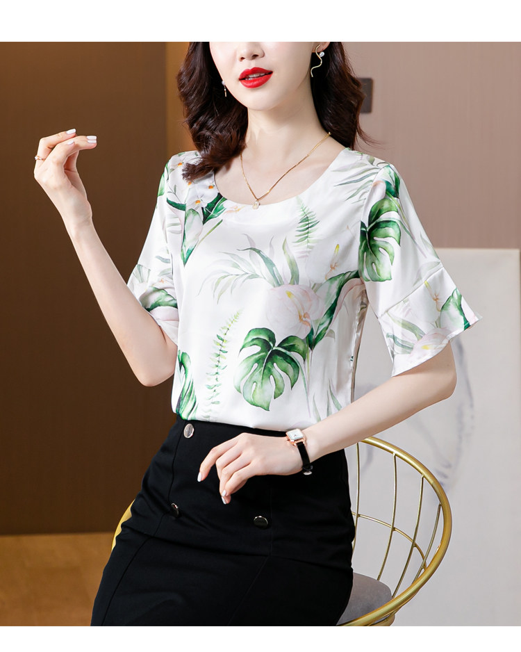 实拍妈妈装夏装仿真丝小衫时尚短袖T恤中年女装洋气夏上衣服