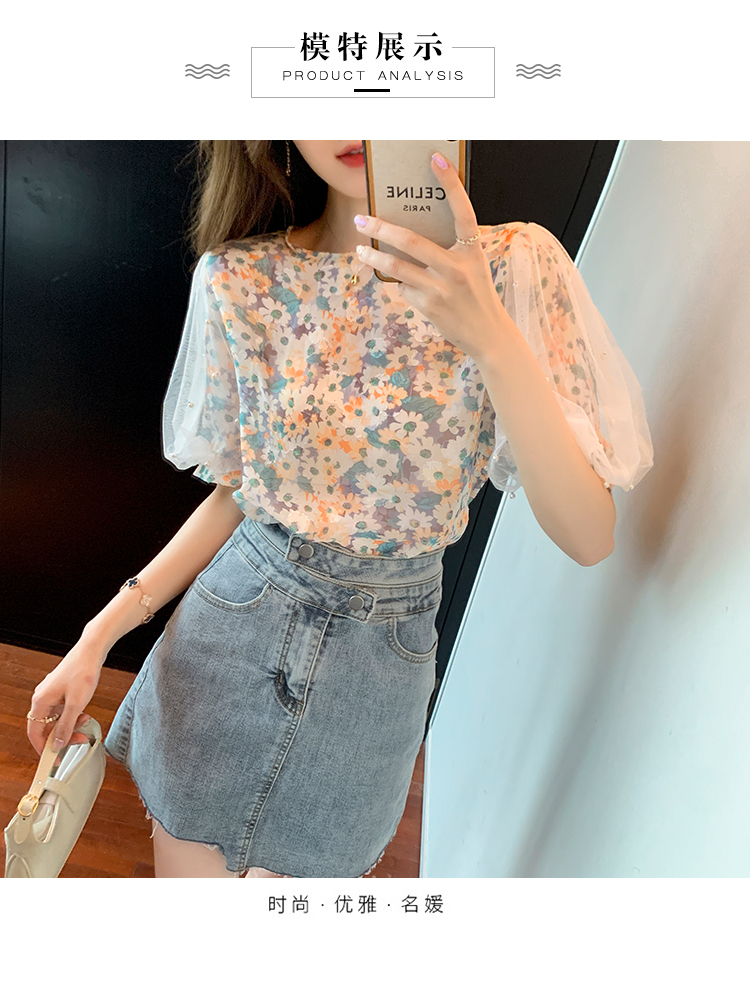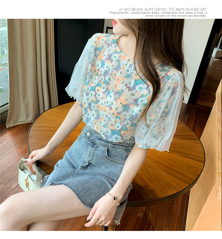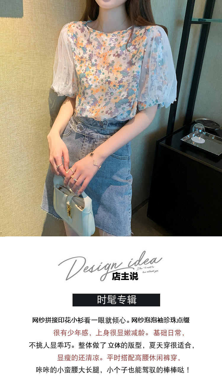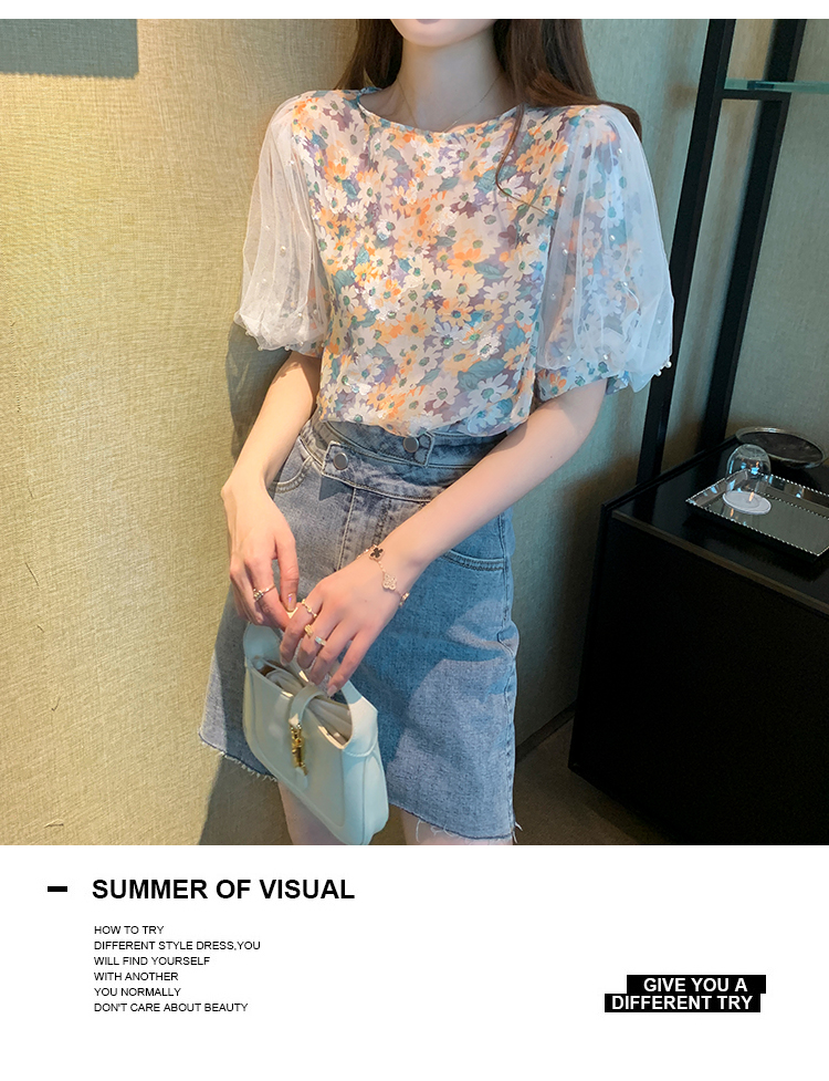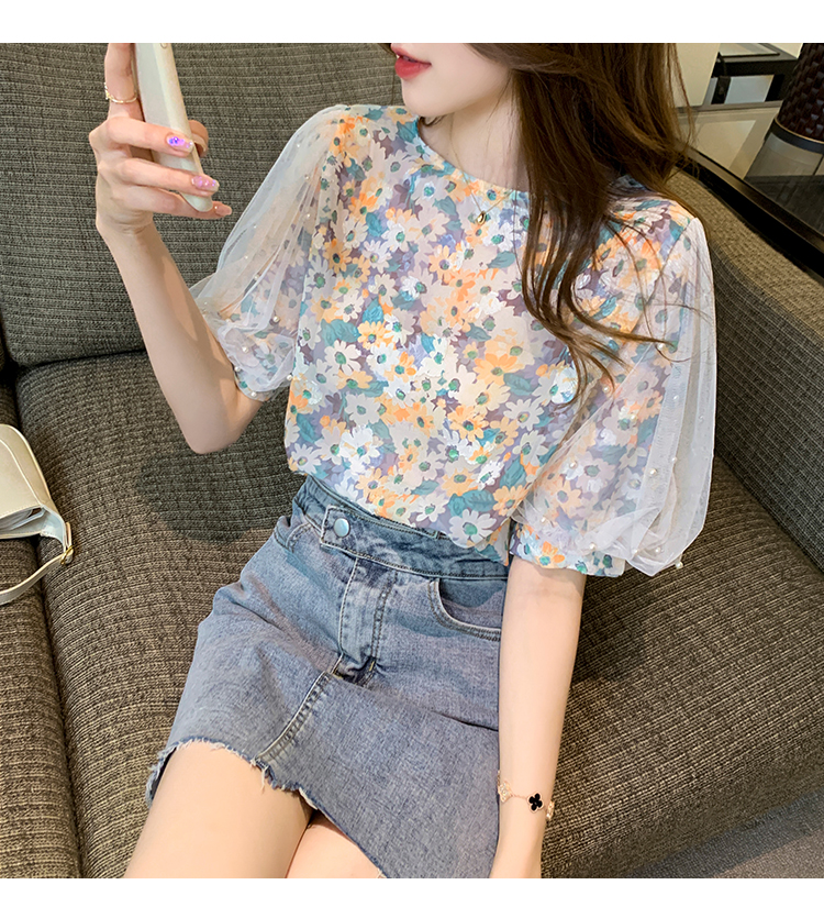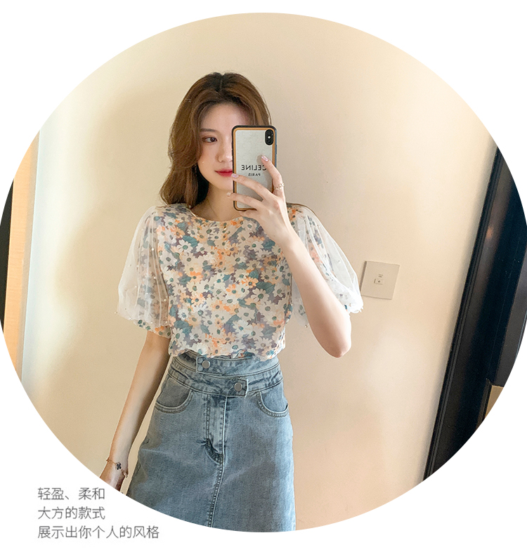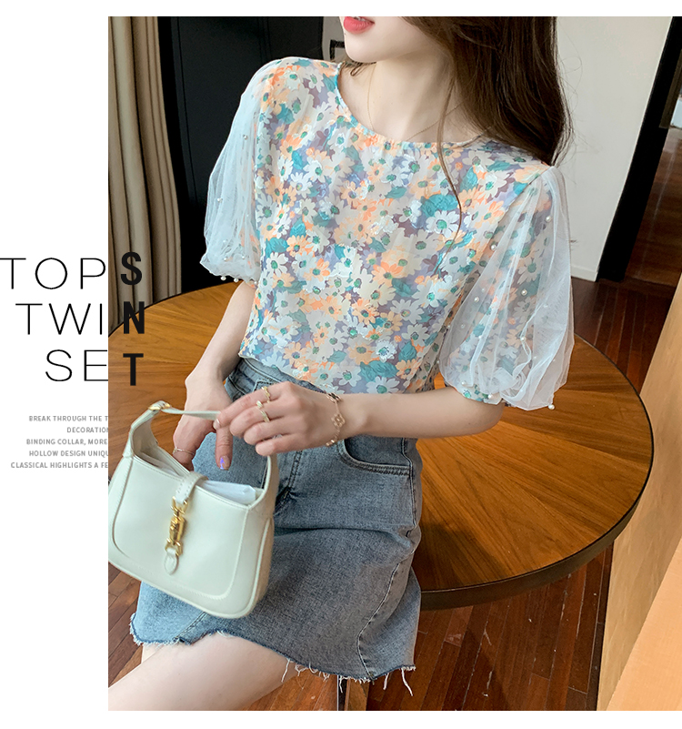 实拍现货好质量短袖钉珠网纱宽松泡泡袖上衣女百搭碎花网红t恤夏