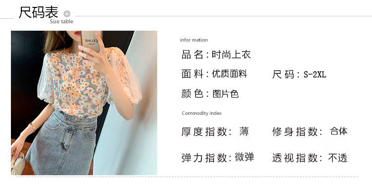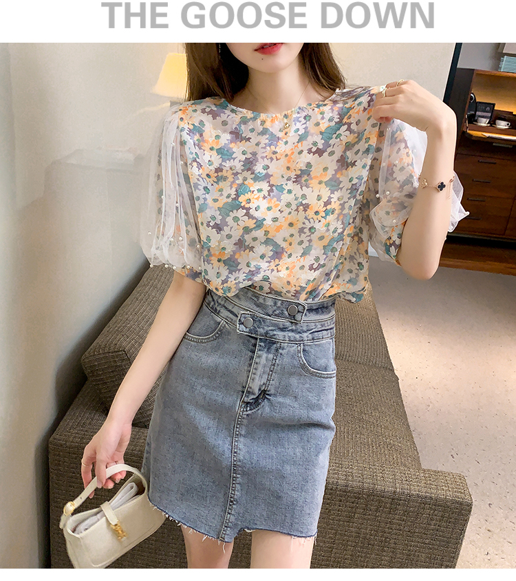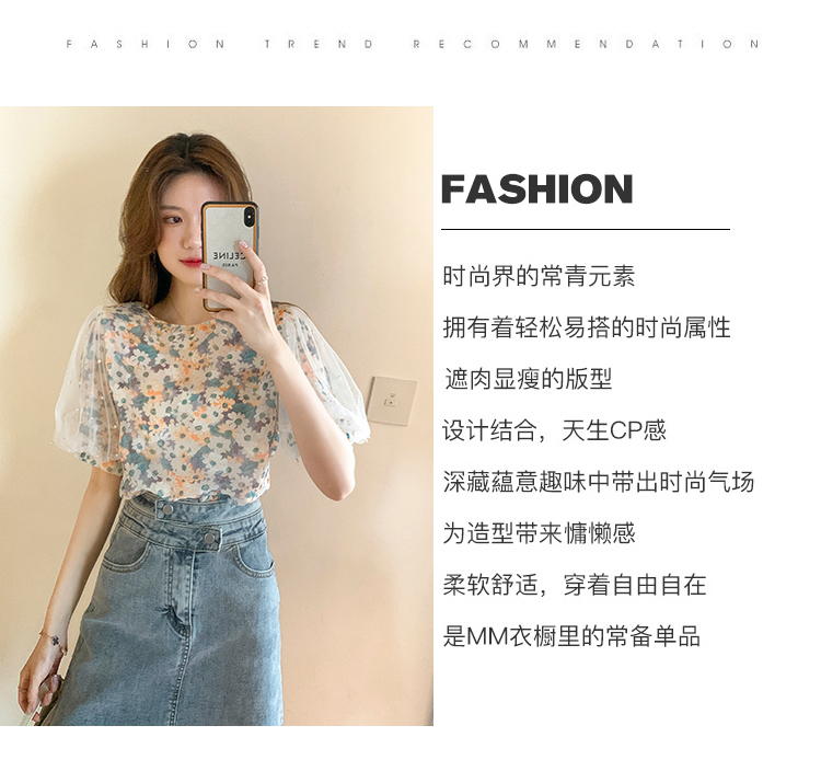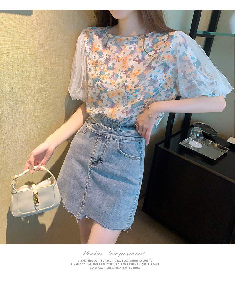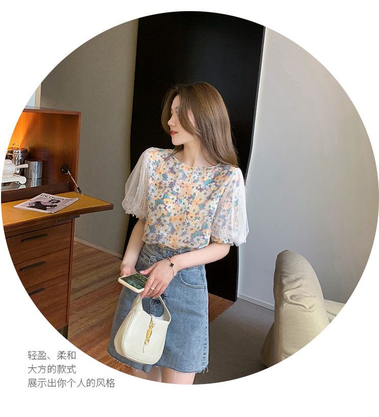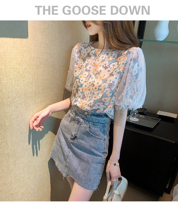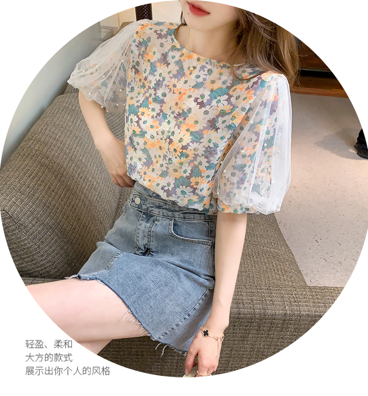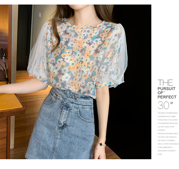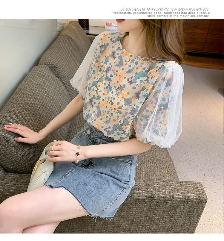 实拍现货好质量短袖钉珠网纱宽松泡泡袖上衣女百搭碎花网红t恤夏