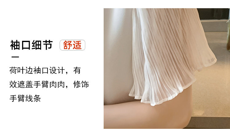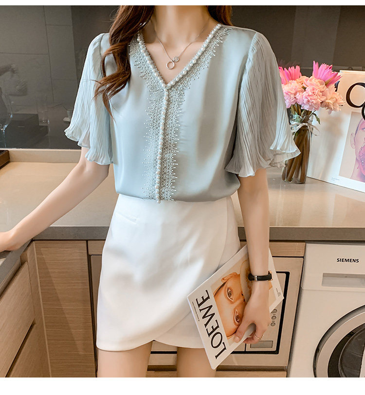 实拍~2021夏季新款珍珠花边V领仙气雪纺衫短袖