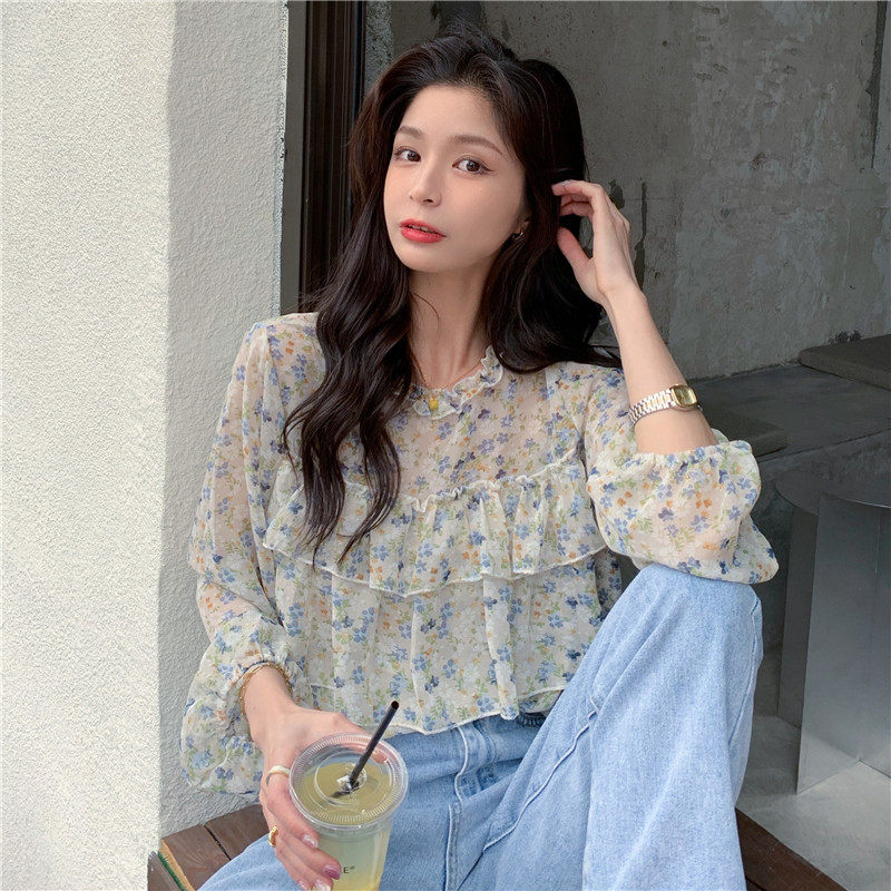 实拍实价~ 碎花荷叶边雪纺衫