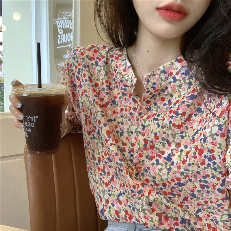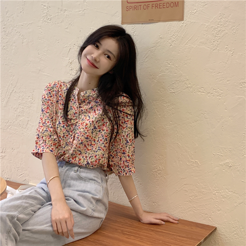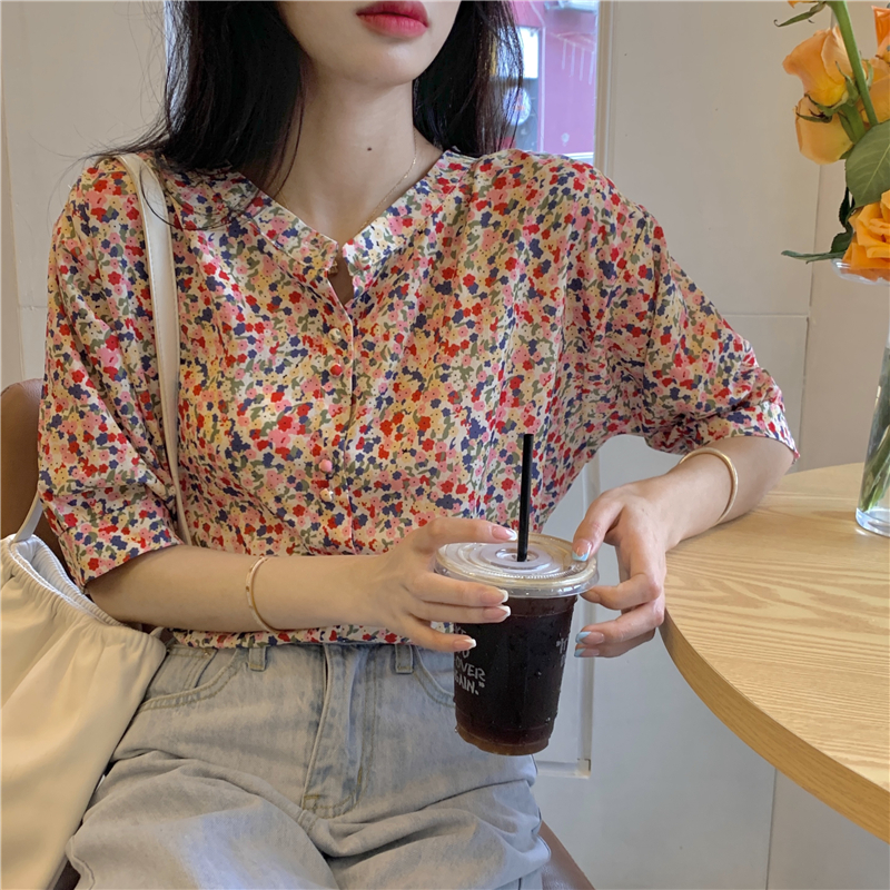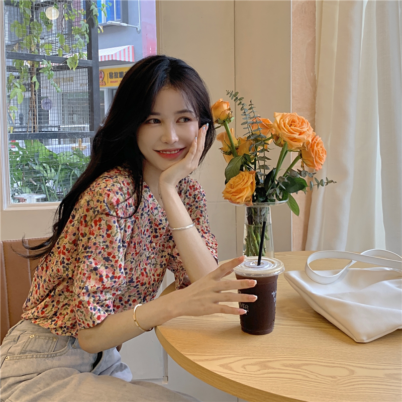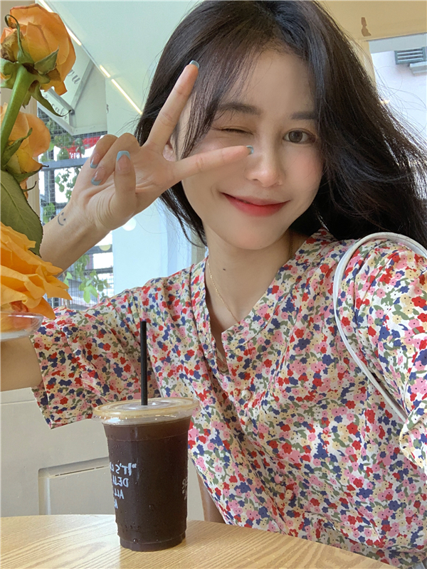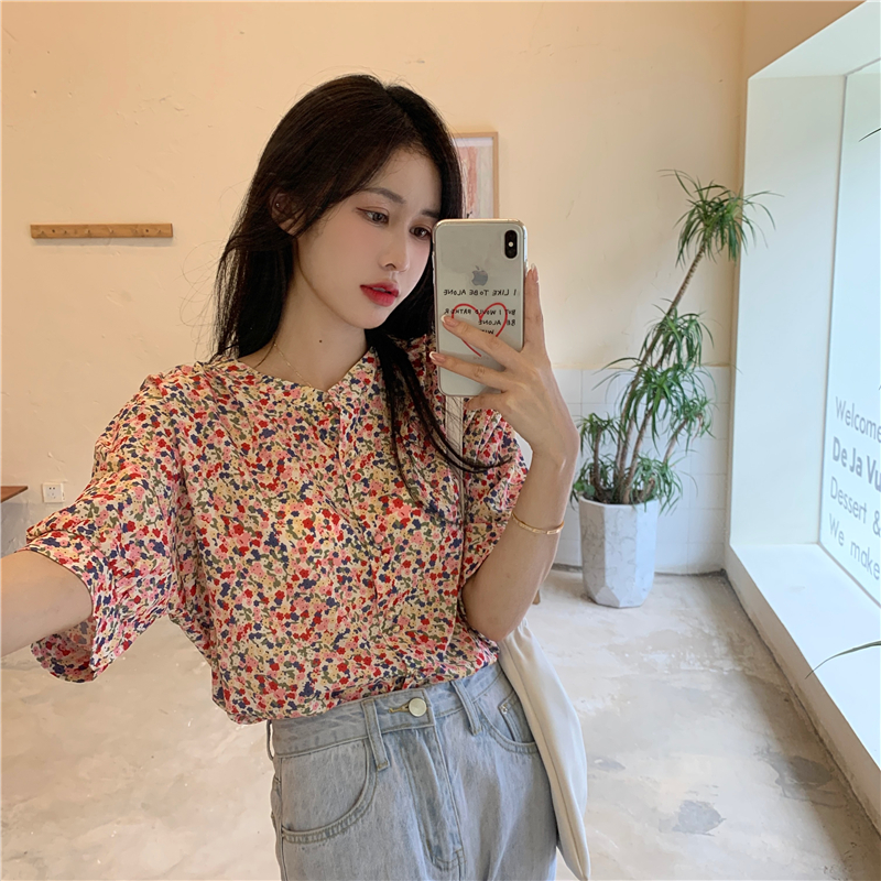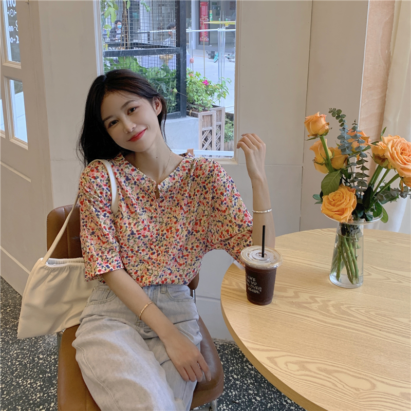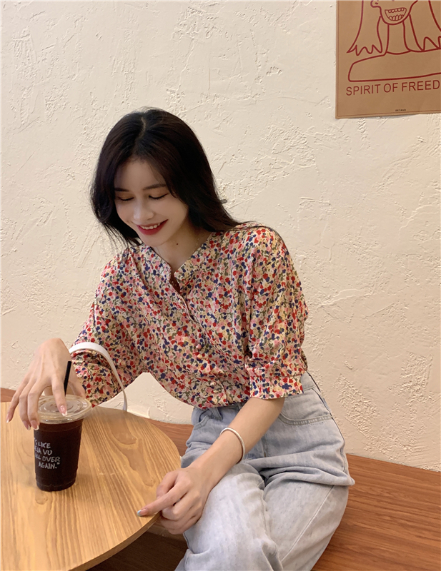 实拍实价~2021新款韩版春夏五分袖碎花衬衣 小心机锁骨