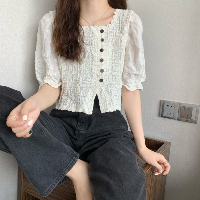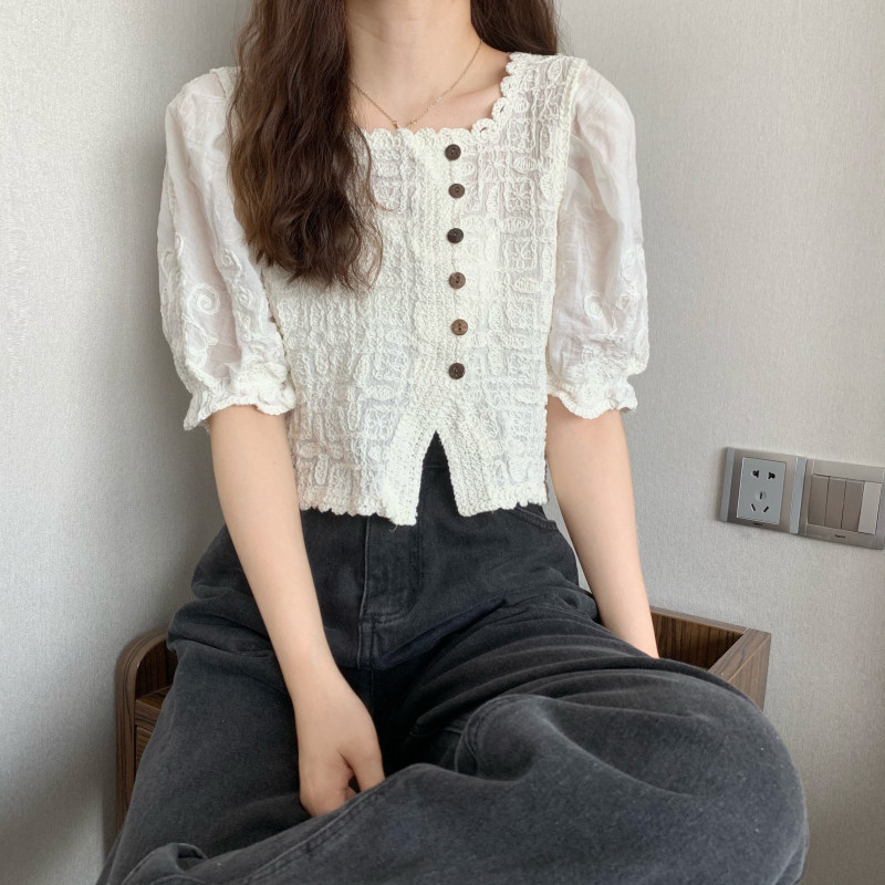 实拍实价 夏季新款设计感法式甜美钩花镂空衬衫女短袖上衣