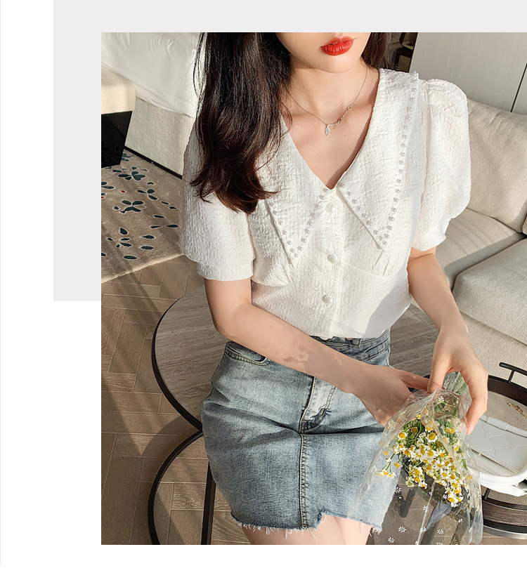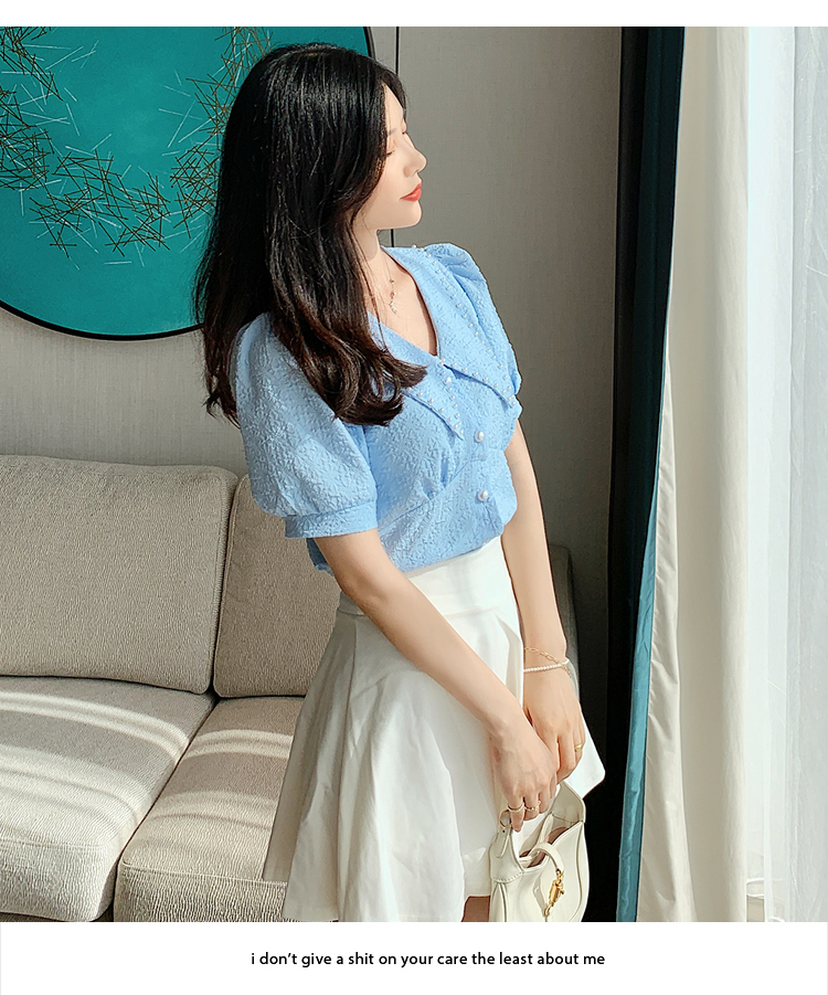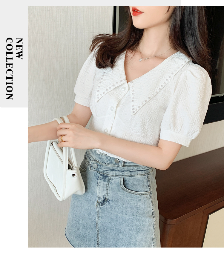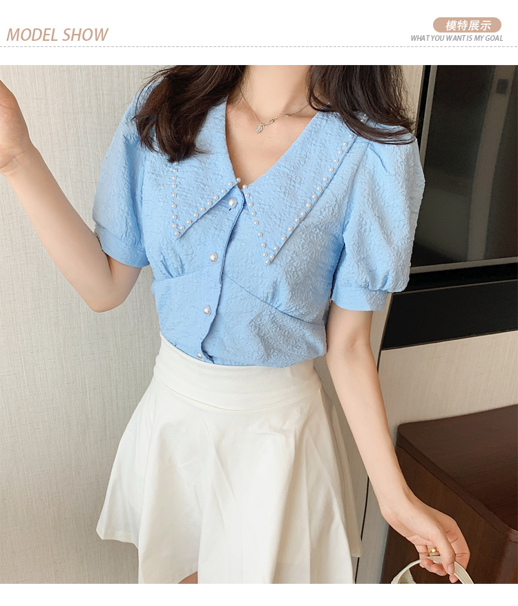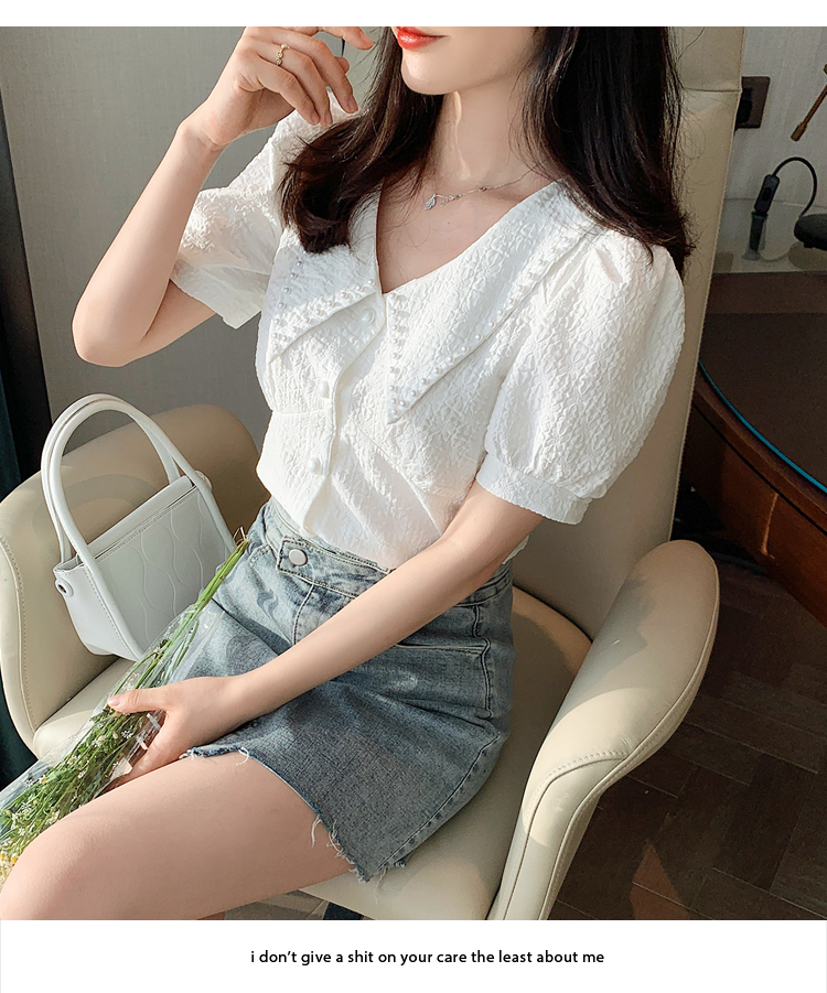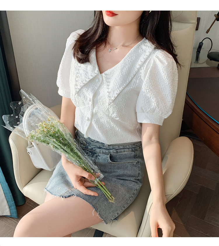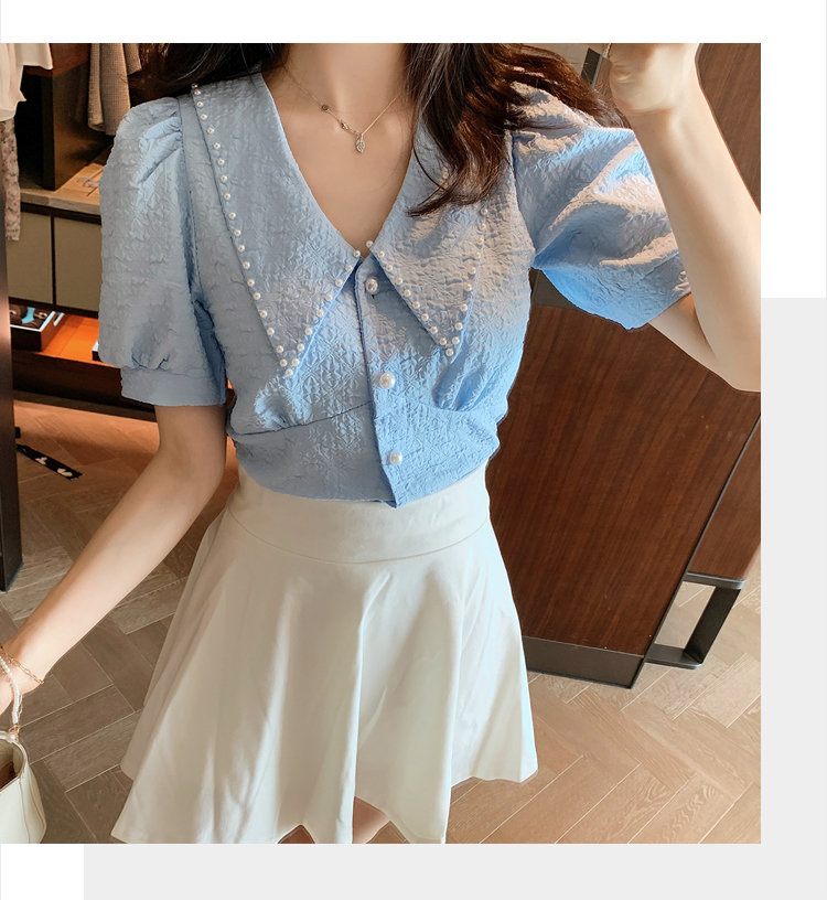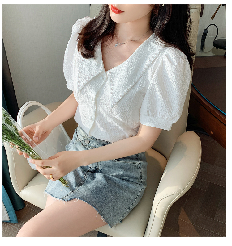 实拍2021夏娃娃领雪纺衫女设计感小众v领甜美减龄泡泡袖上衣