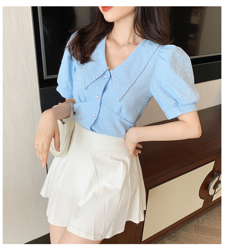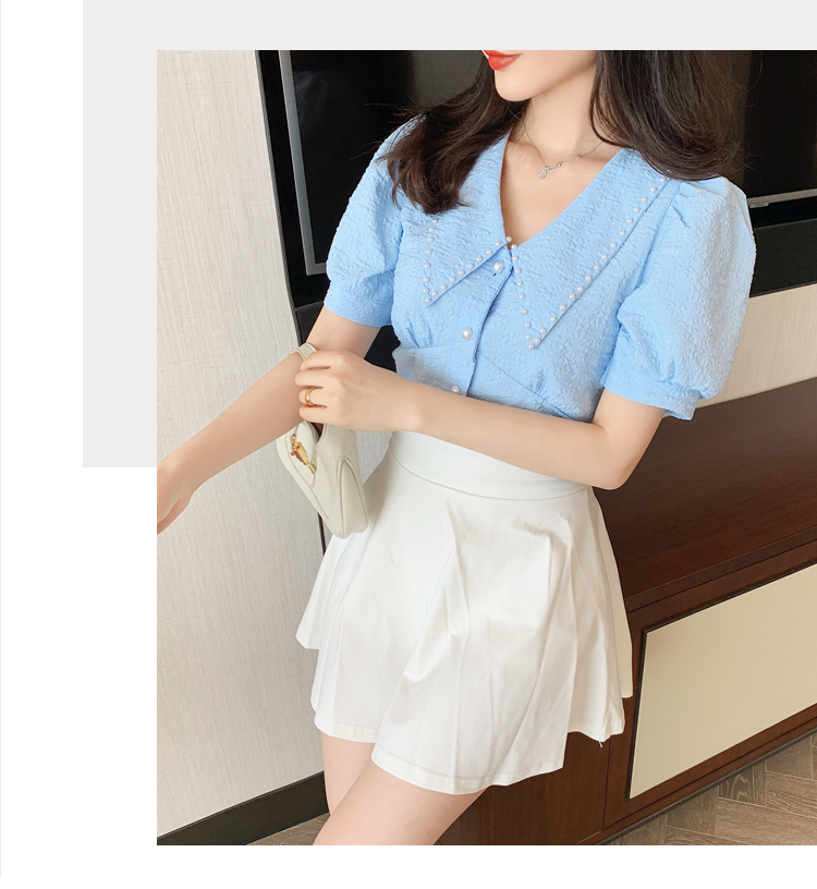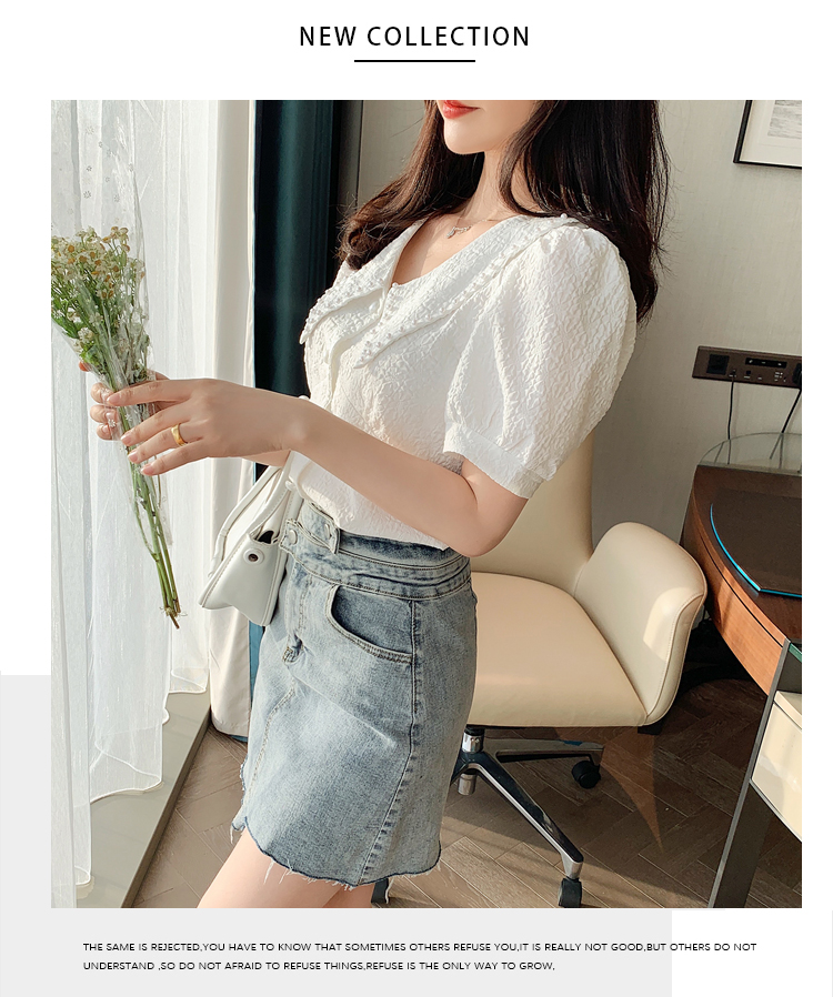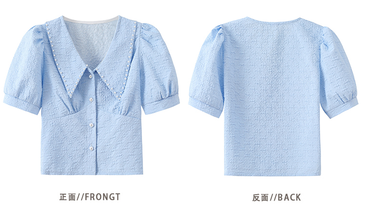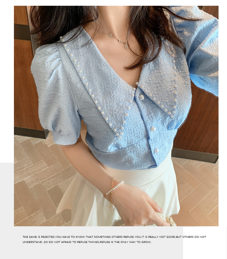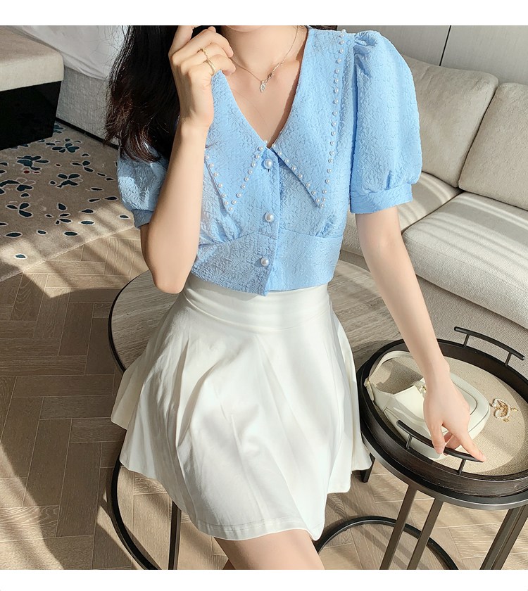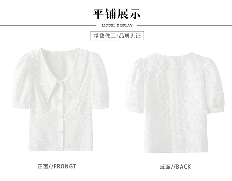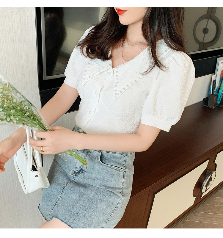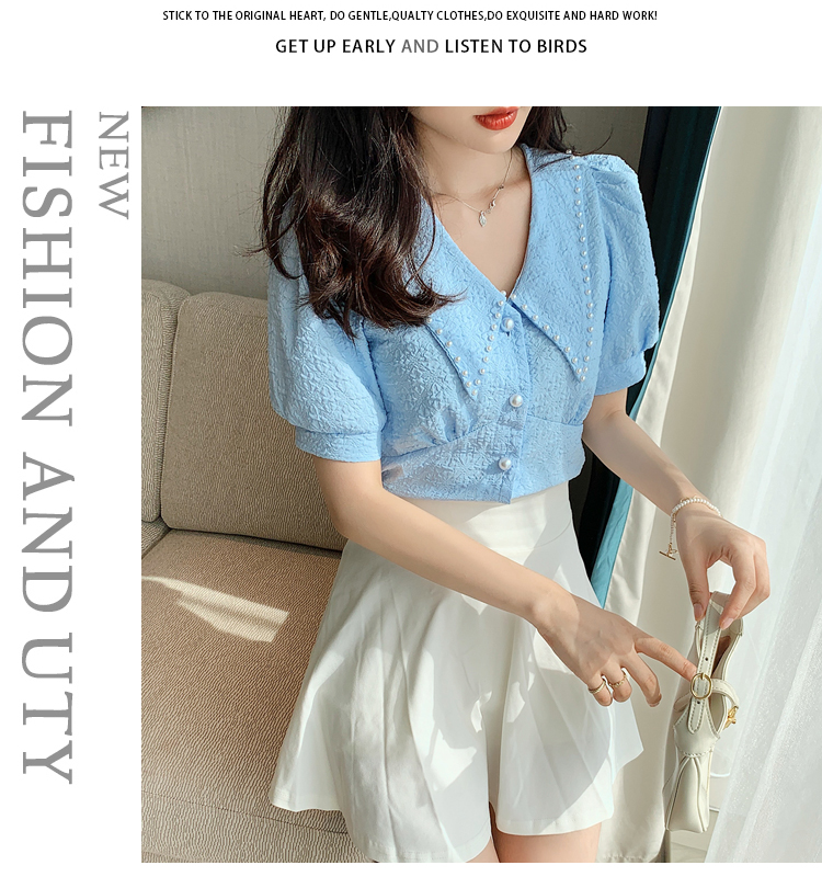 实拍2021夏娃娃领雪纺衫女设计感小众v领甜美减龄泡泡袖上衣