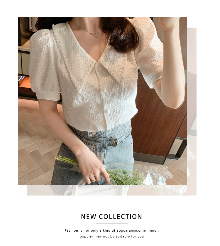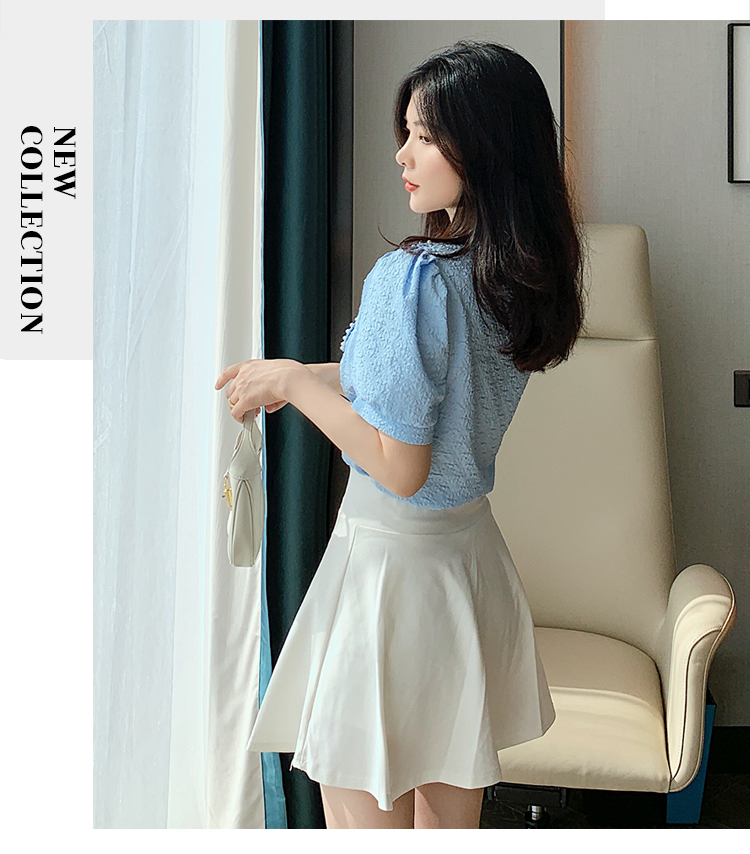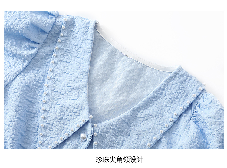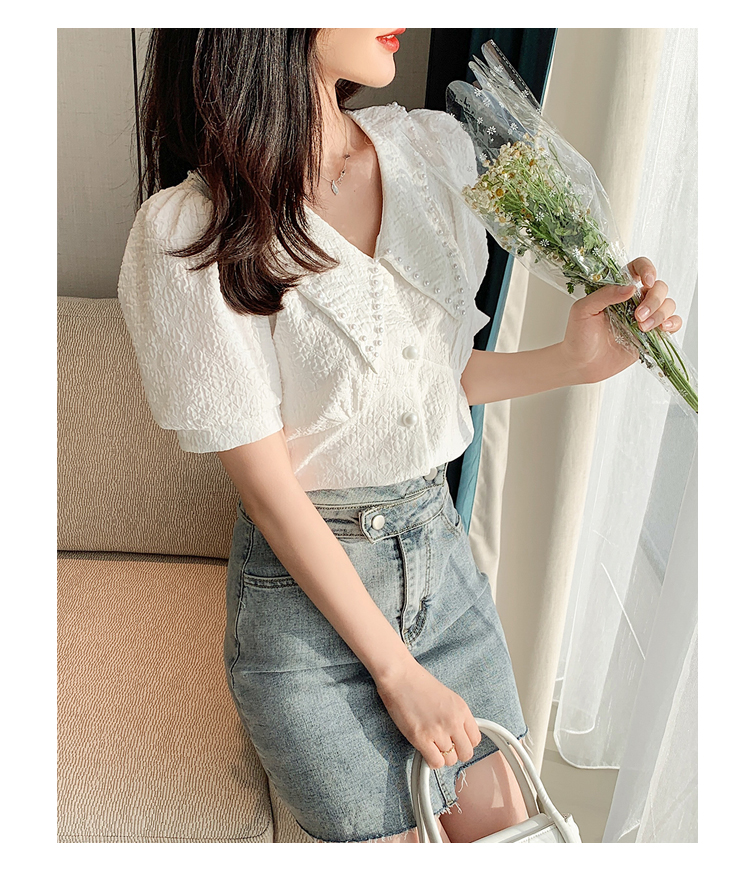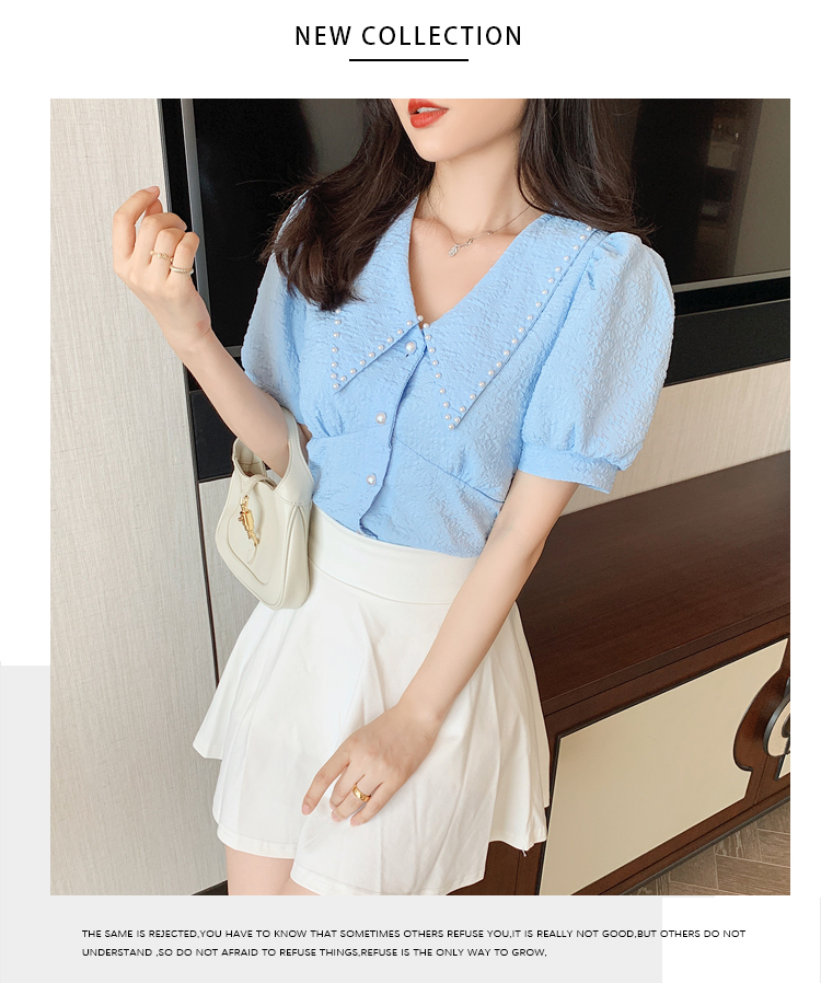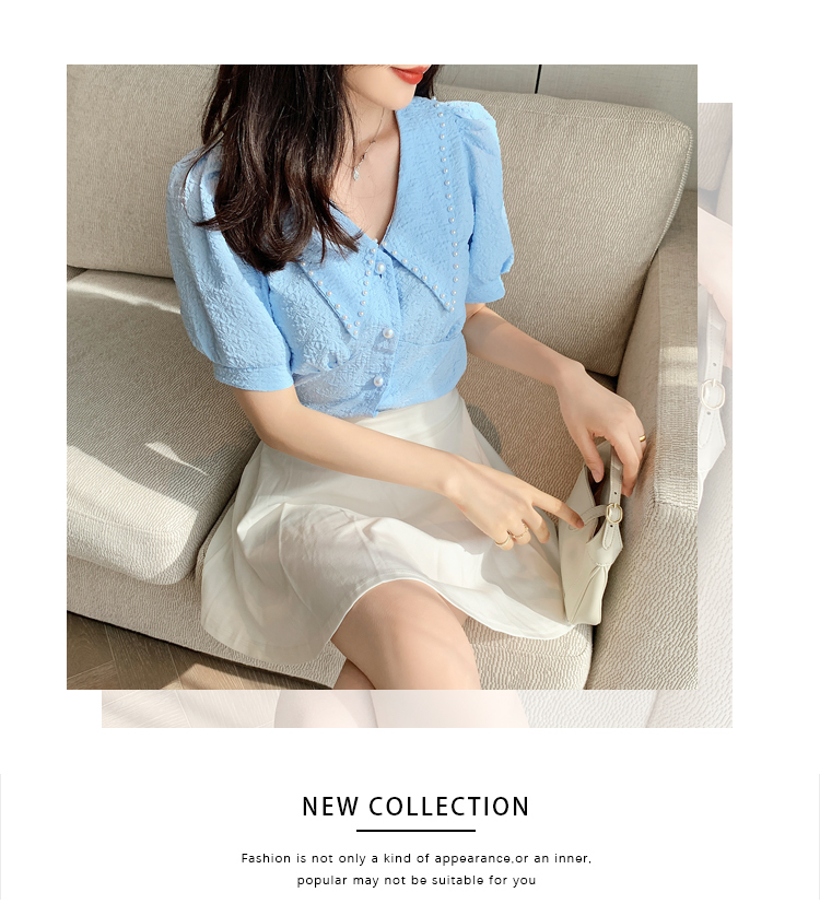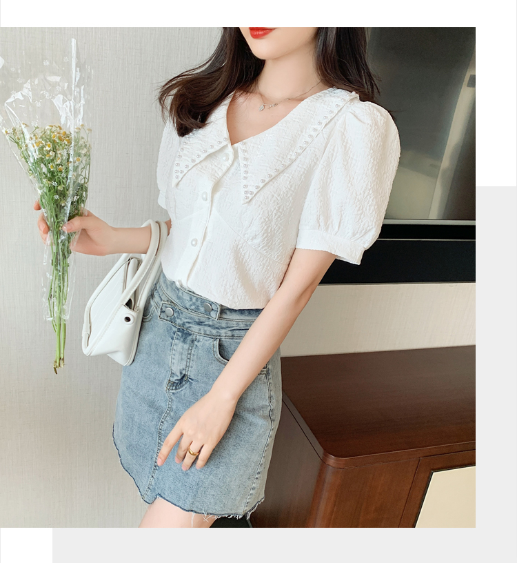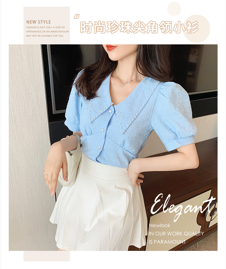实拍2021夏娃娃领雪纺衫女设计感小众v领甜美减龄泡泡袖上衣
