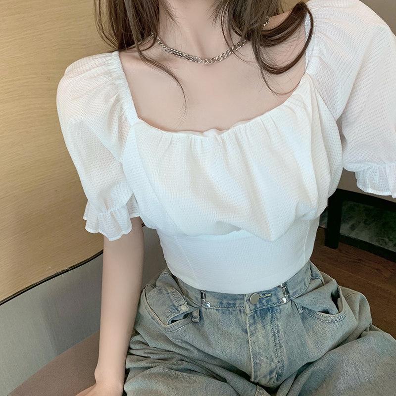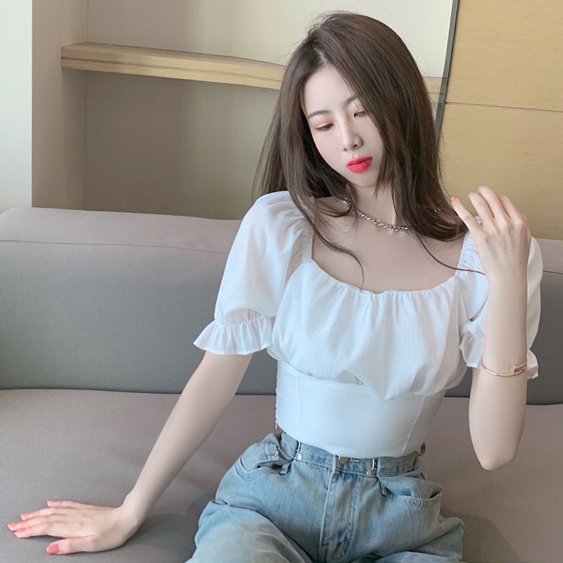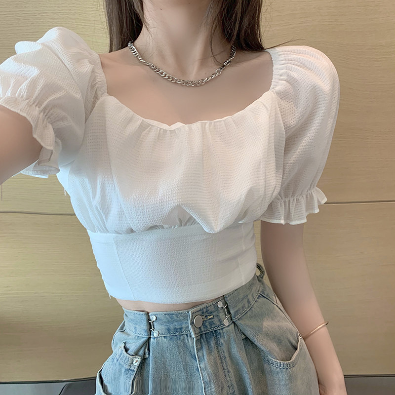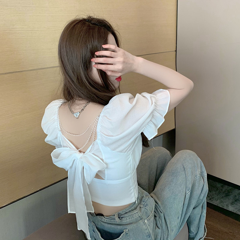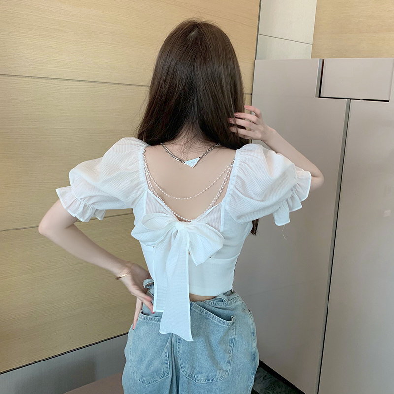 实拍实价~蝴蝶结露背衬衫女设计感小众短款方领泡泡袖上衣