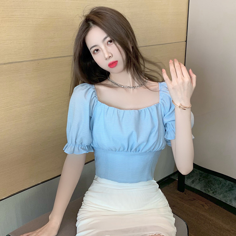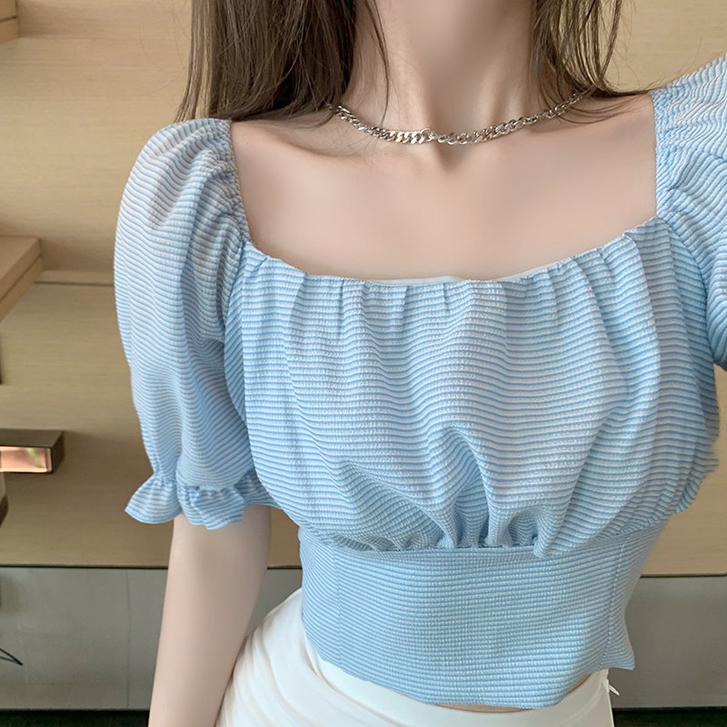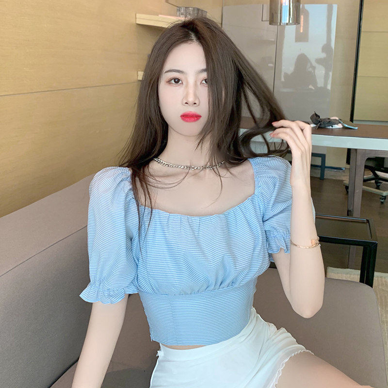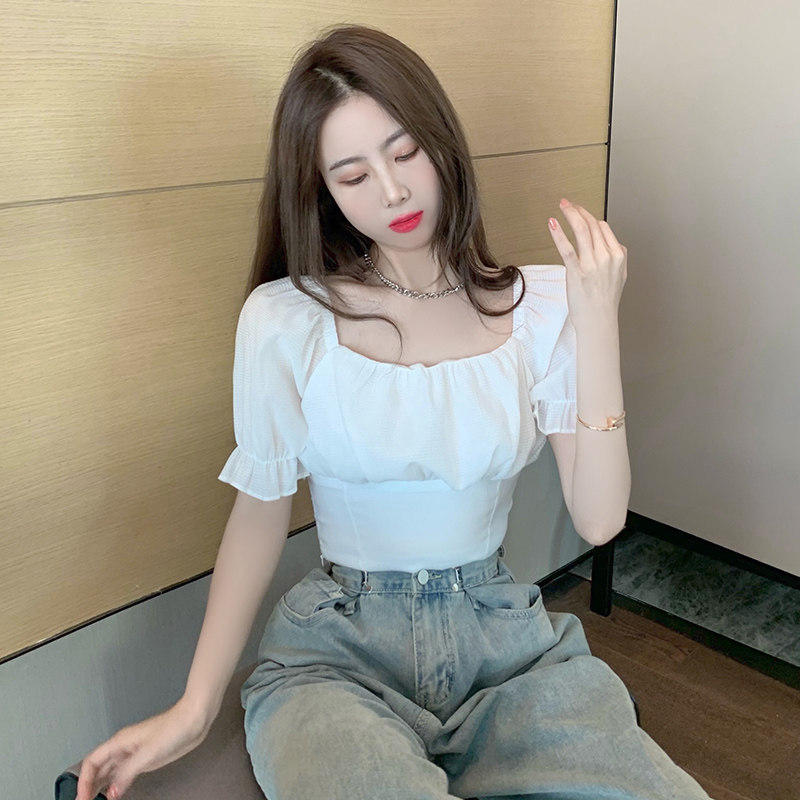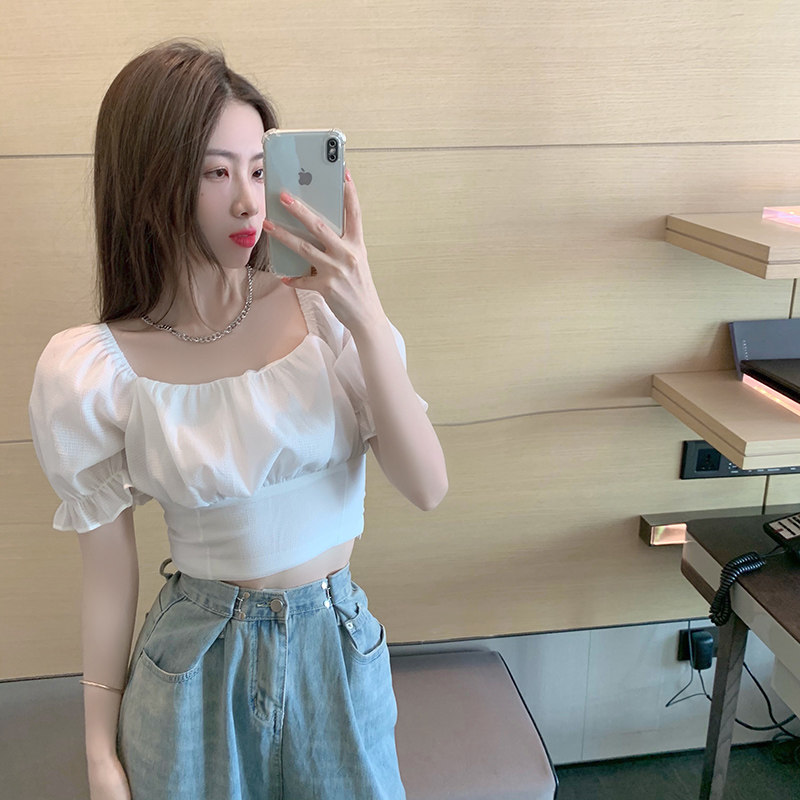 实拍实价~蝴蝶结露背衬衫女设计感小众短款方领泡泡袖上衣