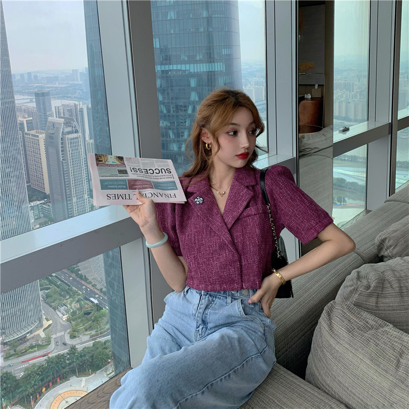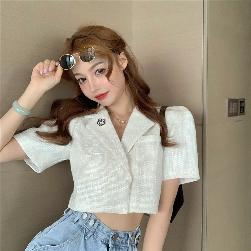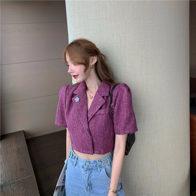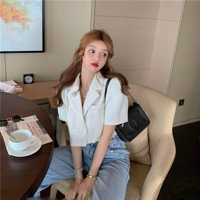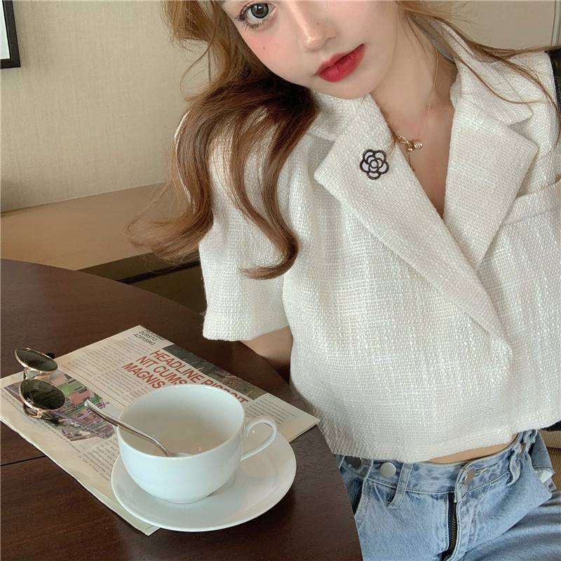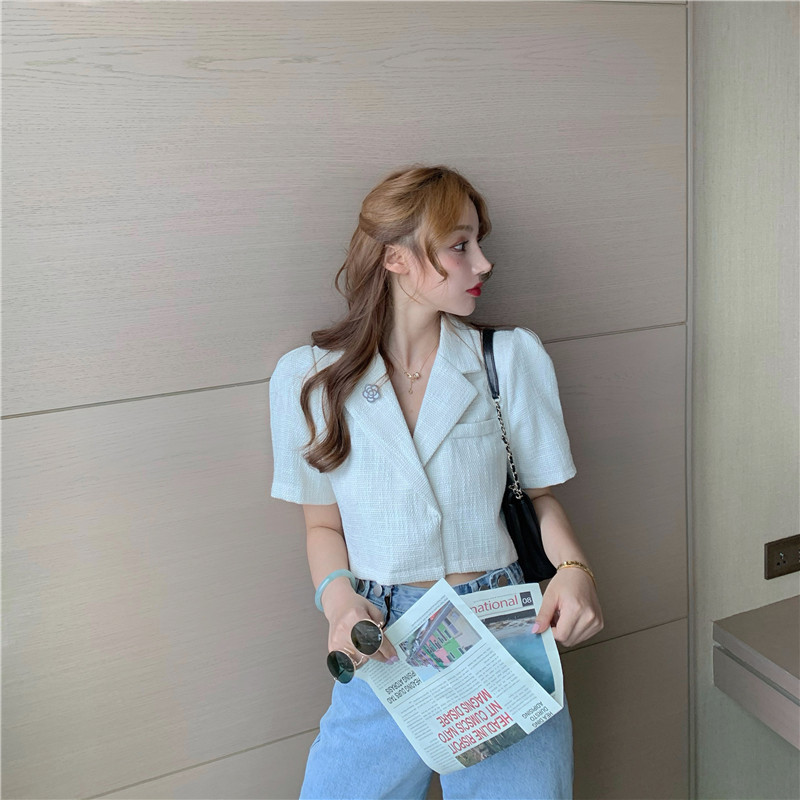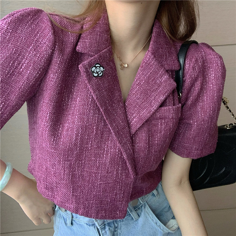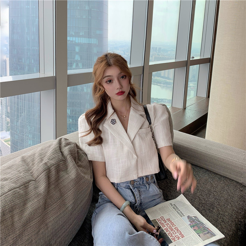 实拍实价 气质小西装女夏季薄款短外套短袖上衣配胸针