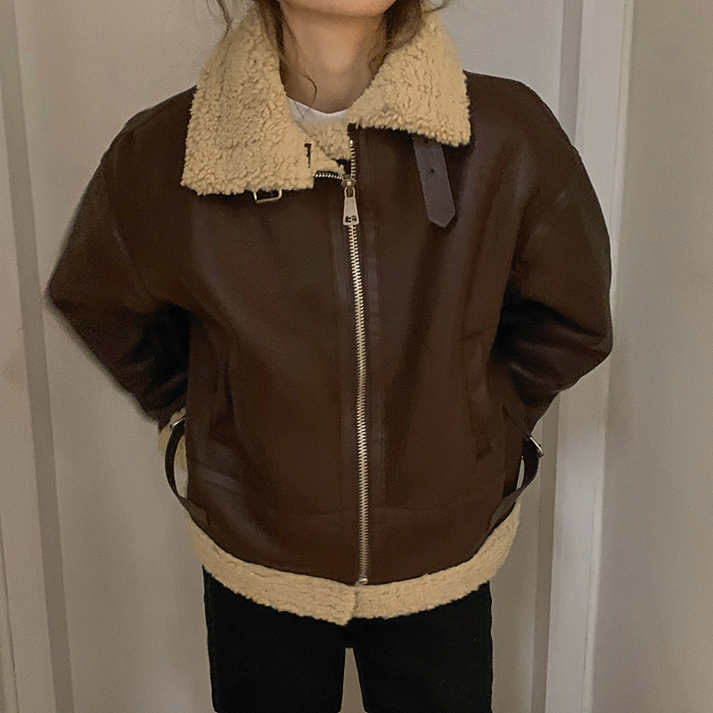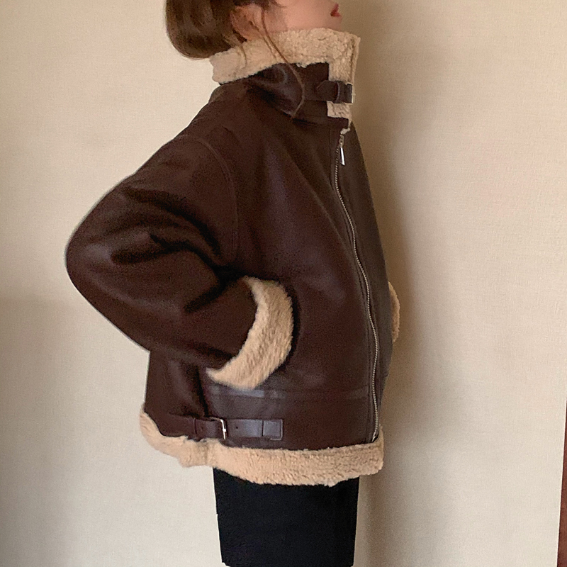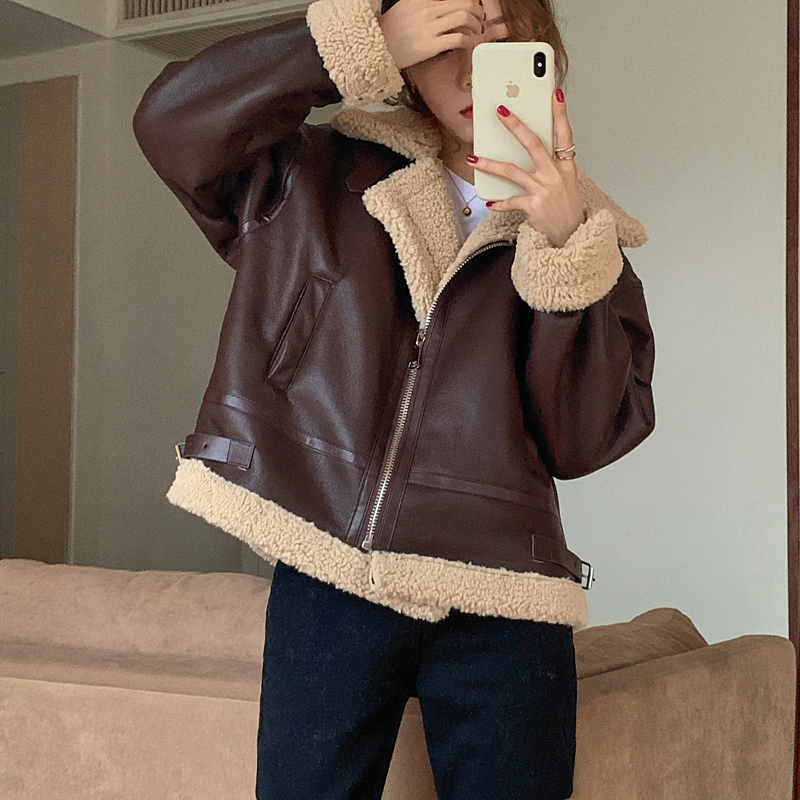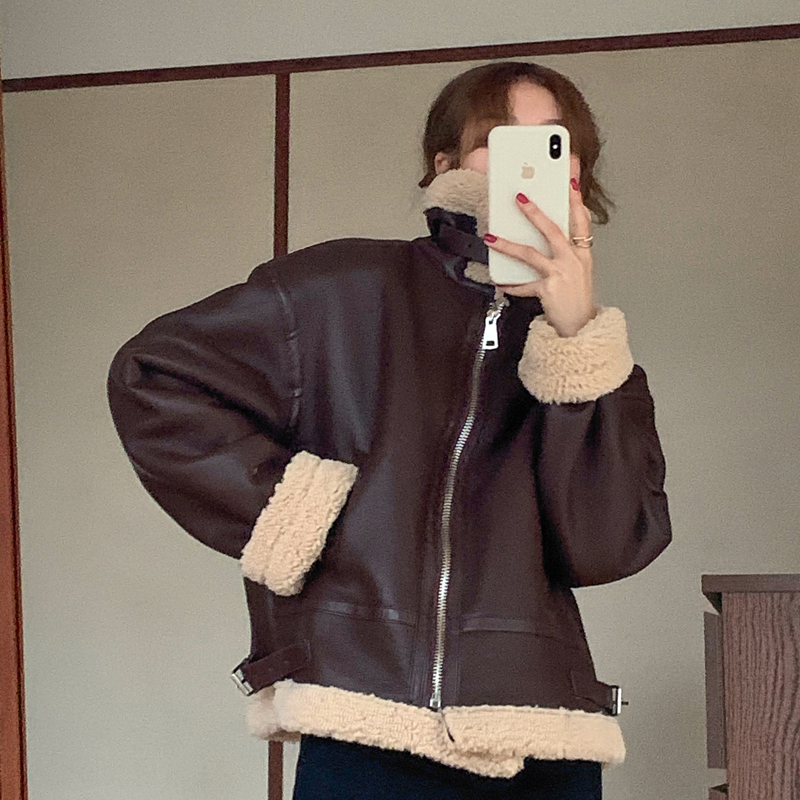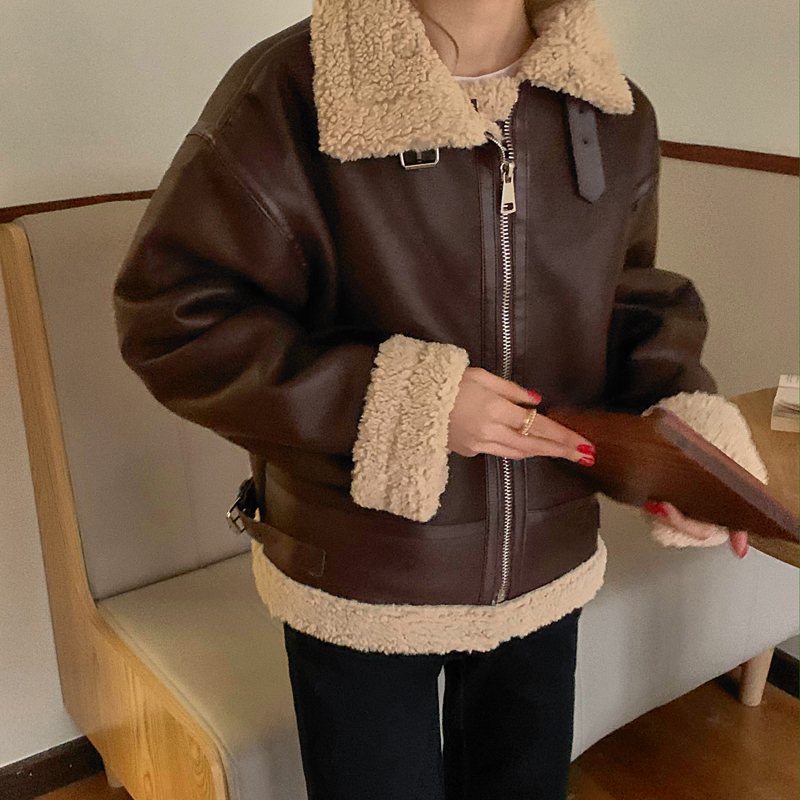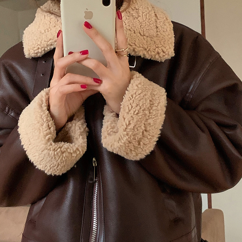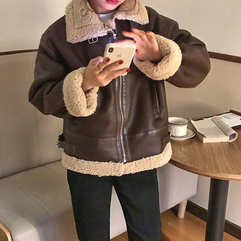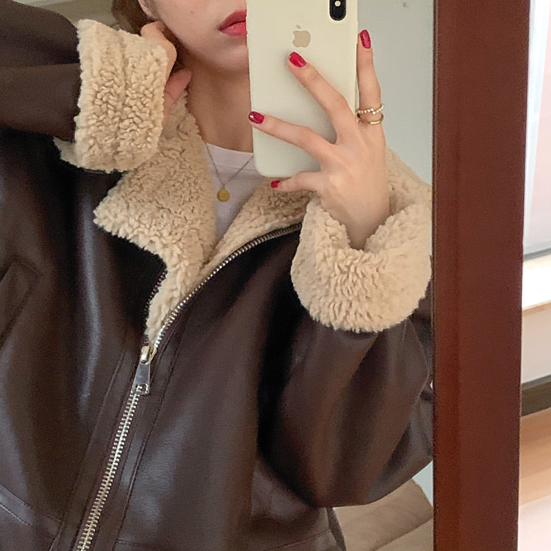 实价实拍三标齐韩版加厚皮毛一体羊羔毛保暖机车皮外套