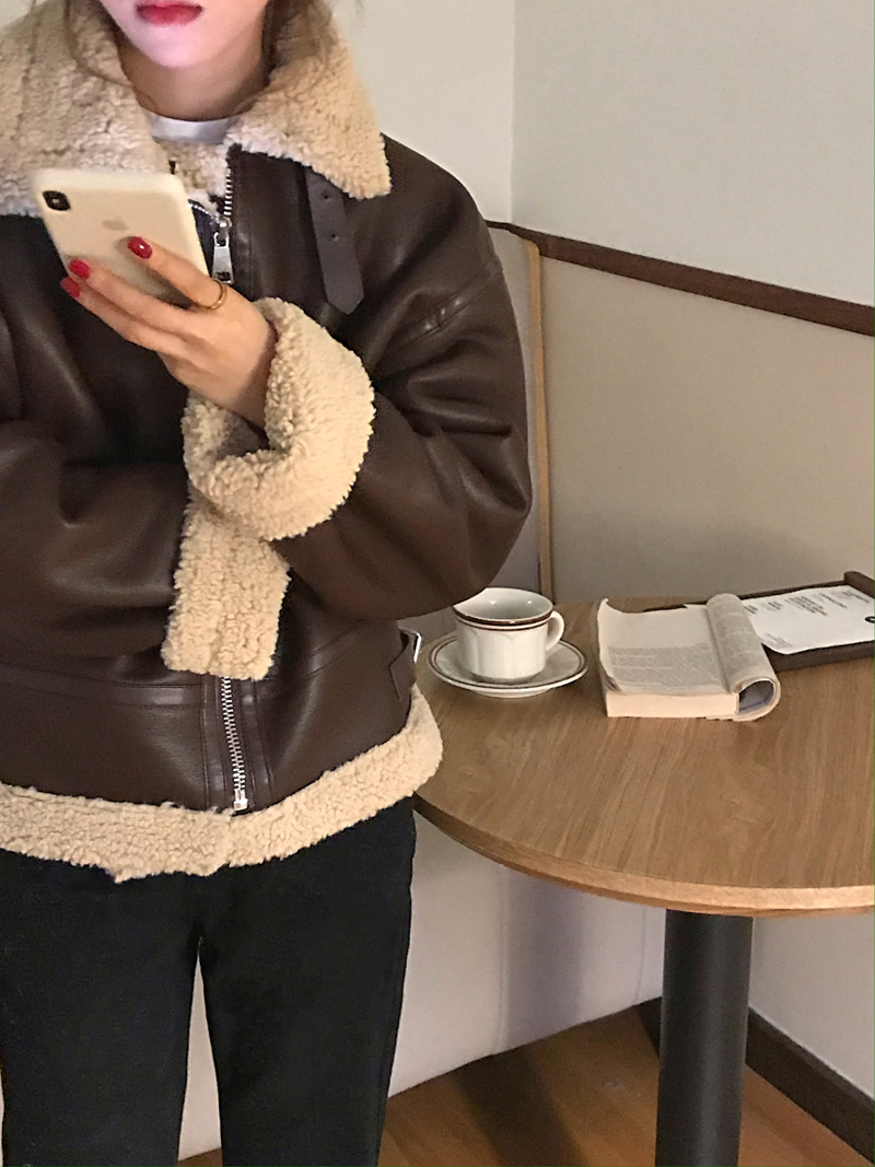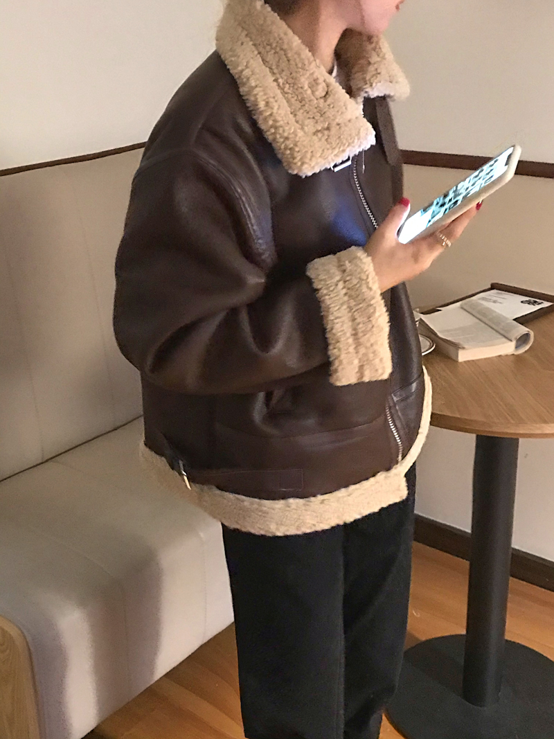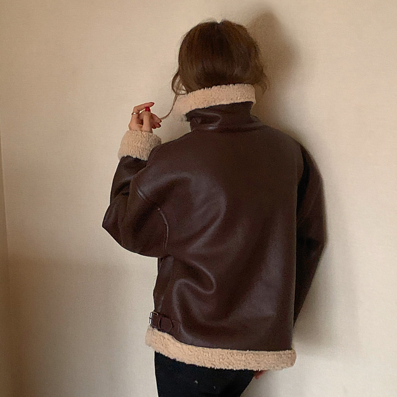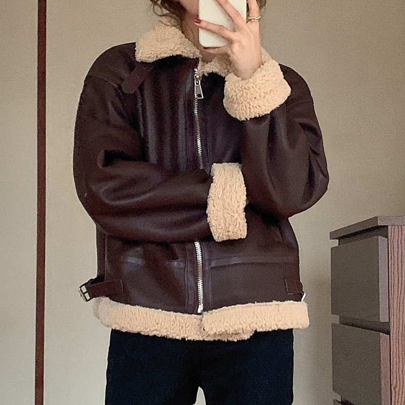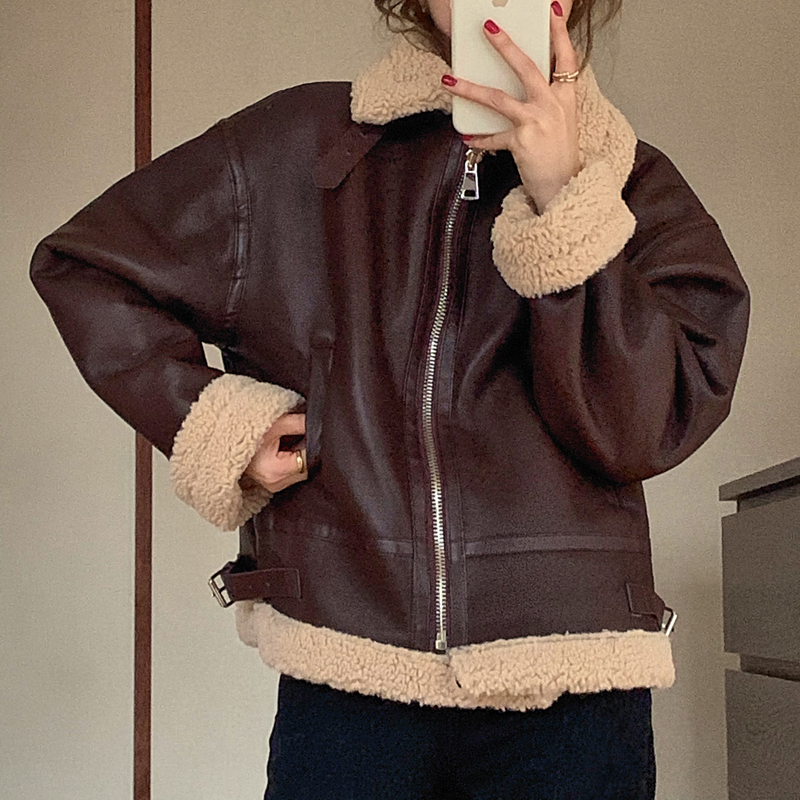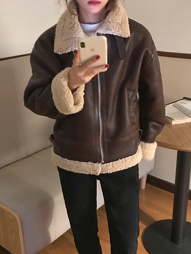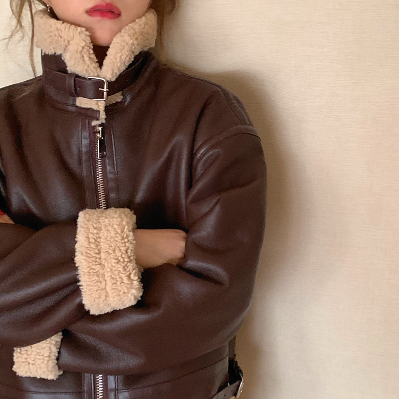 实价实拍三标齐韩版加厚皮毛一体羊羔毛保暖机车皮外套