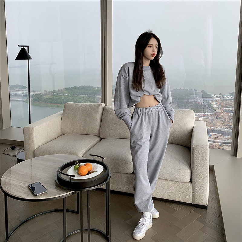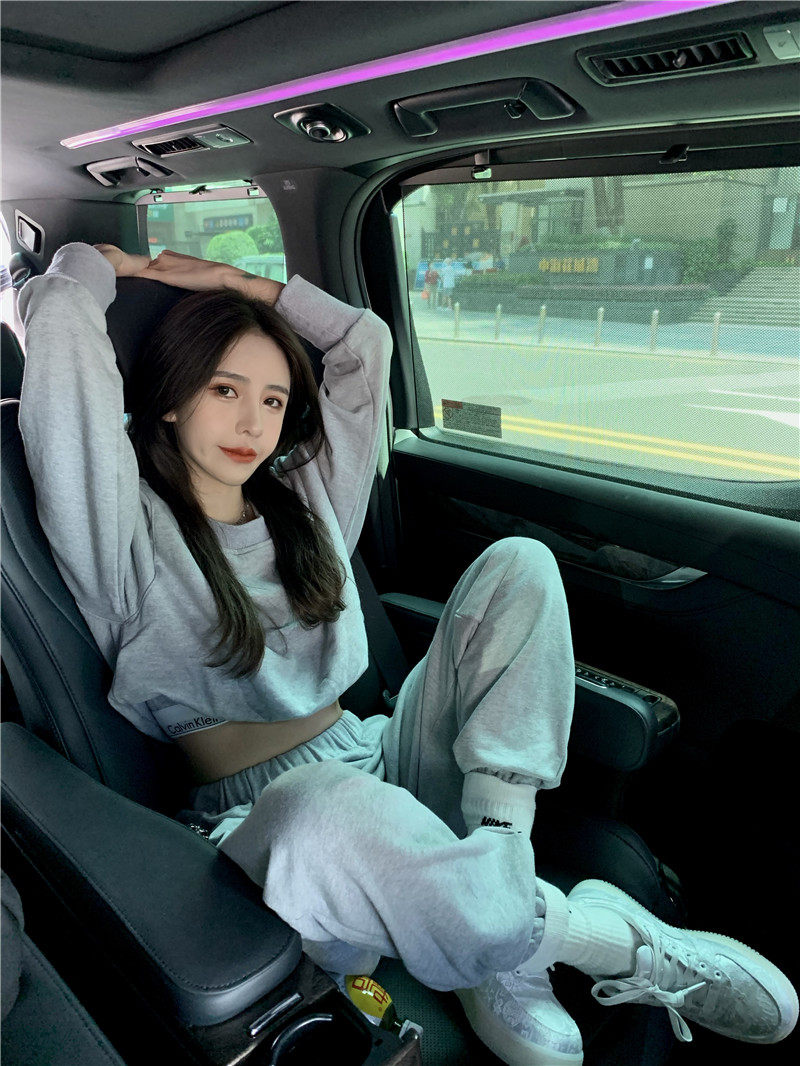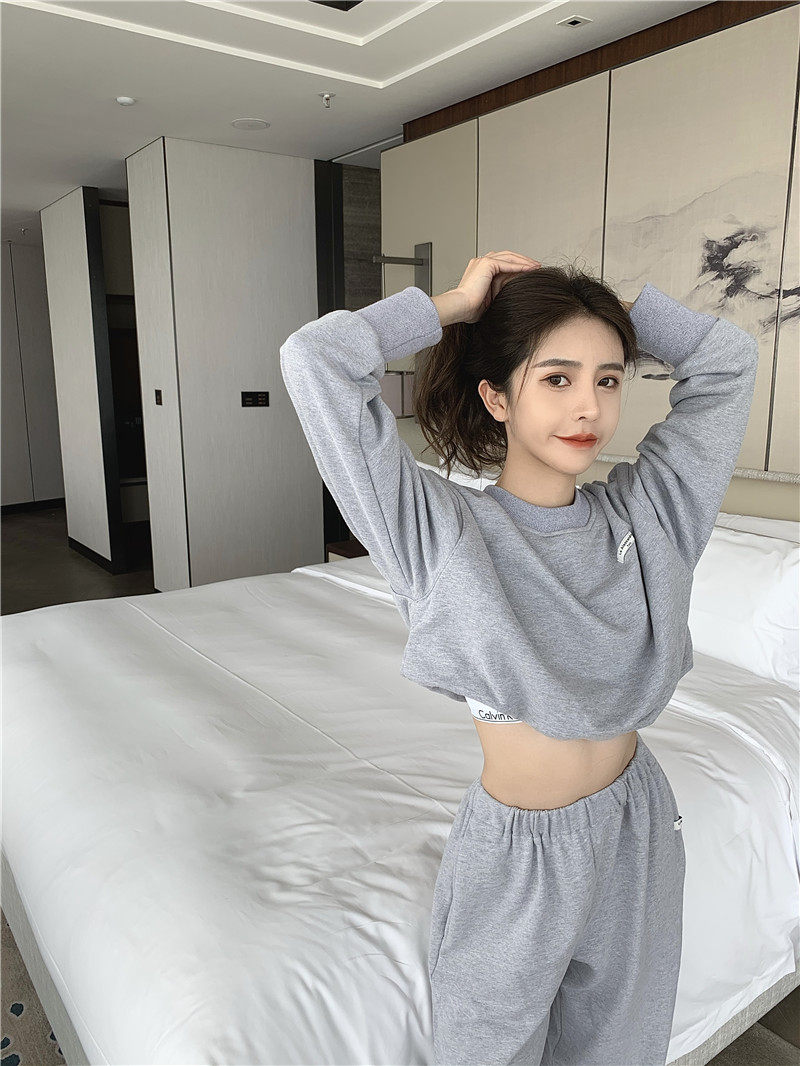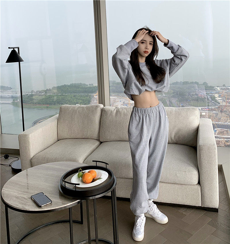 实拍实价小众时髦高腰露脐长袖卫衣束脚运动长裤灰色休闲套装